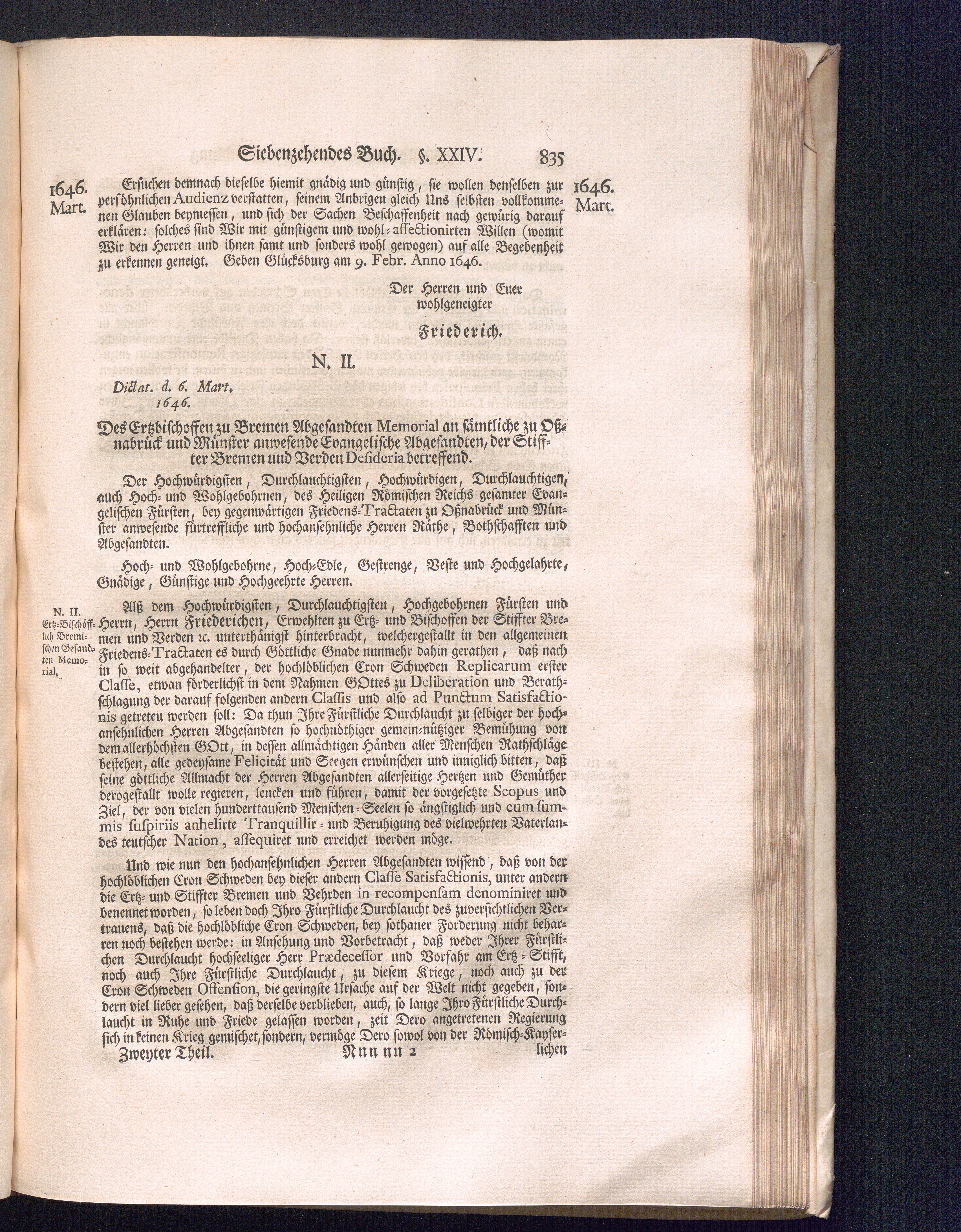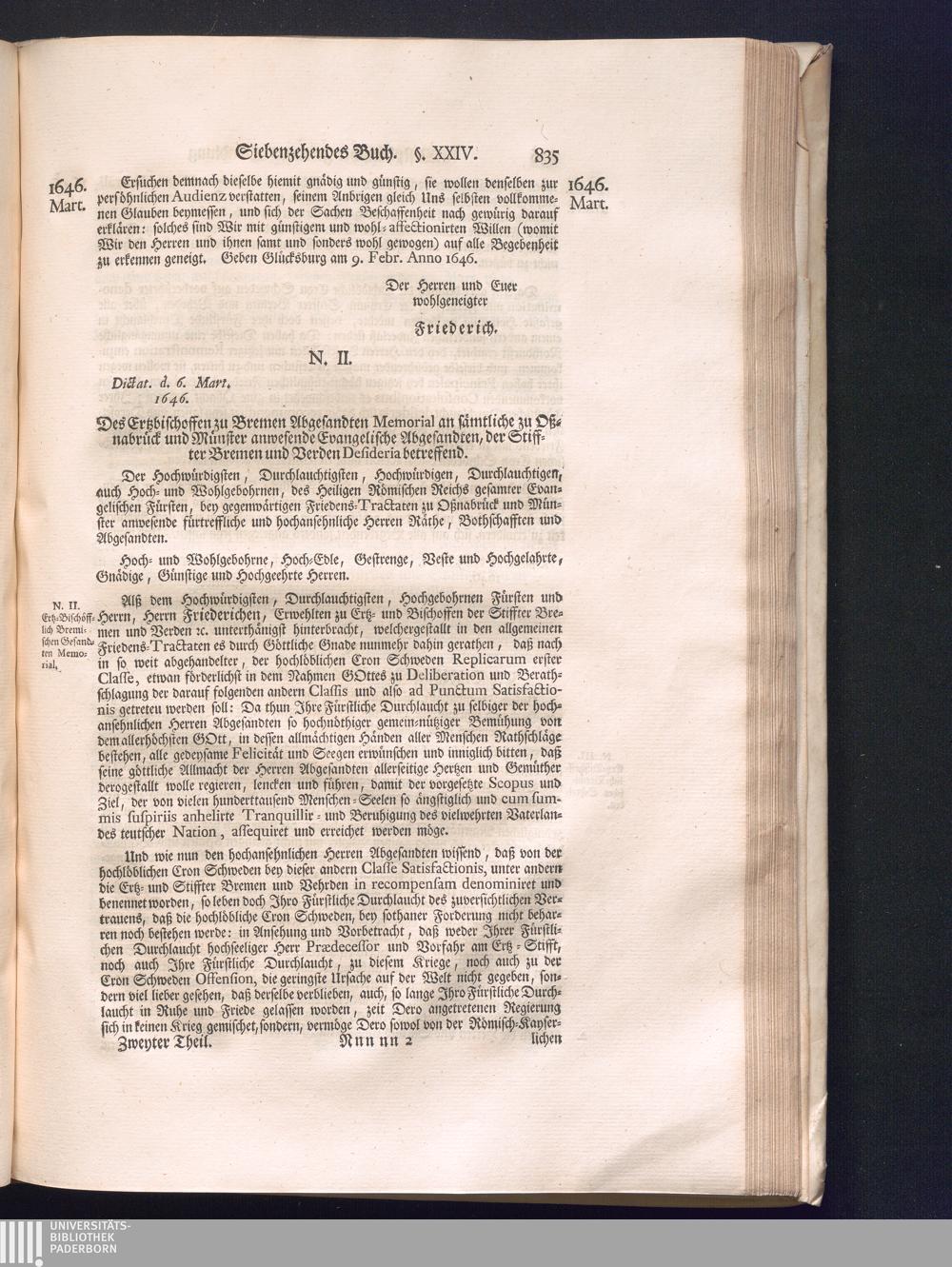 Zweyter Theil (1734) Worinnen enthalten, was vom Monath October Anno 1645. biß in den Monath Martium Ann. 1646. zwischen Jhro Römisch-Kayserlichen Majestät, dann den Beyden Cronen Franckreich und Schweden, ingleichen des Heiligen Römischen Reichs Chur-Fürsten, Fürsten und Ständen, zu Oßnabrück und Münster gehandelt worden