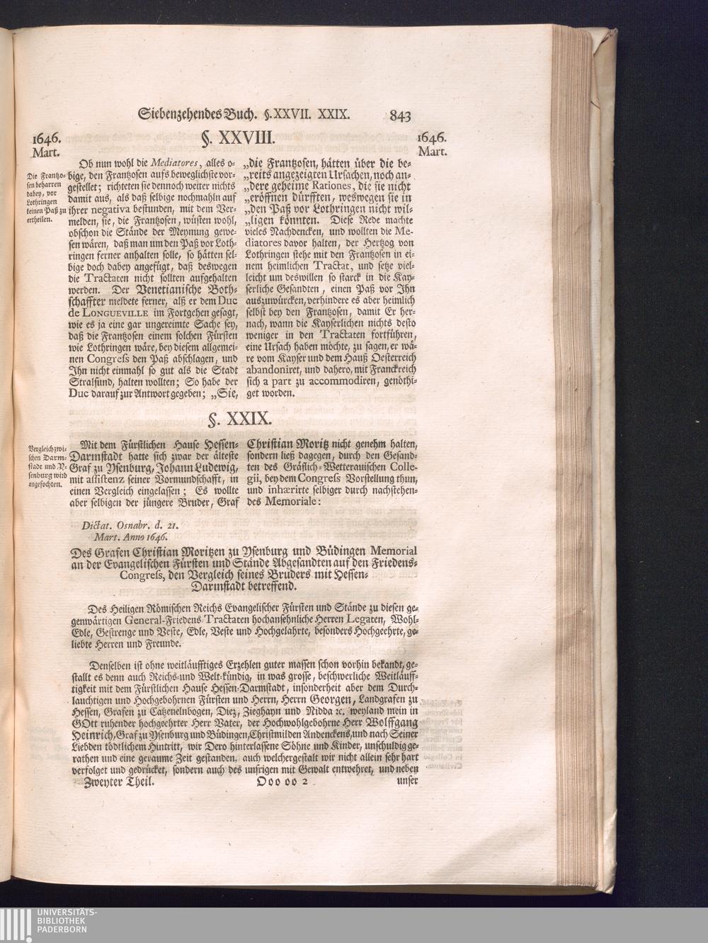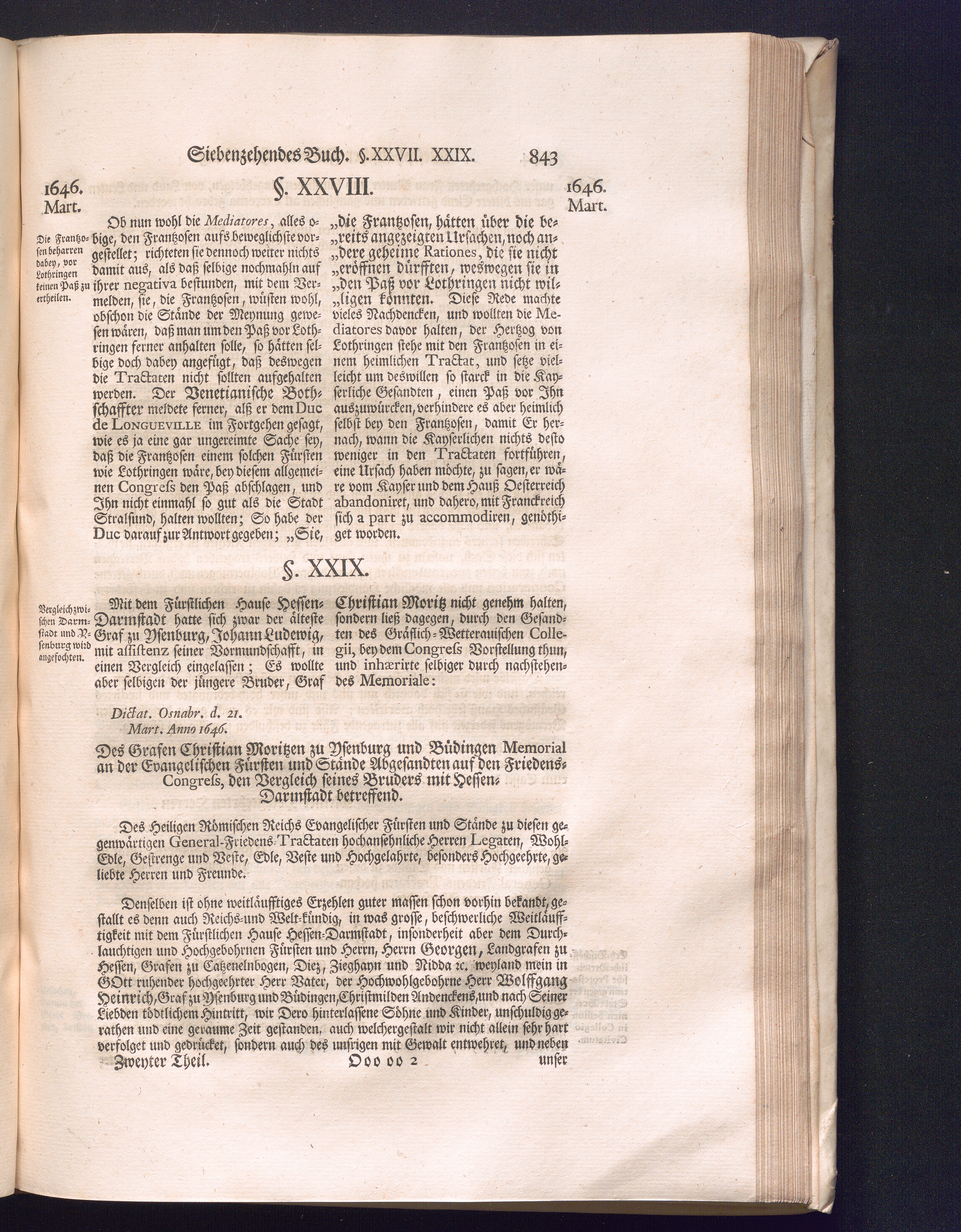Zweyter Theil (1734) Worinnen enthalten, was vom Monath October Anno 1645. biß in den Monath Martium Ann. 1646. zwischen Jhro Römisch-Kayserlichen Majestät, dann den Beyden Cronen Franckreich und Schweden, ingleichen des Heiligen Römischen Reichs Chur-Fürsten, Fürsten und Ständen, zu Oßnabrück und Münster gehandelt worden