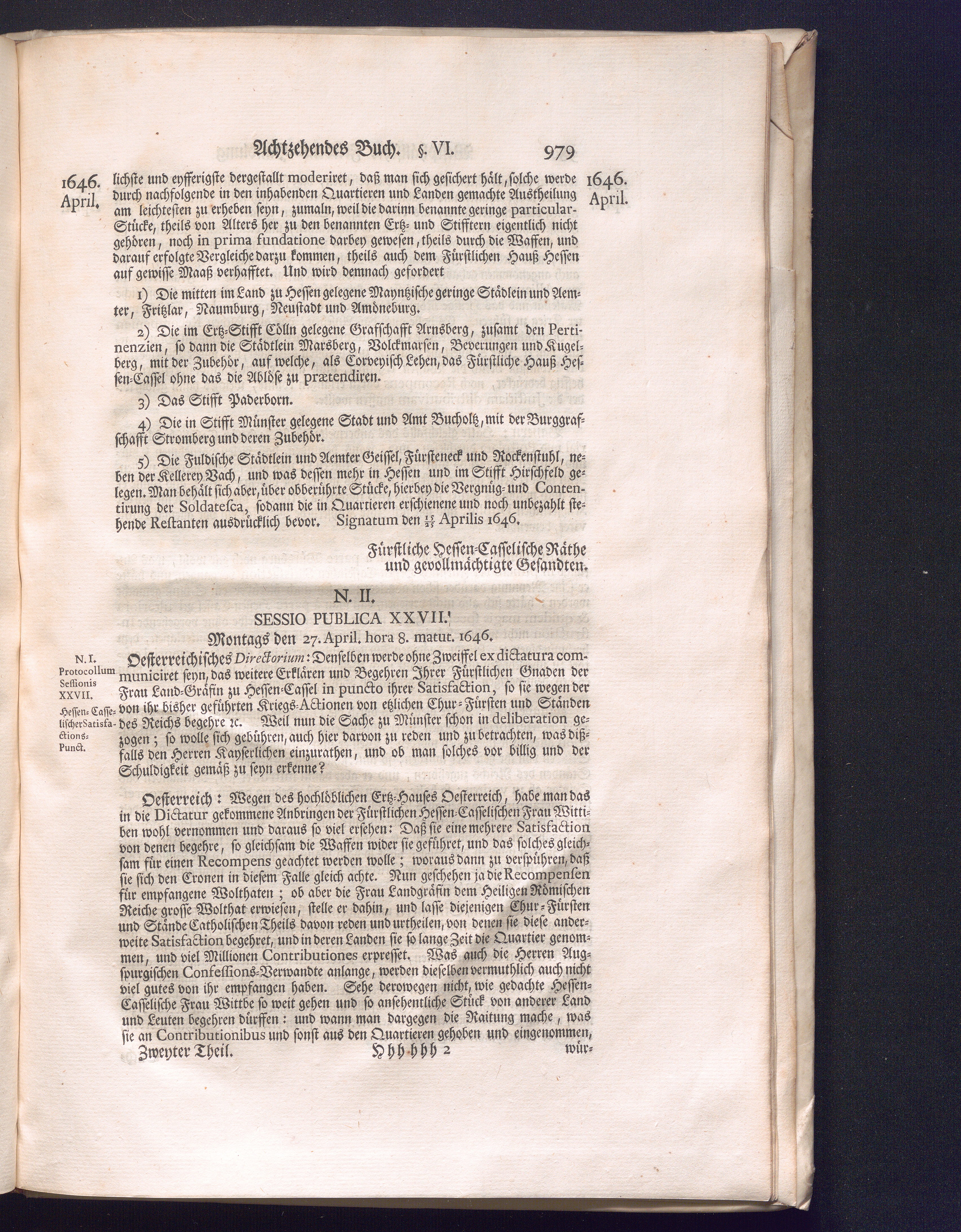 Zweyter Theil (1734) Worinnen enthalten, was vom Monath October Anno 1645. biß in den Monath Martium Ann. 1646. zwischen Jhro Römisch-Kayserlichen Majestät, dann den Beyden Cronen Franckreich und Schweden, ingleichen des Heiligen Römischen Reichs Chur-Fürsten, Fürsten und Ständen, zu Oßnabrück und Münster gehandelt worden