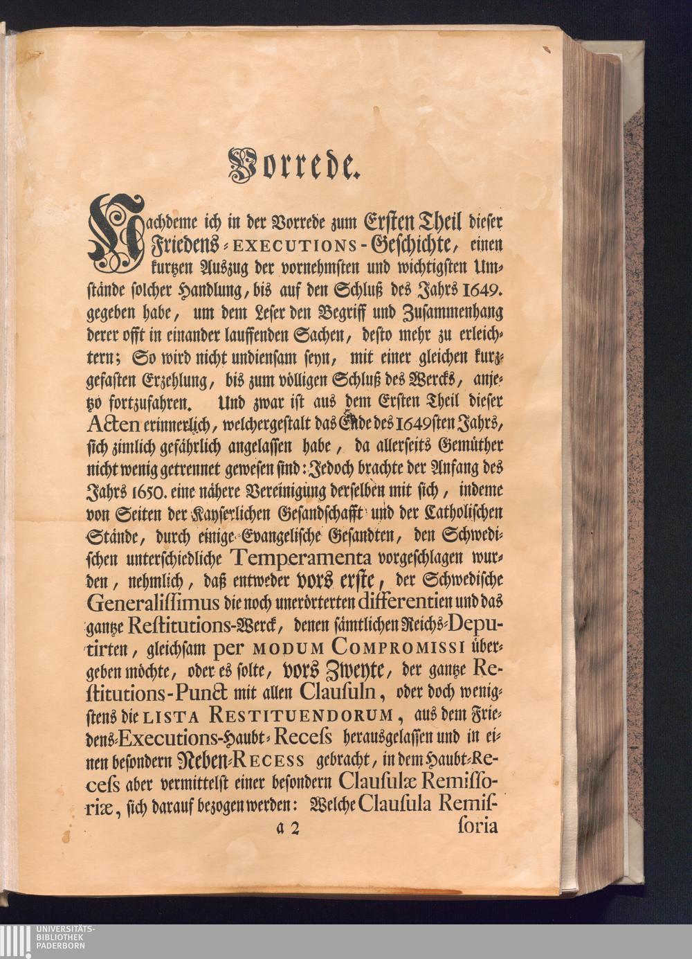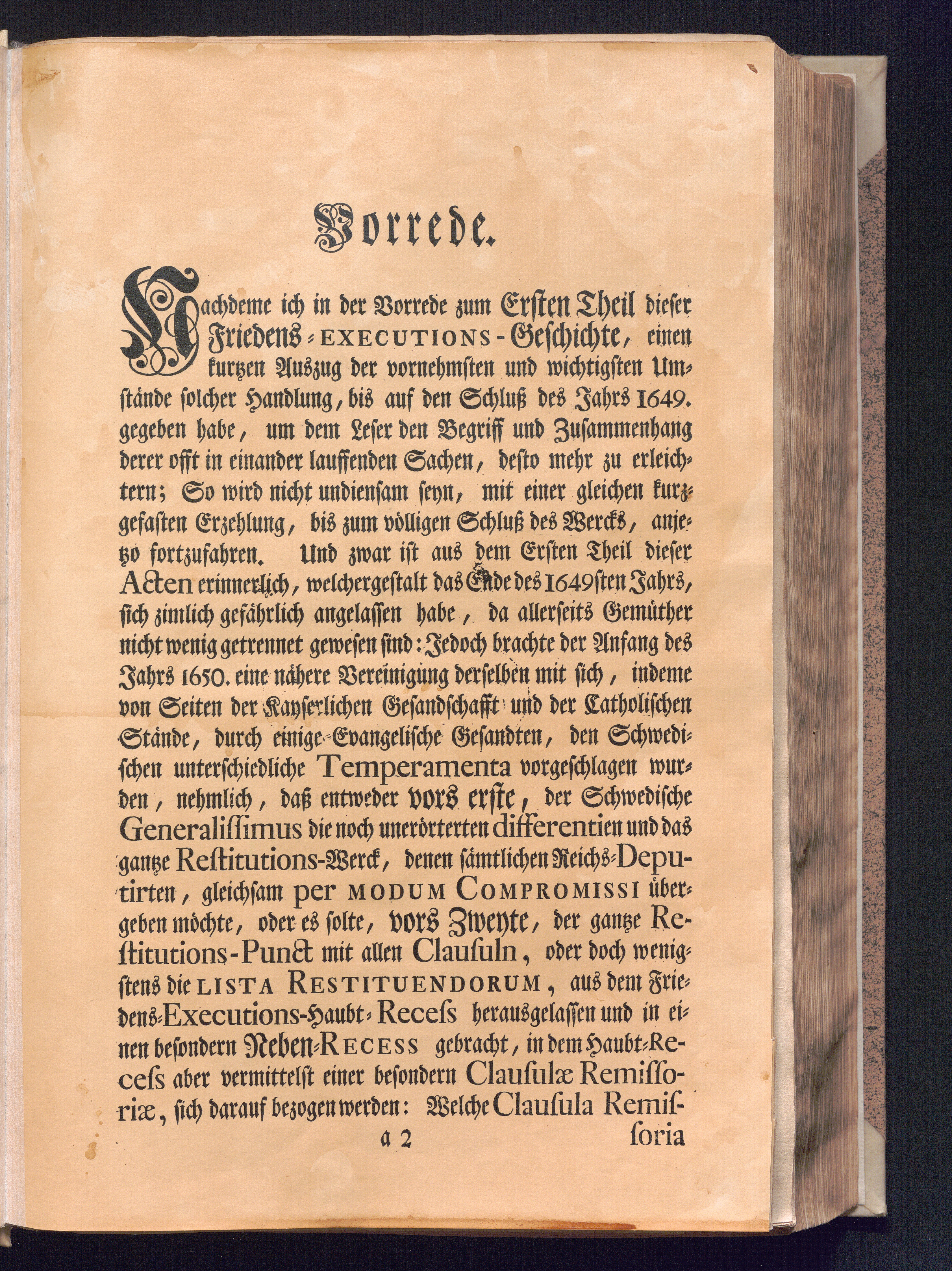 Zweyter und letzter Theil (1737) Worinnen enthalten, wie und welchergestalt die würckliche Vollziehung des Westphälischen Friedens, sowohl in puncto Exauctorationis Militæ und Evacuationis Locorum, als auch und vornehmlich in dem hochwichtigen puncto Restitutionis ex Capite Amnestiæ & Gravaminum, biß zum völligen Schluß des Congressus, Anno 1651, geschehen ist, in einer ausführlichen Historischen Erzehlung, mit beygefügten authentischen Urkunden, auch einem vollständigen Register