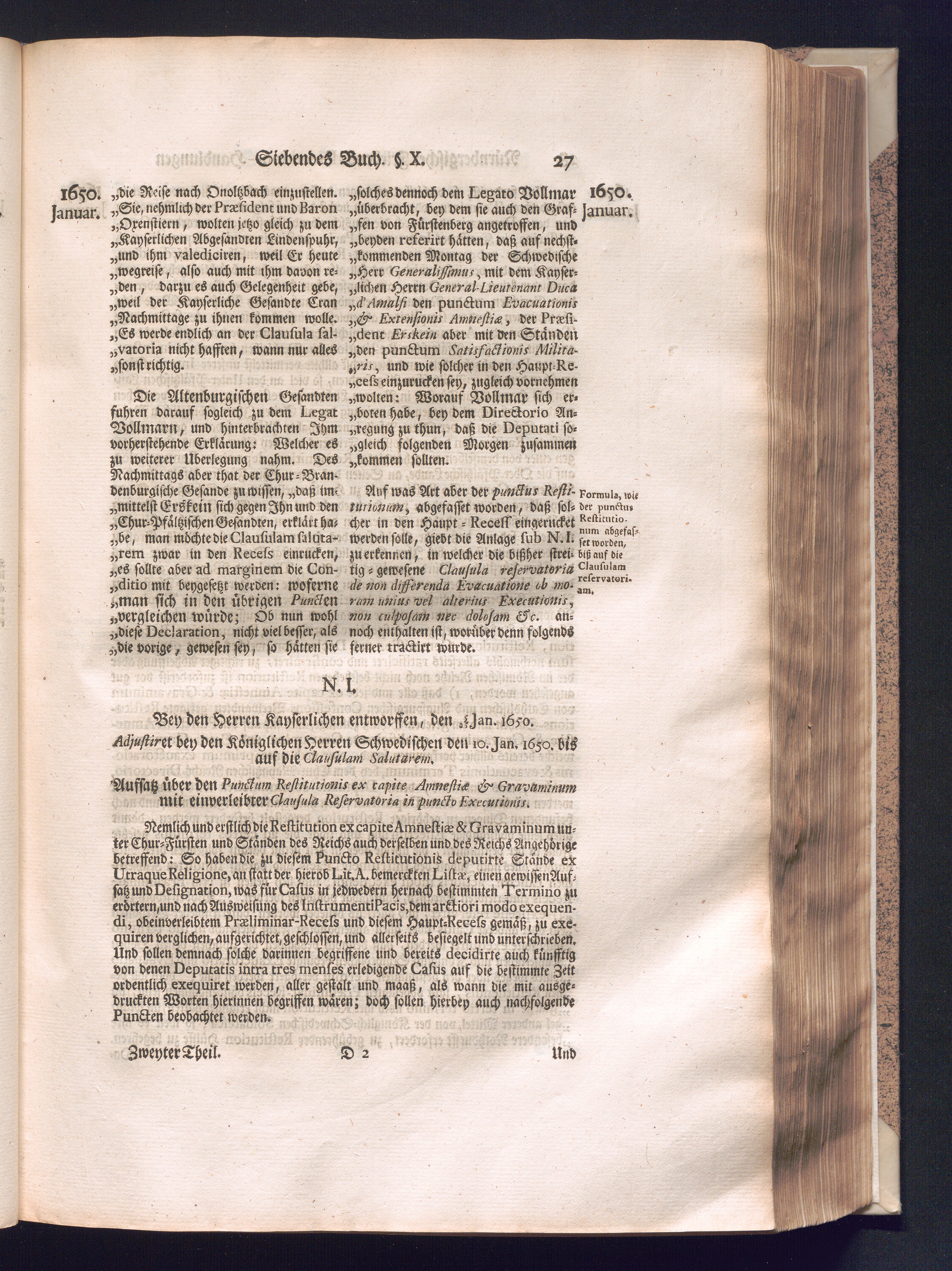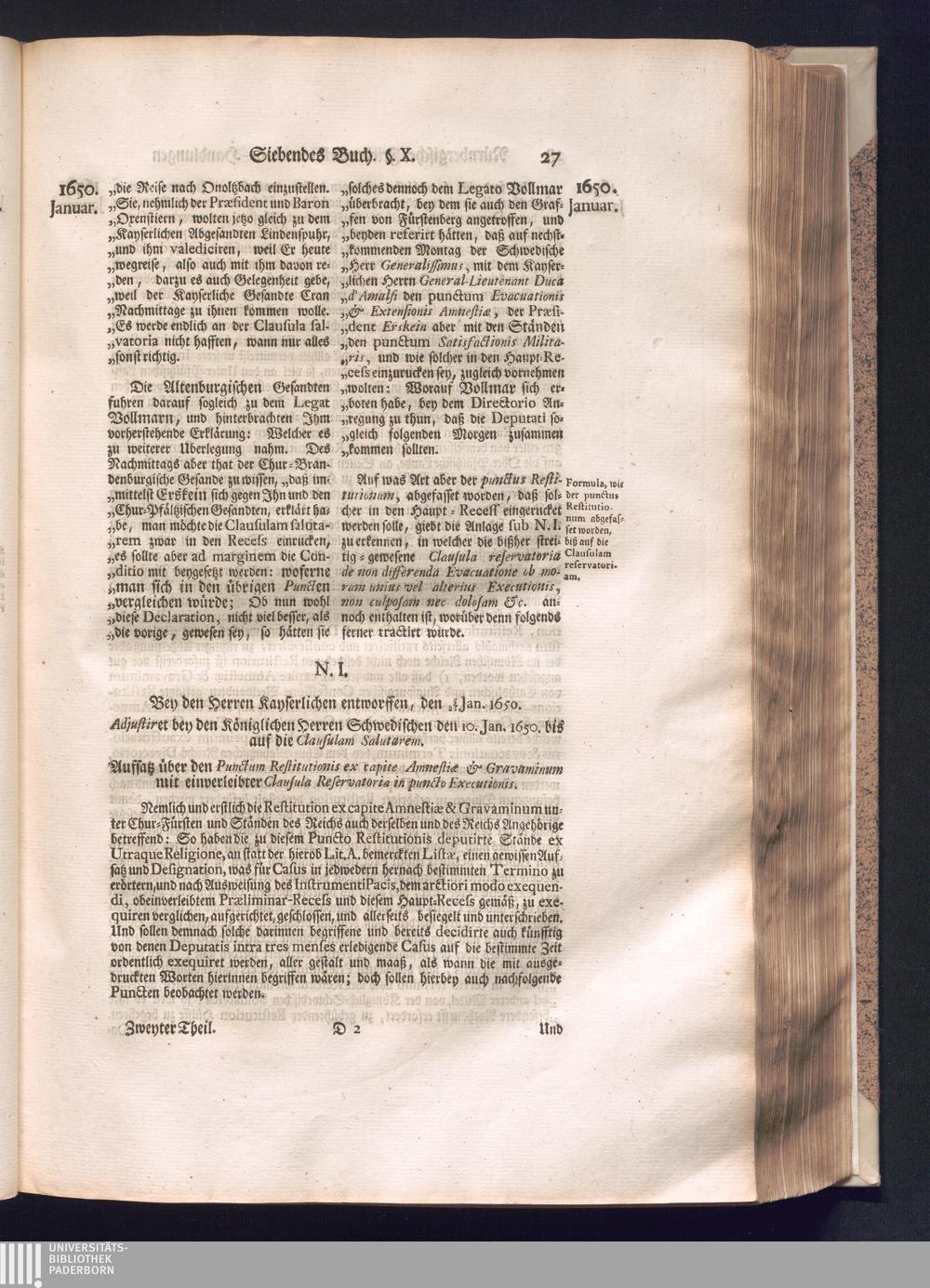 Zweyter und letzter Theil (1737) Worinnen enthalten, wie und welchergestalt die würckliche Vollziehung des Westphälischen Friedens, sowohl in puncto Exauctorationis Militæ und Evacuationis Locorum, als auch und vornehmlich in dem hochwichtigen puncto Restitutionis ex Capite Amnestiæ & Gravaminum, biß zum völligen Schluß des Congressus, Anno 1651, geschehen ist, in einer ausführlichen Historischen Erzehlung, mit beygefügten authentischen Urkunden, auch einem vollständigen Register