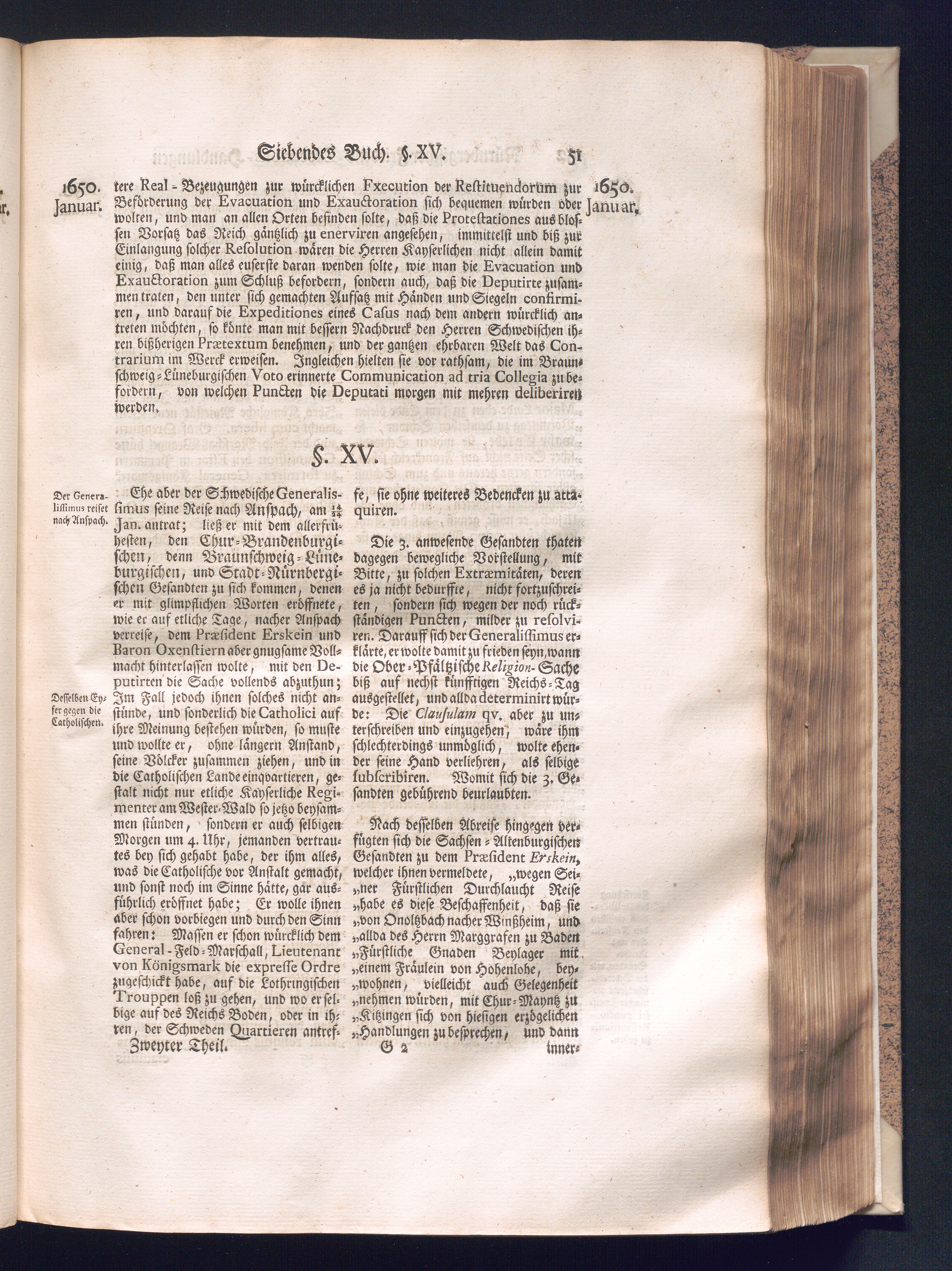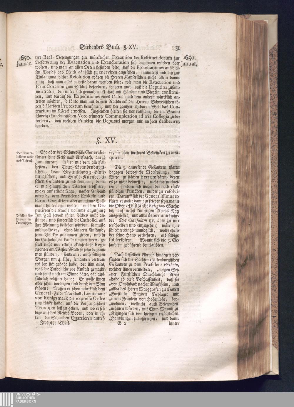 Zweyter und letzter Theil (1737) Worinnen enthalten, wie und welchergestalt die würckliche Vollziehung des Westphälischen Friedens, sowohl in puncto Exauctorationis Militæ und Evacuationis Locorum, als auch und vornehmlich in dem hochwichtigen puncto Restitutionis ex Capite Amnestiæ & Gravaminum, biß zum völligen Schluß des Congressus, Anno 1651, geschehen ist, in einer ausführlichen Historischen Erzehlung, mit beygefügten authentischen Urkunden, auch einem vollständigen Register