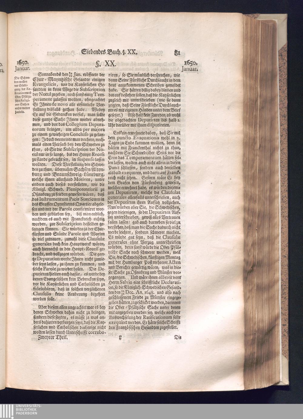 Zweyter und letzter Theil (1737) Worinnen enthalten, wie und welchergestalt die würckliche Vollziehung des Westphälischen Friedens, sowohl in puncto Exauctorationis Militæ und Evacuationis Locorum, als auch und vornehmlich in dem hochwichtigen puncto Restitutionis ex Capite Amnestiæ & Gravaminum, biß zum völligen Schluß des Congressus, Anno 1651, geschehen ist, in einer ausführlichen Historischen Erzehlung, mit beygefügten authentischen Urkunden, auch einem vollständigen Register