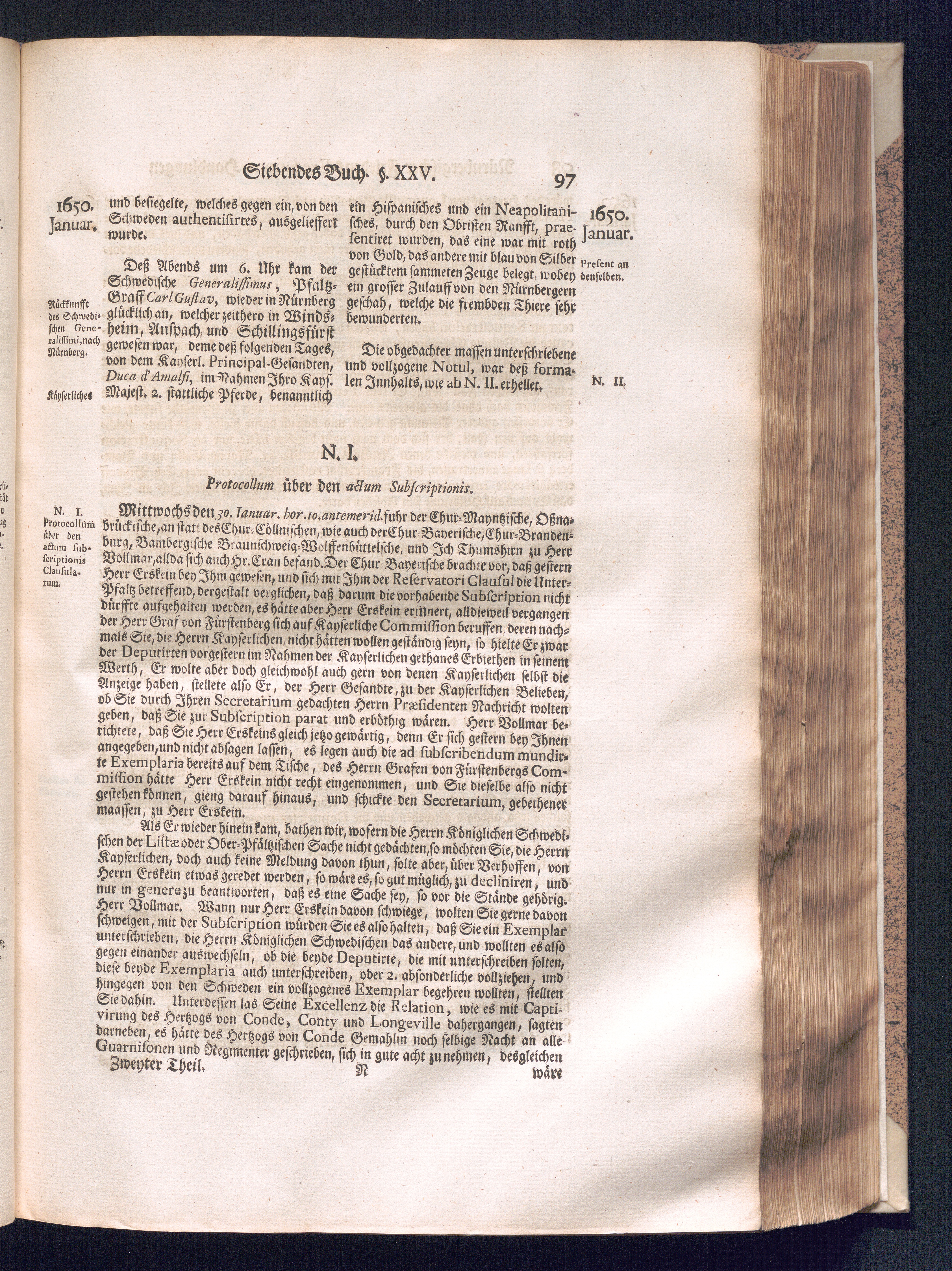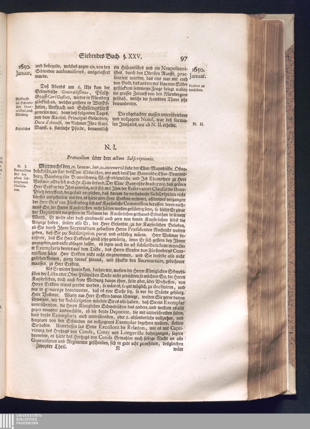 Zweyter und letzter Theil (1737) Worinnen enthalten, wie und welchergestalt die würckliche Vollziehung des Westphälischen Friedens, sowohl in puncto Exauctorationis Militæ und Evacuationis Locorum, als auch und vornehmlich in dem hochwichtigen puncto Restitutionis ex Capite Amnestiæ & Gravaminum, biß zum völligen Schluß des Congressus, Anno 1651, geschehen ist, in einer ausführlichen Historischen Erzehlung, mit beygefügten authentischen Urkunden, auch einem vollständigen Register