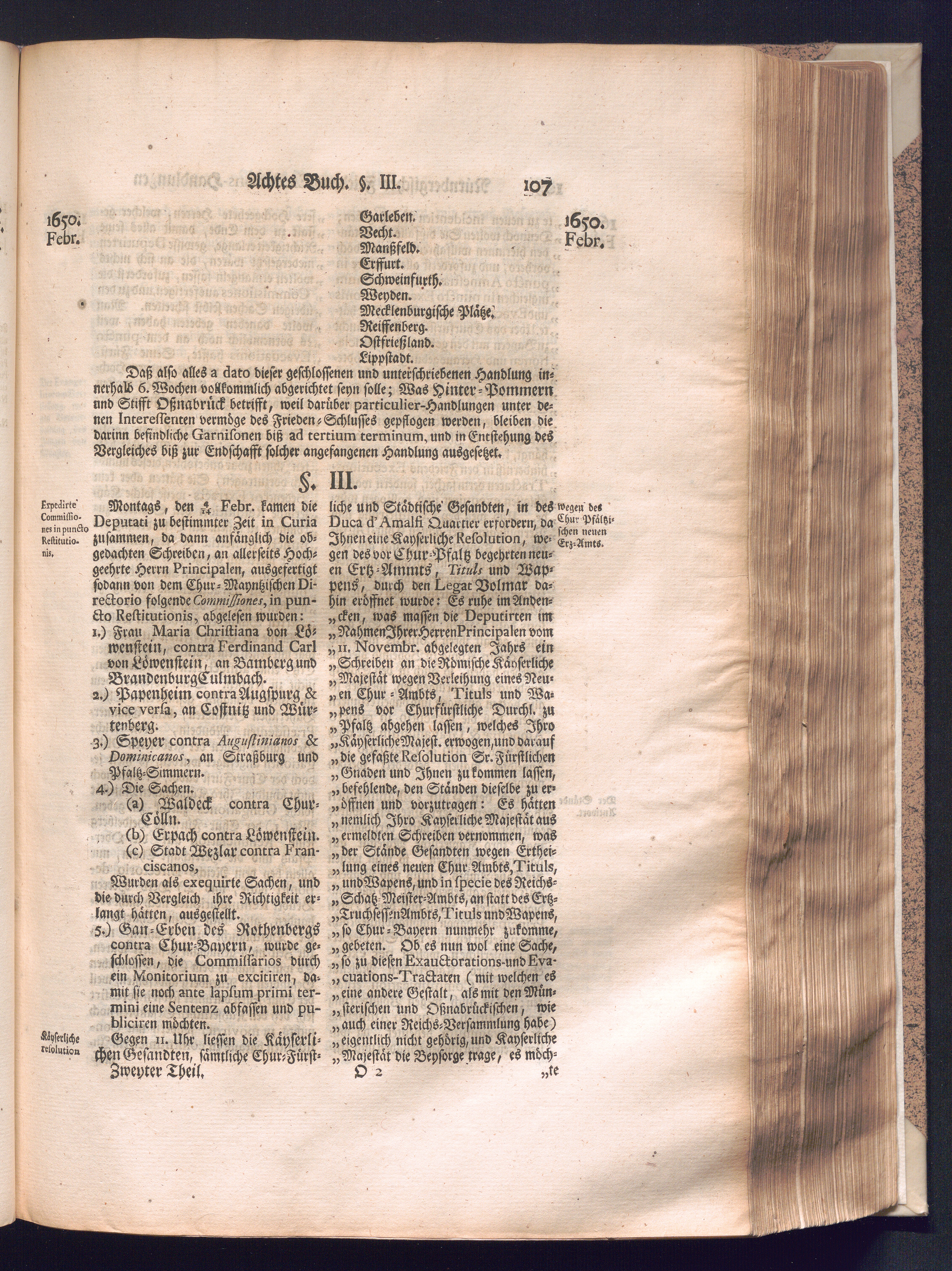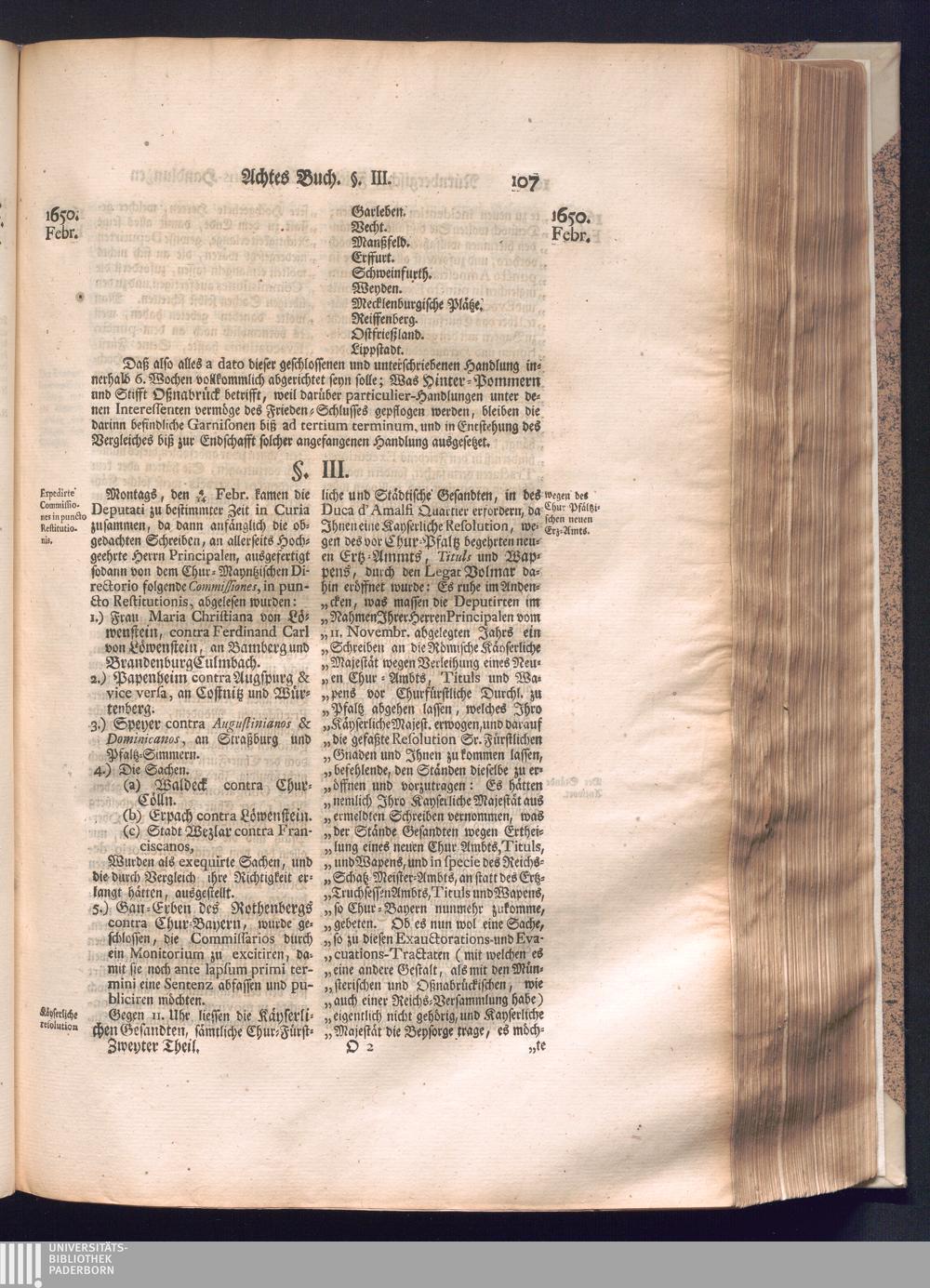 Zweyter und letzter Theil (1737) Worinnen enthalten, wie und welchergestalt die würckliche Vollziehung des Westphälischen Friedens, sowohl in puncto Exauctorationis Militæ und Evacuationis Locorum, als auch und vornehmlich in dem hochwichtigen puncto Restitutionis ex Capite Amnestiæ & Gravaminum, biß zum völligen Schluß des Congressus, Anno 1651, geschehen ist, in einer ausführlichen Historischen Erzehlung, mit beygefügten authentischen Urkunden, auch einem vollständigen Register