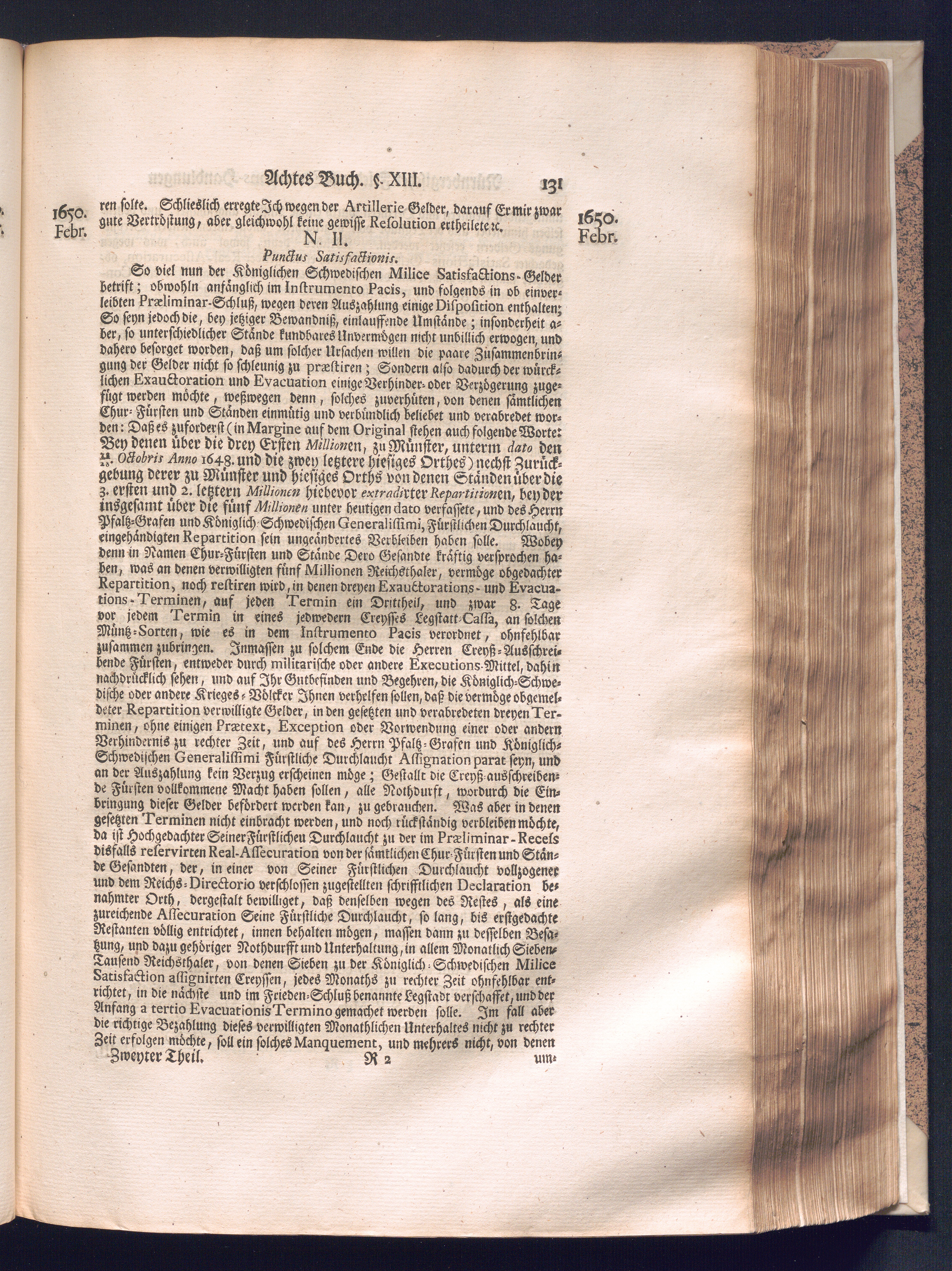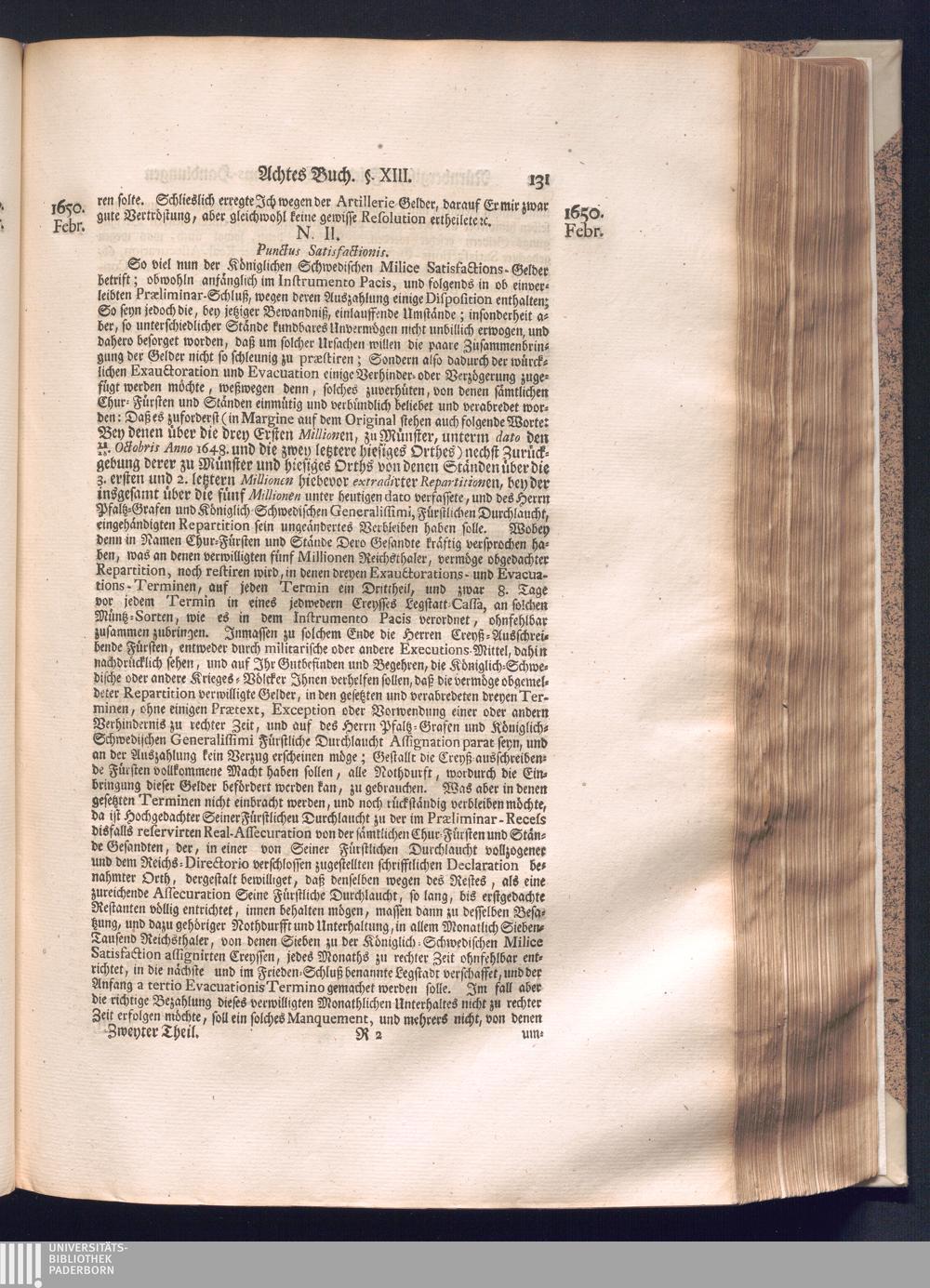 Zweyter und letzter Theil (1737) Worinnen enthalten, wie und welchergestalt die würckliche Vollziehung des Westphälischen Friedens, sowohl in puncto Exauctorationis Militæ und Evacuationis Locorum, als auch und vornehmlich in dem hochwichtigen puncto Restitutionis ex Capite Amnestiæ & Gravaminum, biß zum völligen Schluß des Congressus, Anno 1651, geschehen ist, in einer ausführlichen Historischen Erzehlung, mit beygefügten authentischen Urkunden, auch einem vollständigen Register