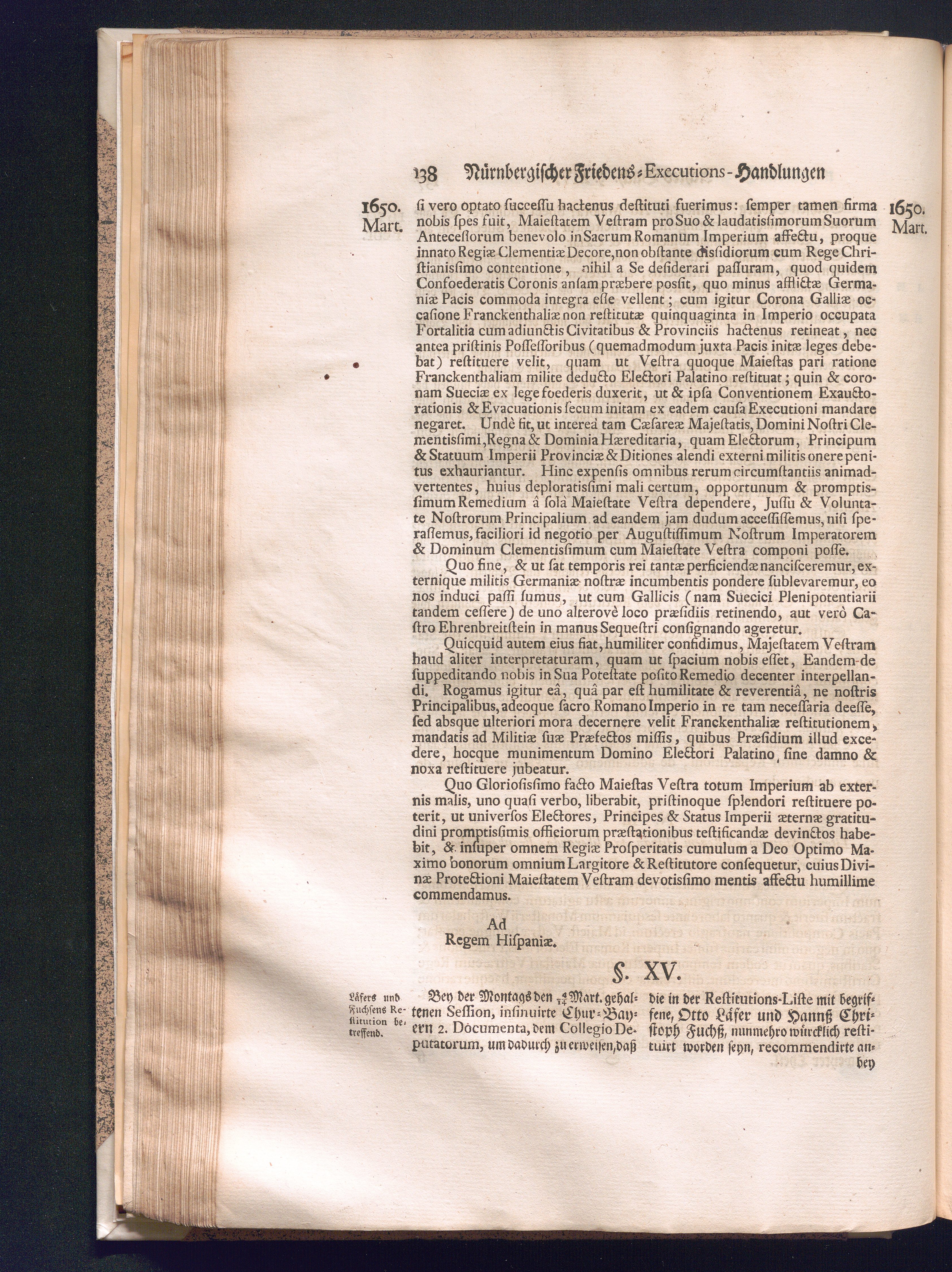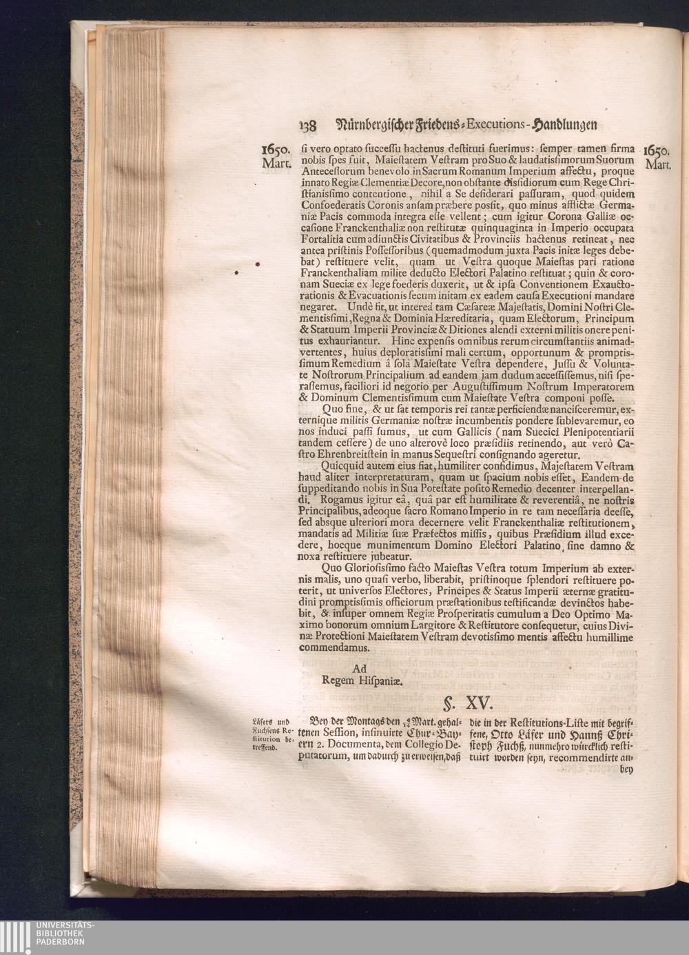 Zweyter und letzter Theil (1737) Worinnen enthalten, wie und welchergestalt die würckliche Vollziehung des Westphälischen Friedens, sowohl in puncto Exauctorationis Militæ und Evacuationis Locorum, als auch und vornehmlich in dem hochwichtigen puncto Restitutionis ex Capite Amnestiæ & Gravaminum, biß zum völligen Schluß des Congressus, Anno 1651, geschehen ist, in einer ausführlichen Historischen Erzehlung, mit beygefügten authentischen Urkunden, auch einem vollständigen Register