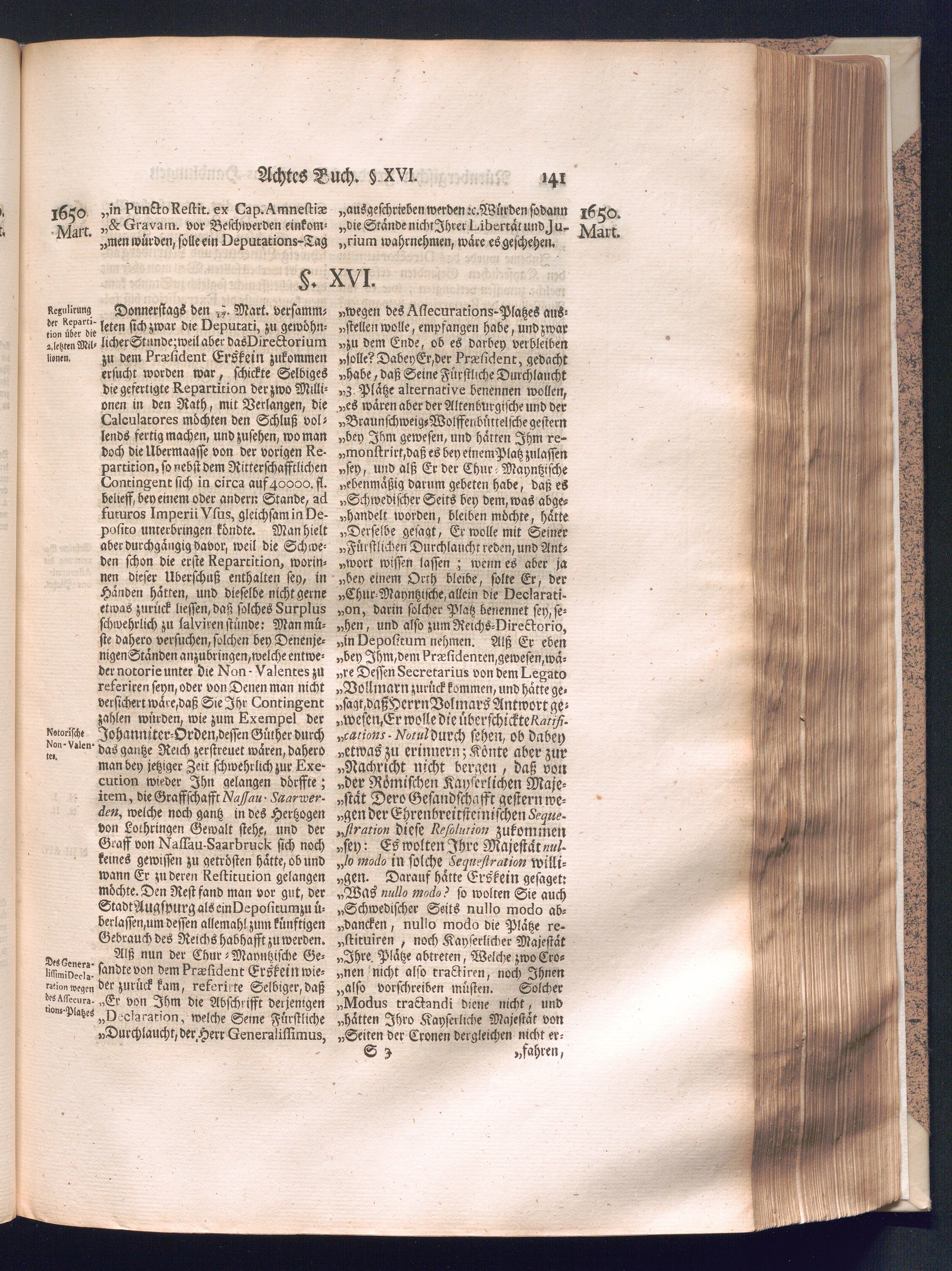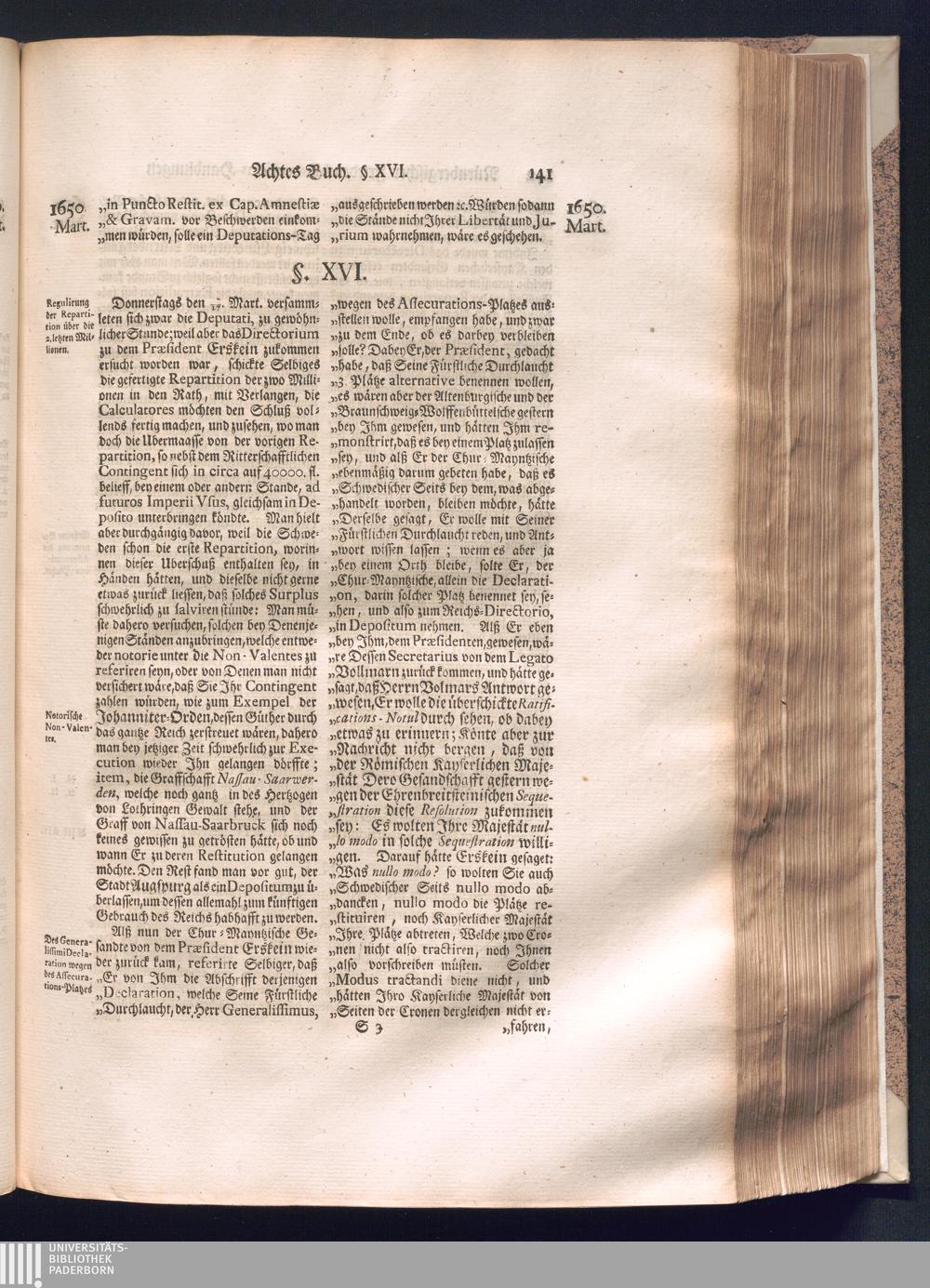 Zweyter und letzter Theil (1737) Worinnen enthalten, wie und welchergestalt die würckliche Vollziehung des Westphälischen Friedens, sowohl in puncto Exauctorationis Militæ und Evacuationis Locorum, als auch und vornehmlich in dem hochwichtigen puncto Restitutionis ex Capite Amnestiæ & Gravaminum, biß zum völligen Schluß des Congressus, Anno 1651, geschehen ist, in einer ausführlichen Historischen Erzehlung, mit beygefügten authentischen Urkunden, auch einem vollständigen Register
