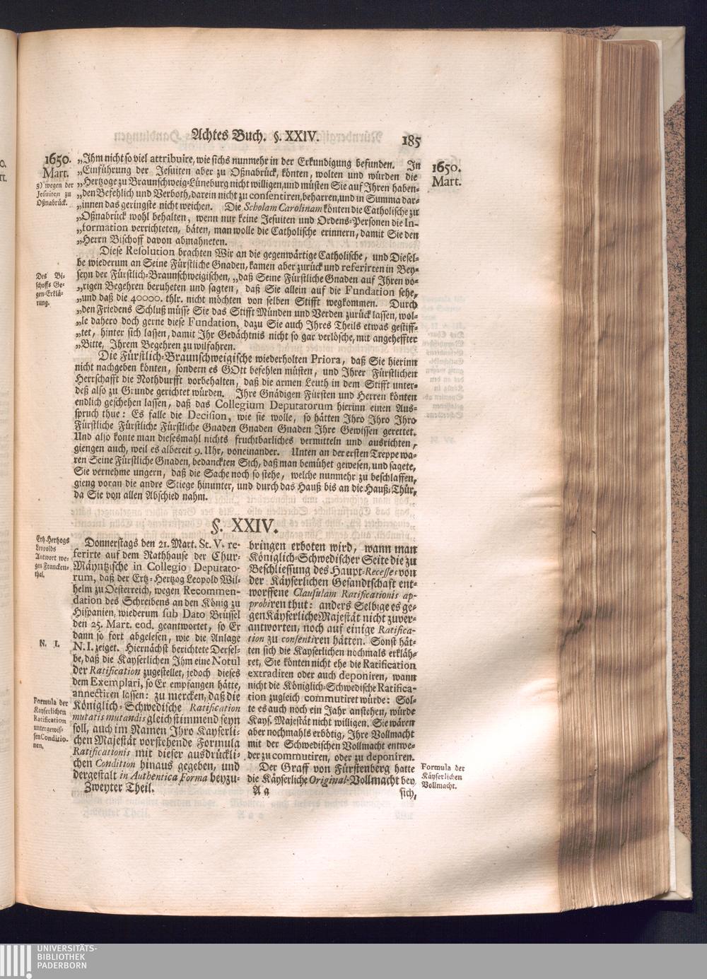 Zweyter und letzter Theil (1737) Worinnen enthalten, wie und welchergestalt die würckliche Vollziehung des Westphälischen Friedens, sowohl in puncto Exauctorationis Militæ und Evacuationis Locorum, als auch und vornehmlich in dem hochwichtigen puncto Restitutionis ex Capite Amnestiæ & Gravaminum, biß zum völligen Schluß des Congressus, Anno 1651, geschehen ist, in einer ausführlichen Historischen Erzehlung, mit beygefügten authentischen Urkunden, auch einem vollständigen Register
