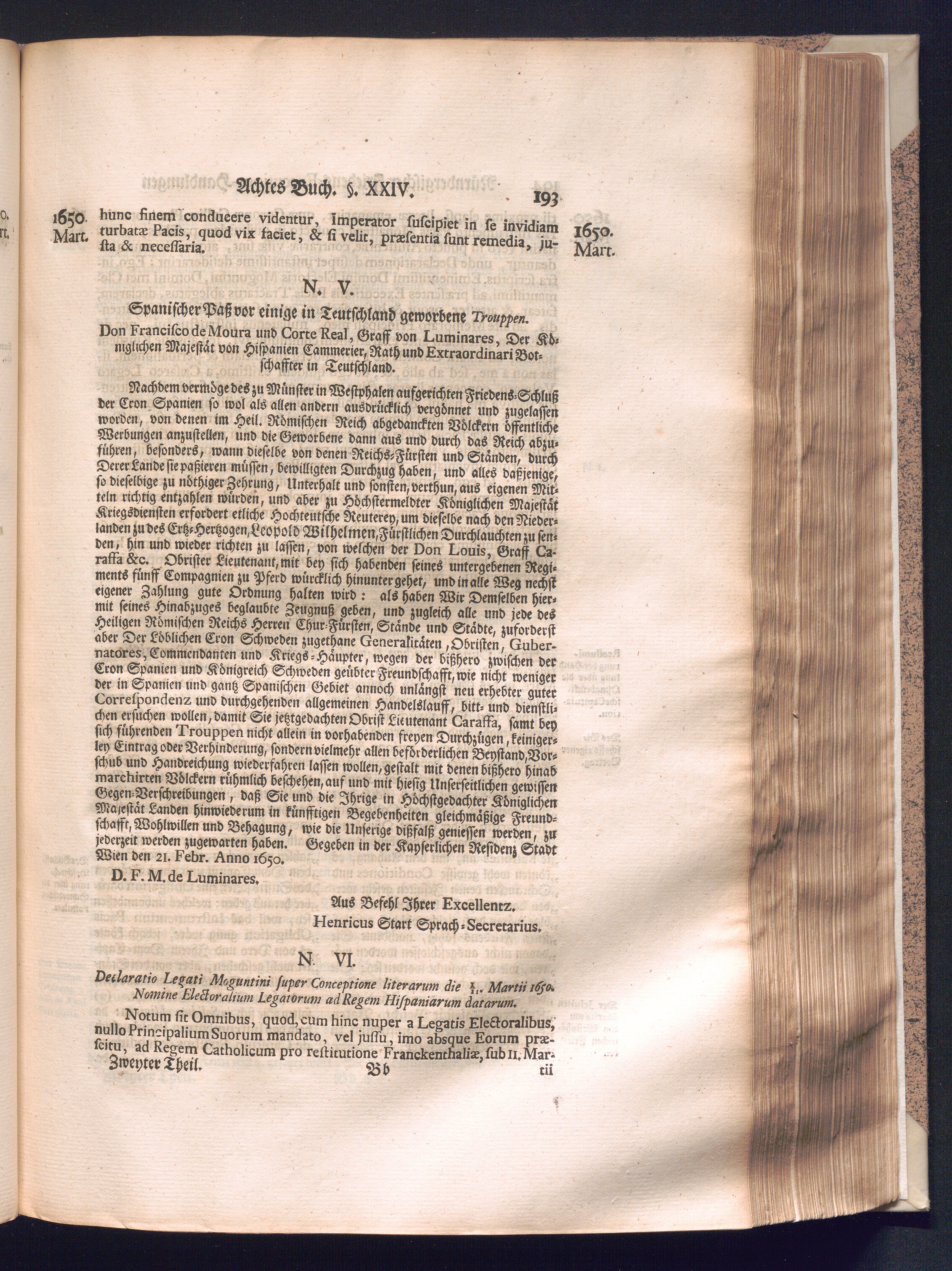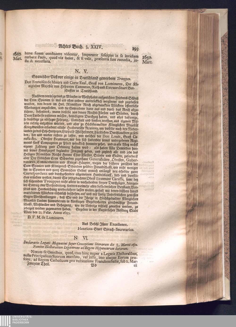 Zweyter und letzter Theil (1737) Worinnen enthalten, wie und welchergestalt die würckliche Vollziehung des Westphälischen Friedens, sowohl in puncto Exauctorationis Militæ und Evacuationis Locorum, als auch und vornehmlich in dem hochwichtigen puncto Restitutionis ex Capite Amnestiæ & Gravaminum, biß zum völligen Schluß des Congressus, Anno 1651, geschehen ist, in einer ausführlichen Historischen Erzehlung, mit beygefügten authentischen Urkunden, auch einem vollständigen Register