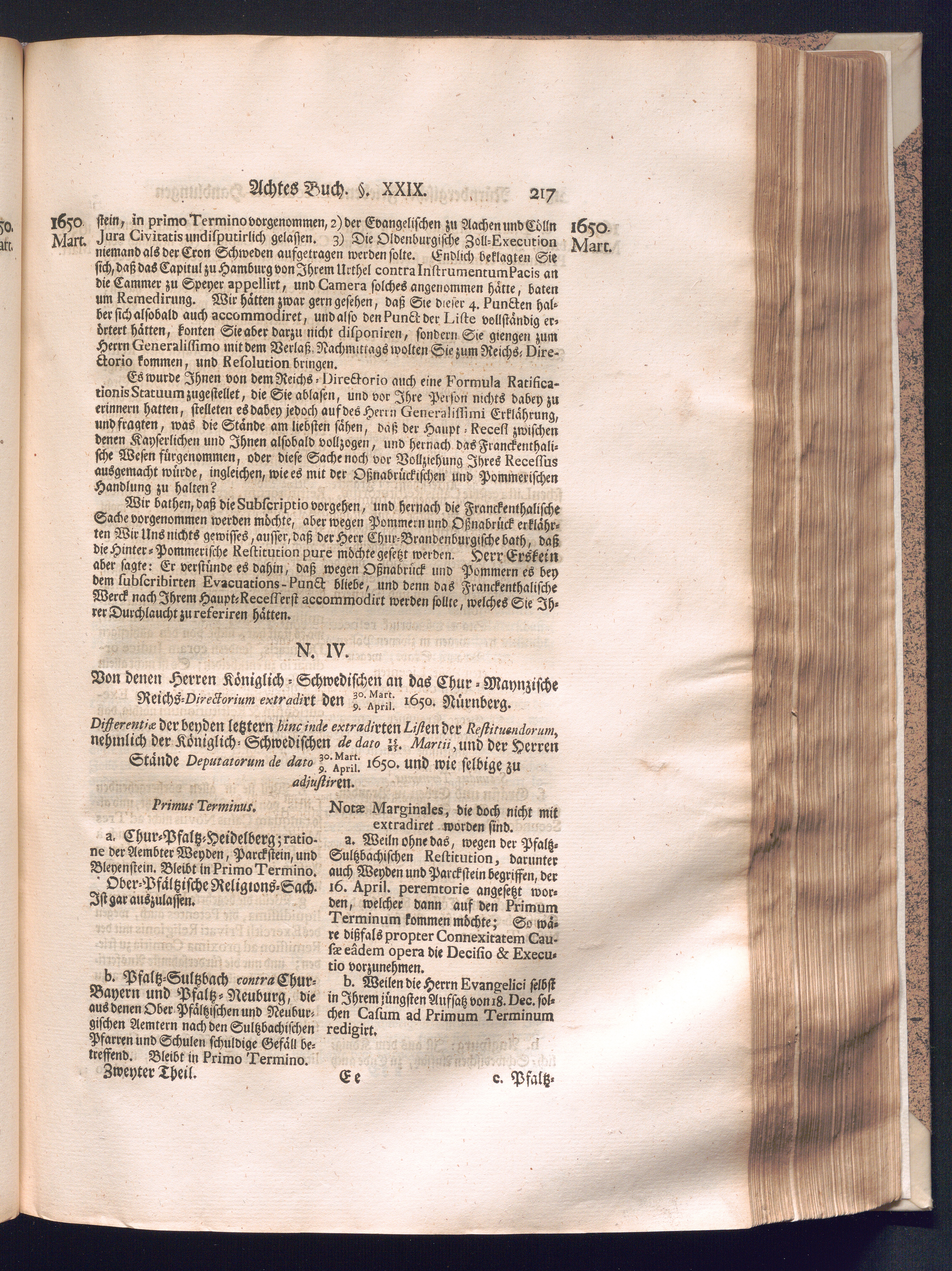 Zweyter und letzter Theil (1737) Worinnen enthalten, wie und welchergestalt die würckliche Vollziehung des Westphälischen Friedens, sowohl in puncto Exauctorationis Militæ und Evacuationis Locorum, als auch und vornehmlich in dem hochwichtigen puncto Restitutionis ex Capite Amnestiæ & Gravaminum, biß zum völligen Schluß des Congressus, Anno 1651, geschehen ist, in einer ausführlichen Historischen Erzehlung, mit beygefügten authentischen Urkunden, auch einem vollständigen Register