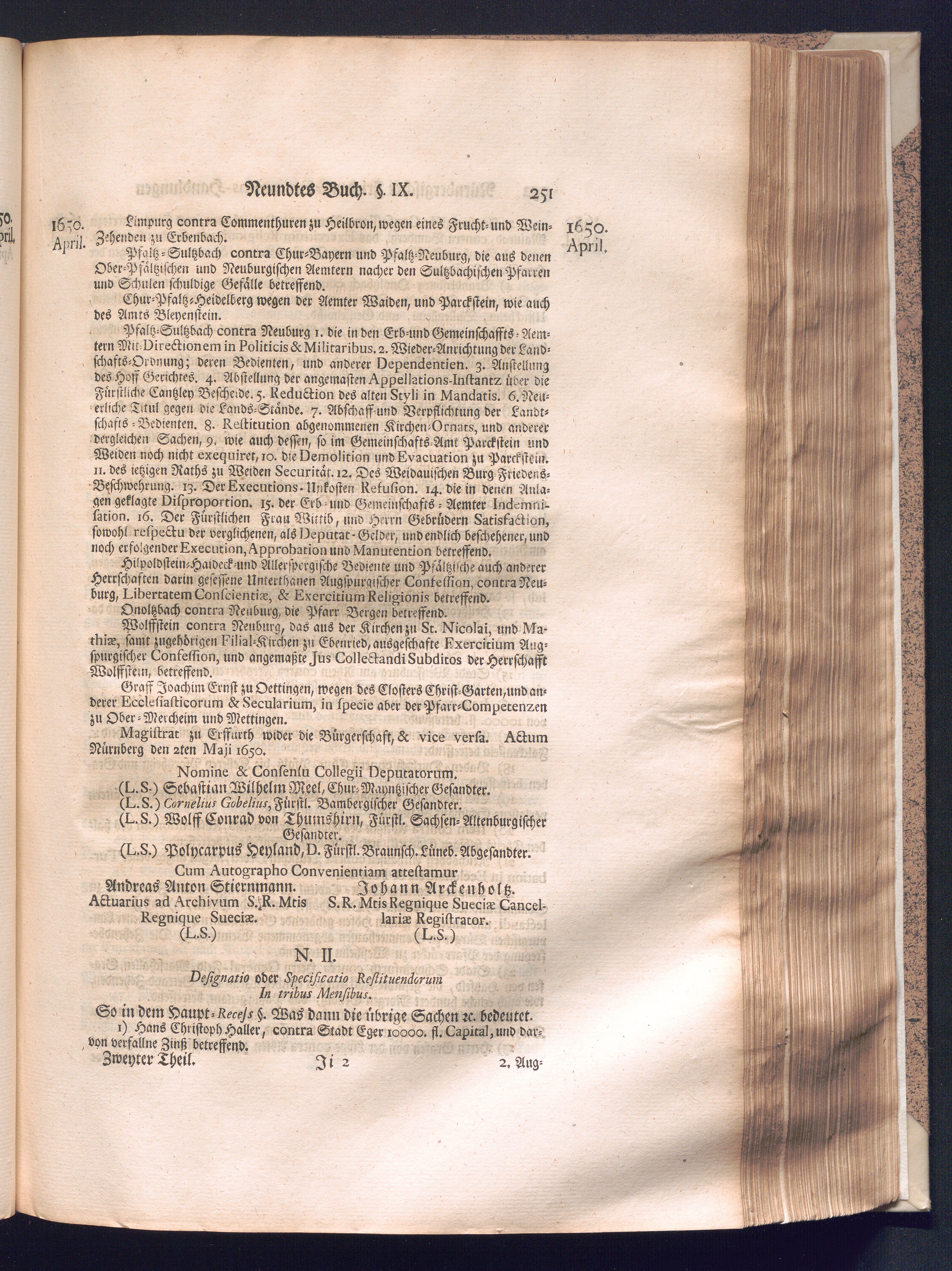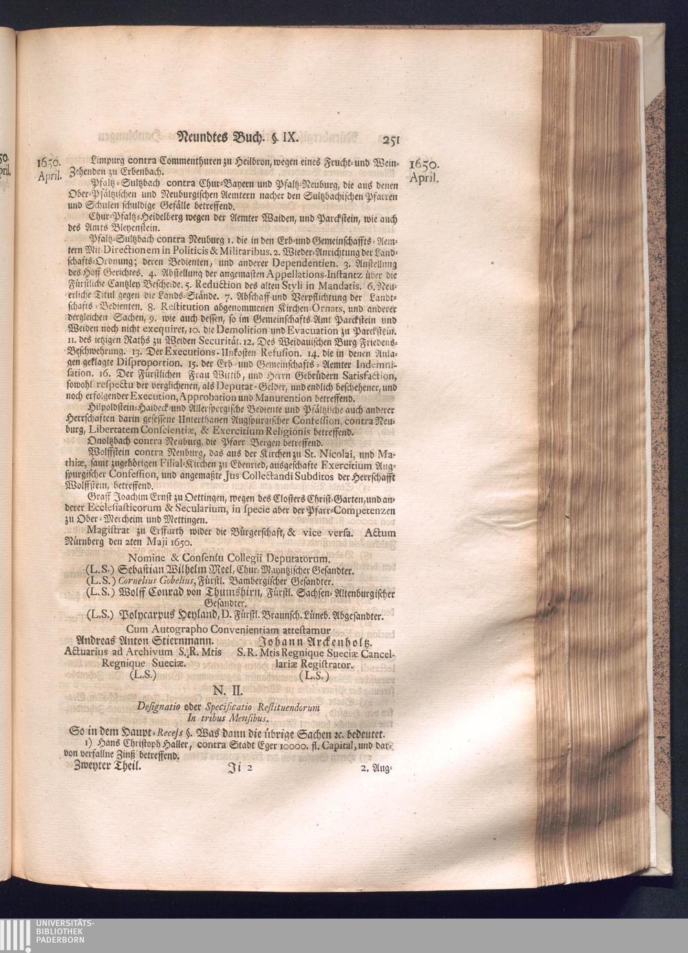 Zweyter und letzter Theil (1737) Worinnen enthalten, wie und welchergestalt die würckliche Vollziehung des Westphälischen Friedens, sowohl in puncto Exauctorationis Militæ und Evacuationis Locorum, als auch und vornehmlich in dem hochwichtigen puncto Restitutionis ex Capite Amnestiæ & Gravaminum, biß zum völligen Schluß des Congressus, Anno 1651, geschehen ist, in einer ausführlichen Historischen Erzehlung, mit beygefügten authentischen Urkunden, auch einem vollständigen Register