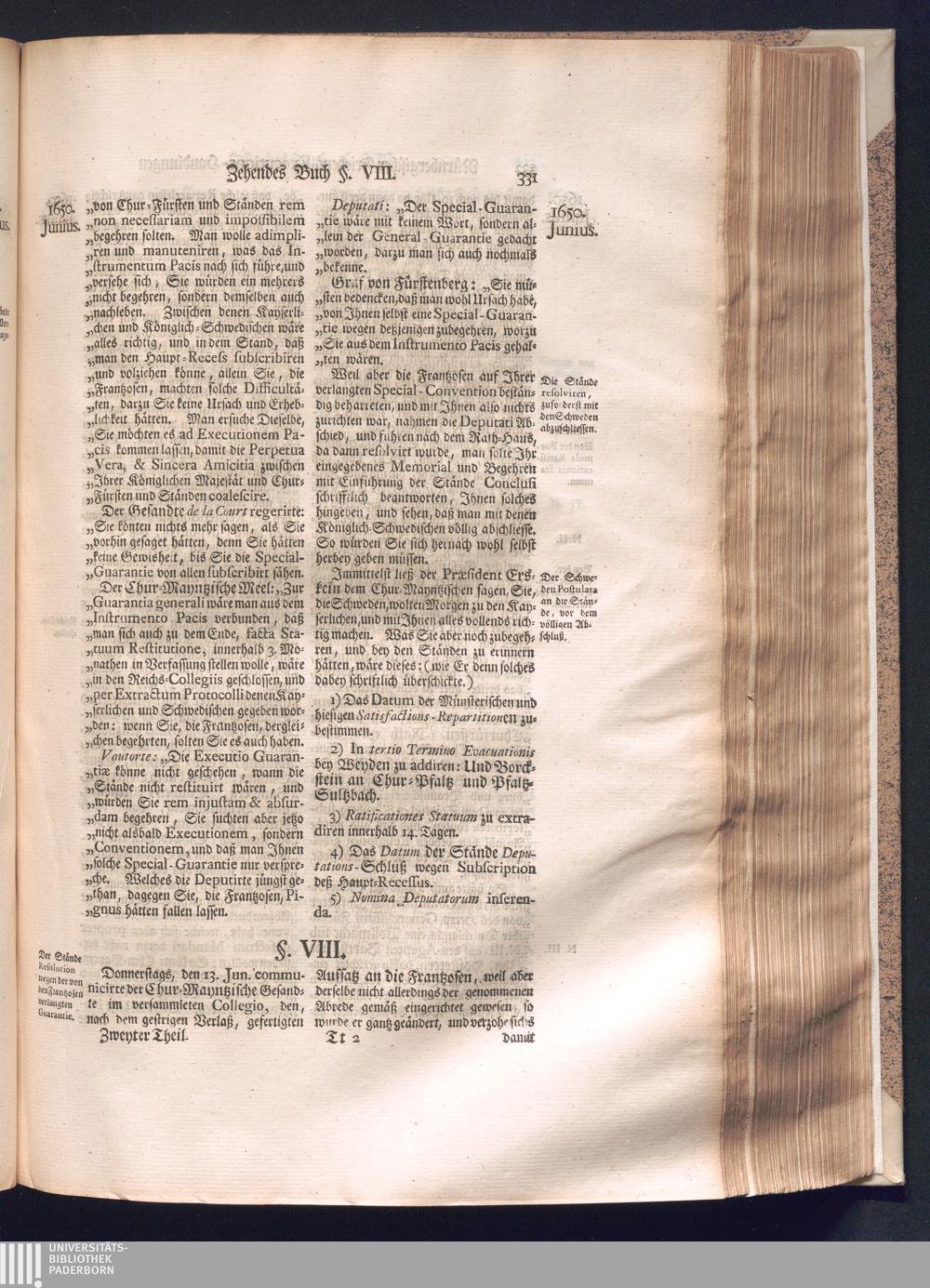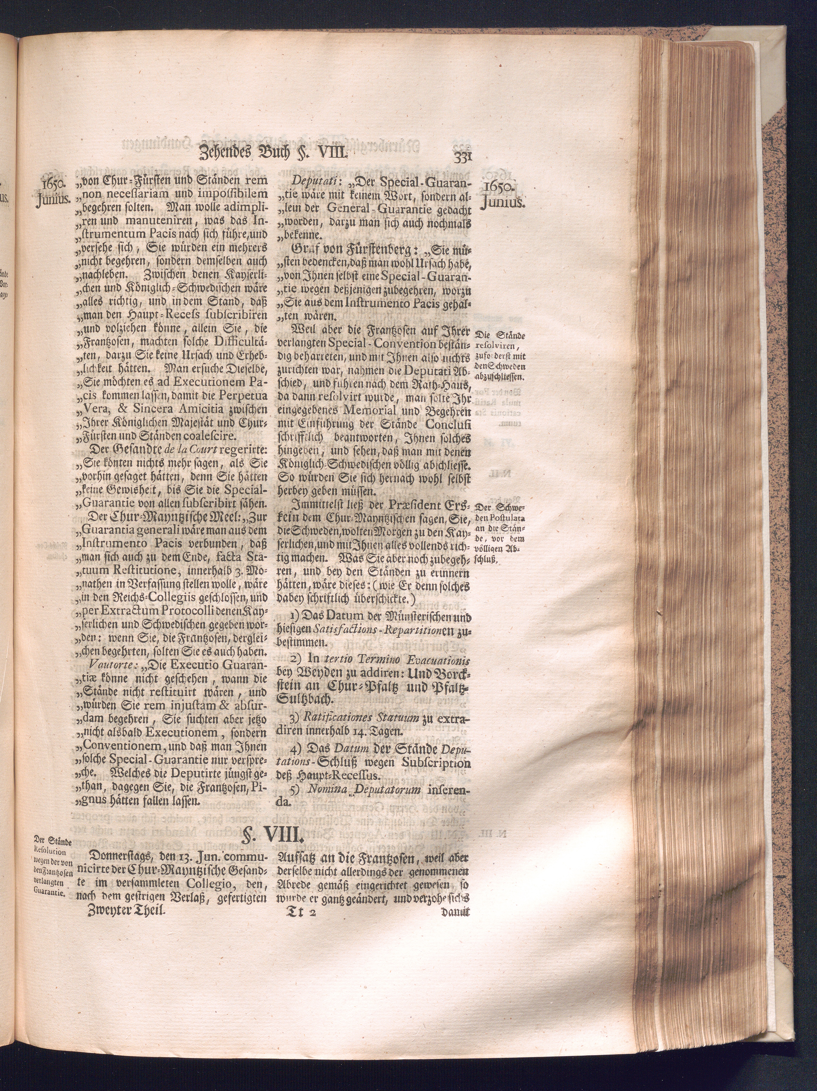 Zweyter und letzter Theil (1737) Worinnen enthalten, wie und welchergestalt die würckliche Vollziehung des Westphälischen Friedens, sowohl in puncto Exauctorationis Militæ und Evacuationis Locorum, als auch und vornehmlich in dem hochwichtigen puncto Restitutionis ex Capite Amnestiæ & Gravaminum, biß zum völligen Schluß des Congressus, Anno 1651, geschehen ist, in einer ausführlichen Historischen Erzehlung, mit beygefügten authentischen Urkunden, auch einem vollständigen Register