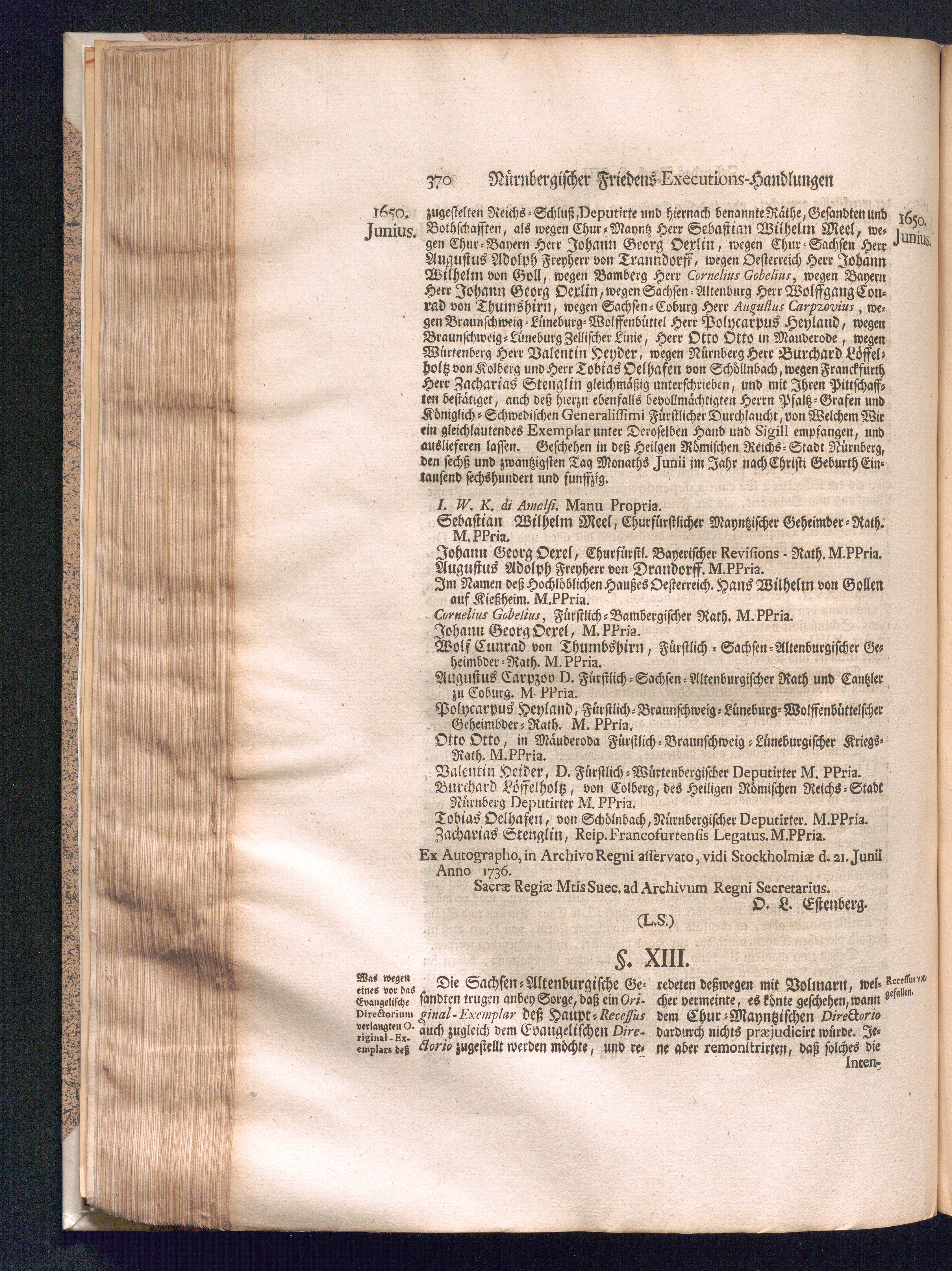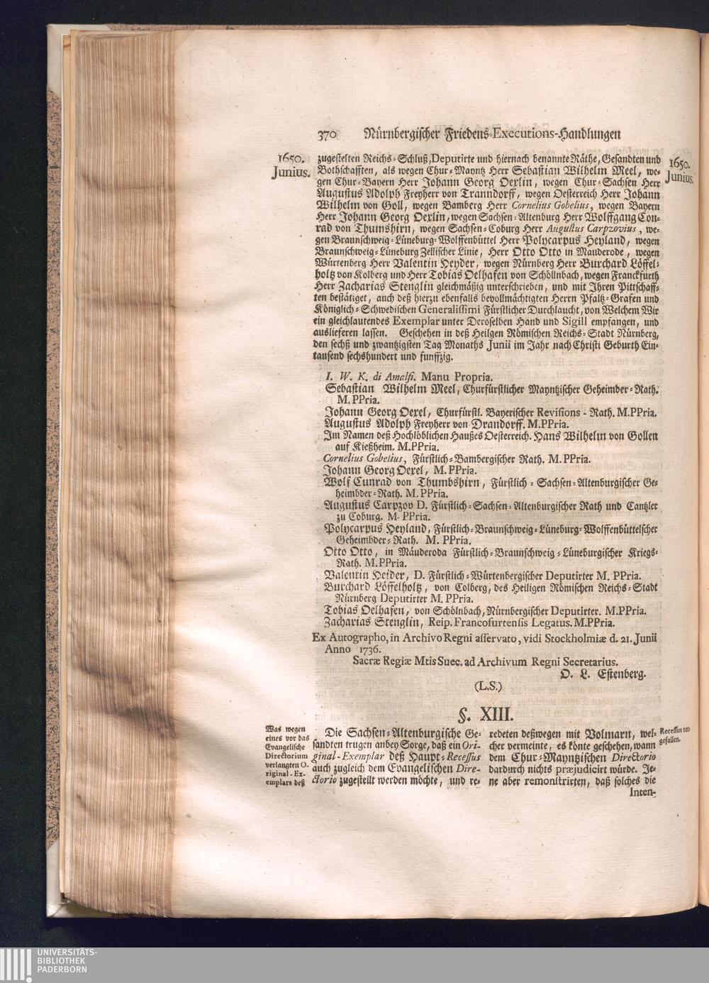 Zweyter und letzter Theil (1737) Worinnen enthalten, wie und welchergestalt die würckliche Vollziehung des Westphälischen Friedens, sowohl in puncto Exauctorationis Militæ und Evacuationis Locorum, als auch und vornehmlich in dem hochwichtigen puncto Restitutionis ex Capite Amnestiæ & Gravaminum, biß zum völligen Schluß des Congressus, Anno 1651, geschehen ist, in einer ausführlichen Historischen Erzehlung, mit beygefügten authentischen Urkunden, auch einem vollständigen Register