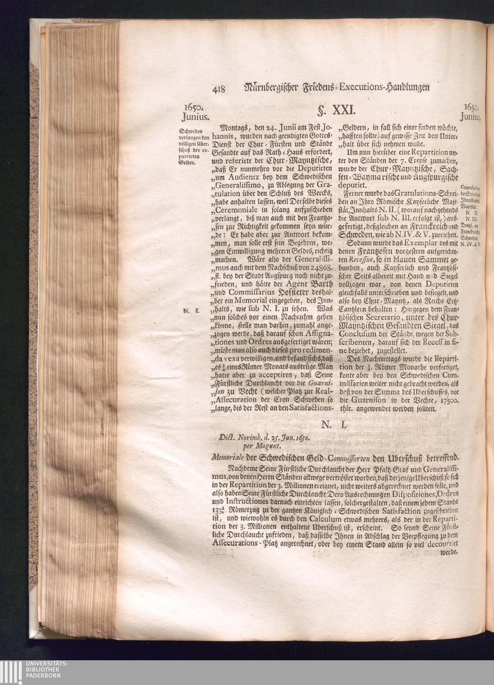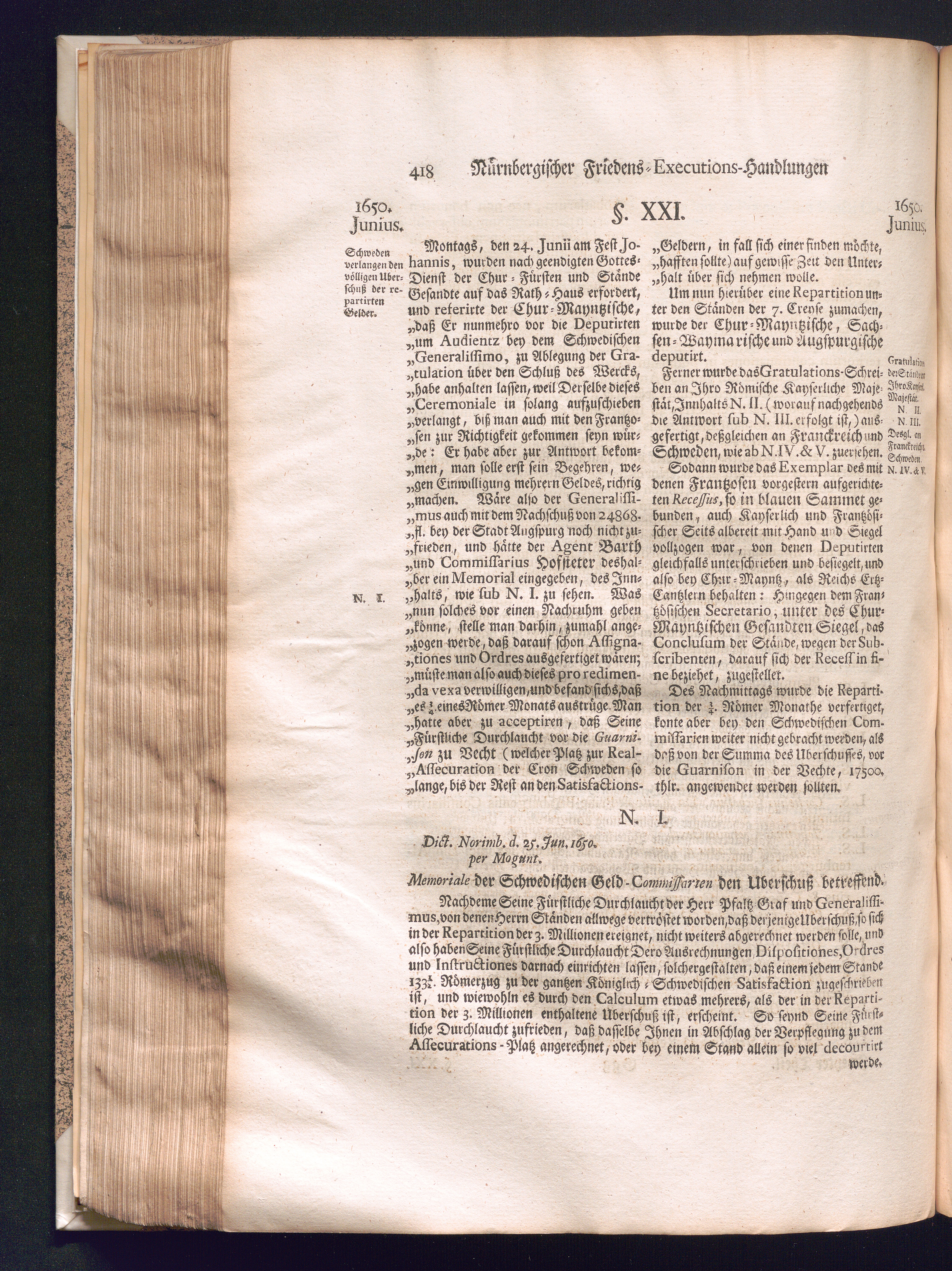 Zweyter und letzter Theil (1737) Worinnen enthalten, wie und welchergestalt die würckliche Vollziehung des Westphälischen Friedens, sowohl in puncto Exauctorationis Militæ und Evacuationis Locorum, als auch und vornehmlich in dem hochwichtigen puncto Restitutionis ex Capite Amnestiæ & Gravaminum, biß zum völligen Schluß des Congressus, Anno 1651, geschehen ist, in einer ausführlichen Historischen Erzehlung, mit beygefügten authentischen Urkunden, auch einem vollständigen Register