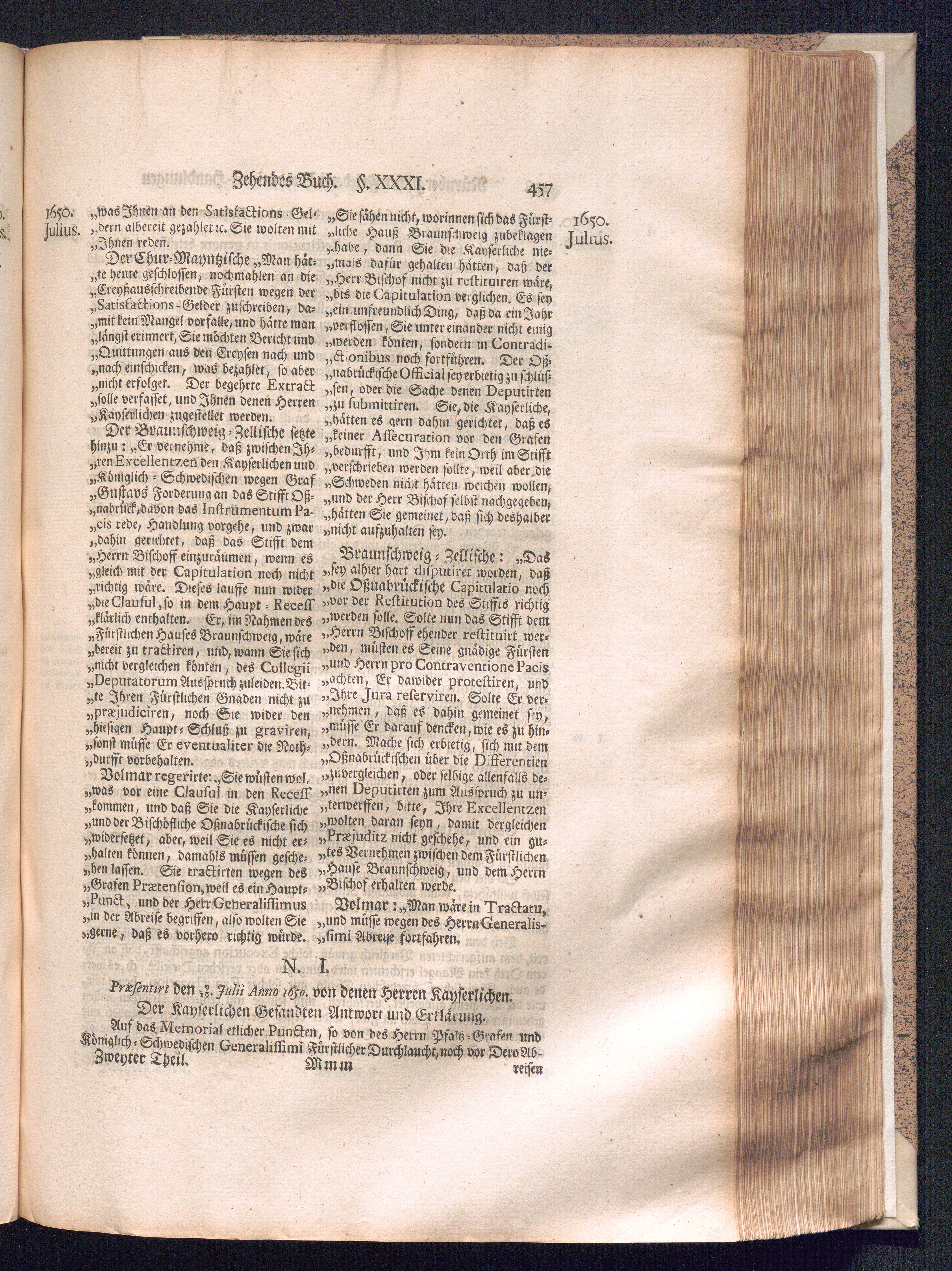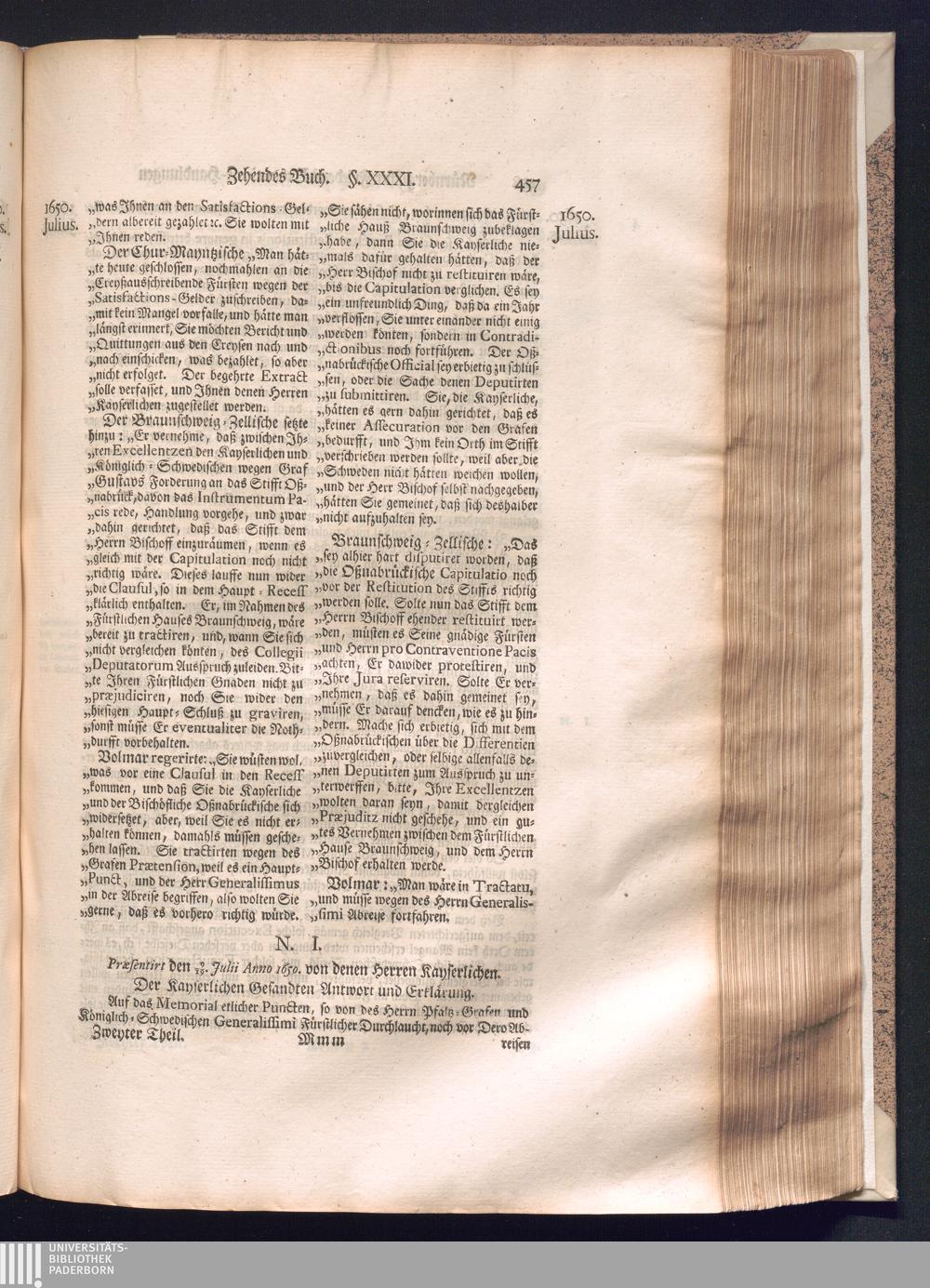 Zweyter und letzter Theil (1737) Worinnen enthalten, wie und welchergestalt die würckliche Vollziehung des Westphälischen Friedens, sowohl in puncto Exauctorationis Militæ und Evacuationis Locorum, als auch und vornehmlich in dem hochwichtigen puncto Restitutionis ex Capite Amnestiæ & Gravaminum, biß zum völligen Schluß des Congressus, Anno 1651, geschehen ist, in einer ausführlichen Historischen Erzehlung, mit beygefügten authentischen Urkunden, auch einem vollständigen Register