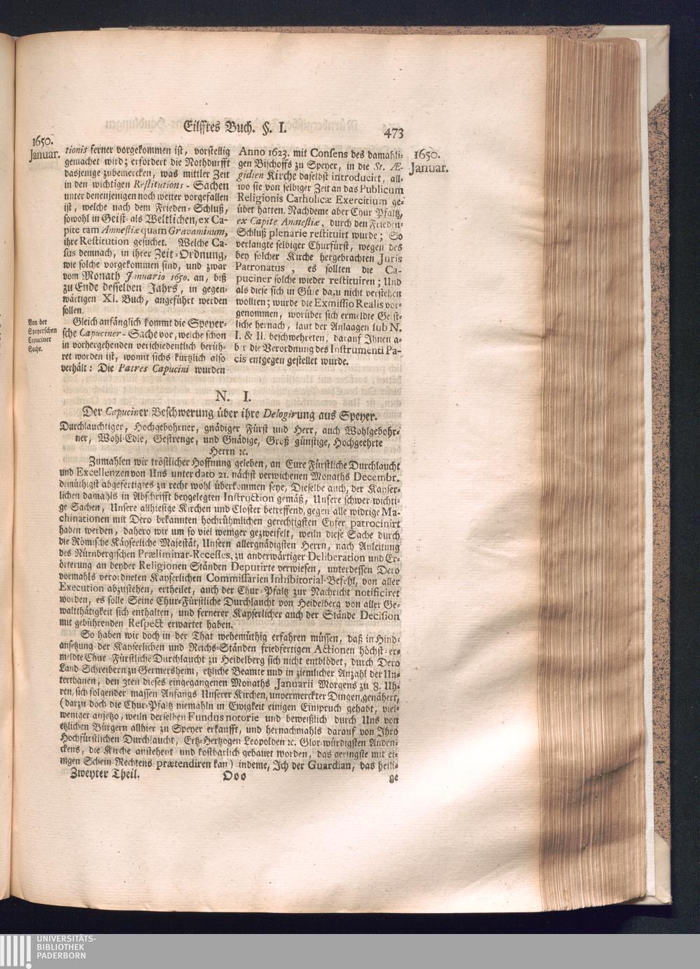 Zweyter und letzter Theil (1737) Worinnen enthalten, wie und welchergestalt die würckliche Vollziehung des Westphälischen Friedens, sowohl in puncto Exauctorationis Militæ und Evacuationis Locorum, als auch und vornehmlich in dem hochwichtigen puncto Restitutionis ex Capite Amnestiæ & Gravaminum, biß zum völligen Schluß des Congressus, Anno 1651, geschehen ist, in einer ausführlichen Historischen Erzehlung, mit beygefügten authentischen Urkunden, auch einem vollständigen Register