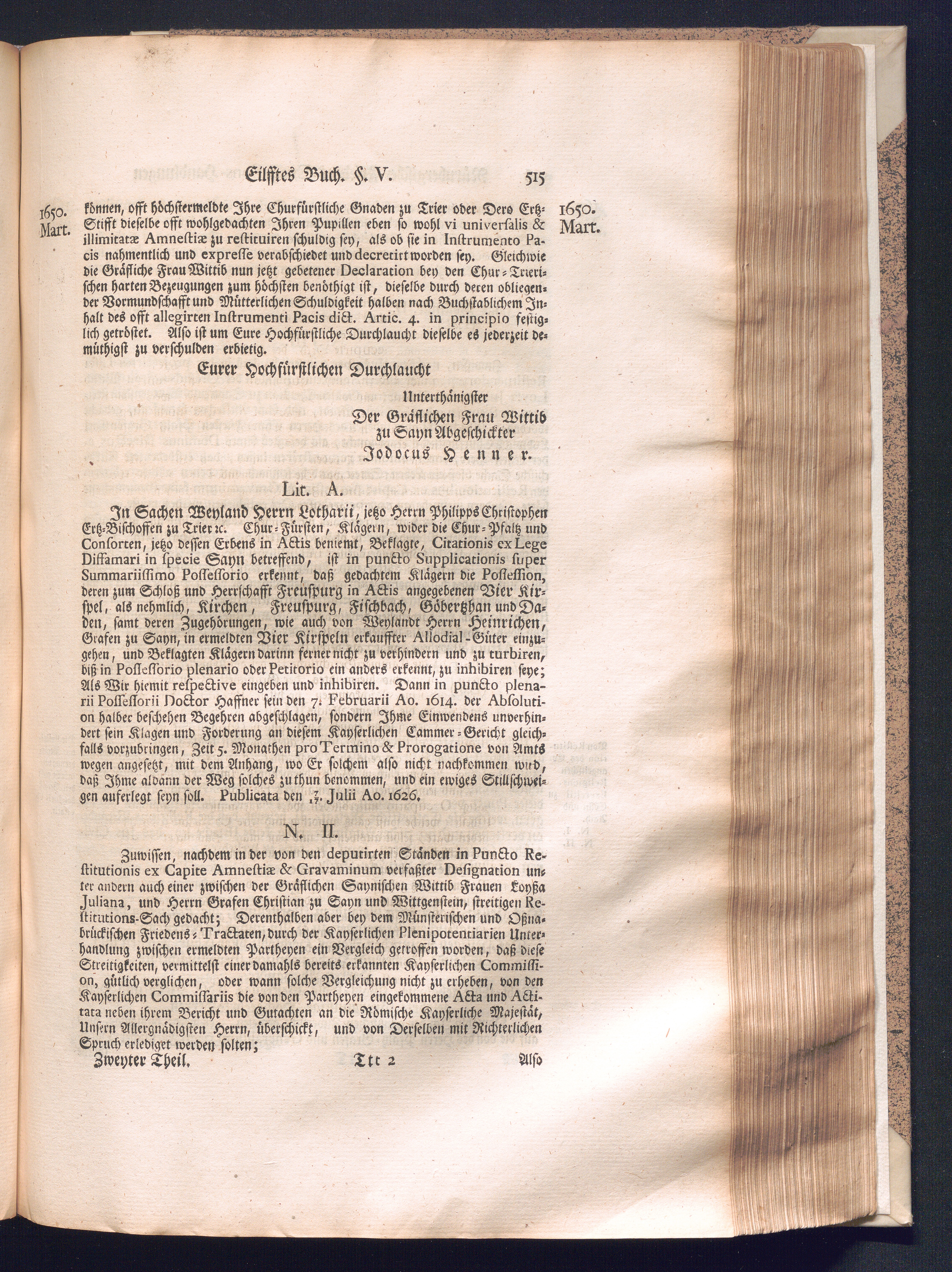 Zweyter und letzter Theil (1737) Worinnen enthalten, wie und welchergestalt die würckliche Vollziehung des Westphälischen Friedens, sowohl in puncto Exauctorationis Militæ und Evacuationis Locorum, als auch und vornehmlich in dem hochwichtigen puncto Restitutionis ex Capite Amnestiæ & Gravaminum, biß zum völligen Schluß des Congressus, Anno 1651, geschehen ist, in einer ausführlichen Historischen Erzehlung, mit beygefügten authentischen Urkunden, auch einem vollständigen Register