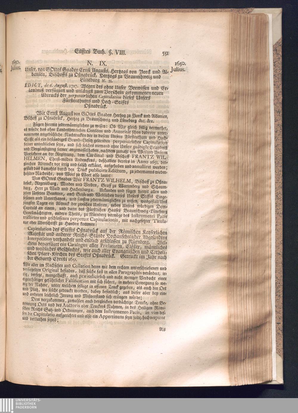 Zweyter und letzter Theil (1737) Worinnen enthalten, wie und welchergestalt die würckliche Vollziehung des Westphälischen Friedens, sowohl in puncto Exauctorationis Militæ und Evacuationis Locorum, als auch und vornehmlich in dem hochwichtigen puncto Restitutionis ex Capite Amnestiæ & Gravaminum, biß zum völligen Schluß des Congressus, Anno 1651, geschehen ist, in einer ausführlichen Historischen Erzehlung, mit beygefügten authentischen Urkunden, auch einem vollständigen Register