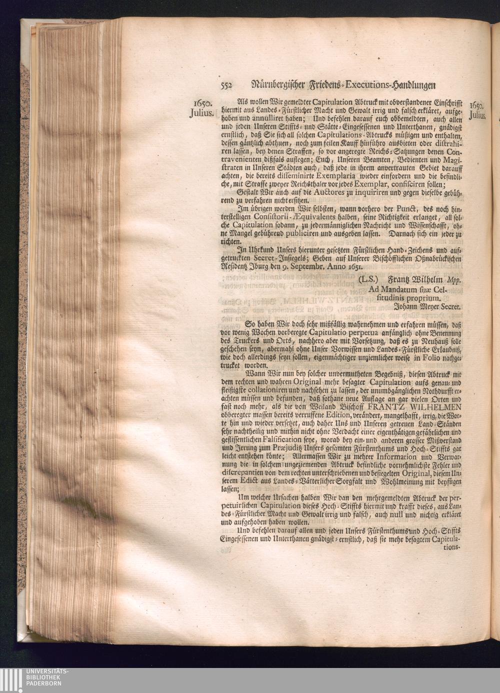 Zweyter und letzter Theil (1737) Worinnen enthalten, wie und welchergestalt die würckliche Vollziehung des Westphälischen Friedens, sowohl in puncto Exauctorationis Militæ und Evacuationis Locorum, als auch und vornehmlich in dem hochwichtigen puncto Restitutionis ex Capite Amnestiæ & Gravaminum, biß zum völligen Schluß des Congressus, Anno 1651, geschehen ist, in einer ausführlichen Historischen Erzehlung, mit beygefügten authentischen Urkunden, auch einem vollständigen Register