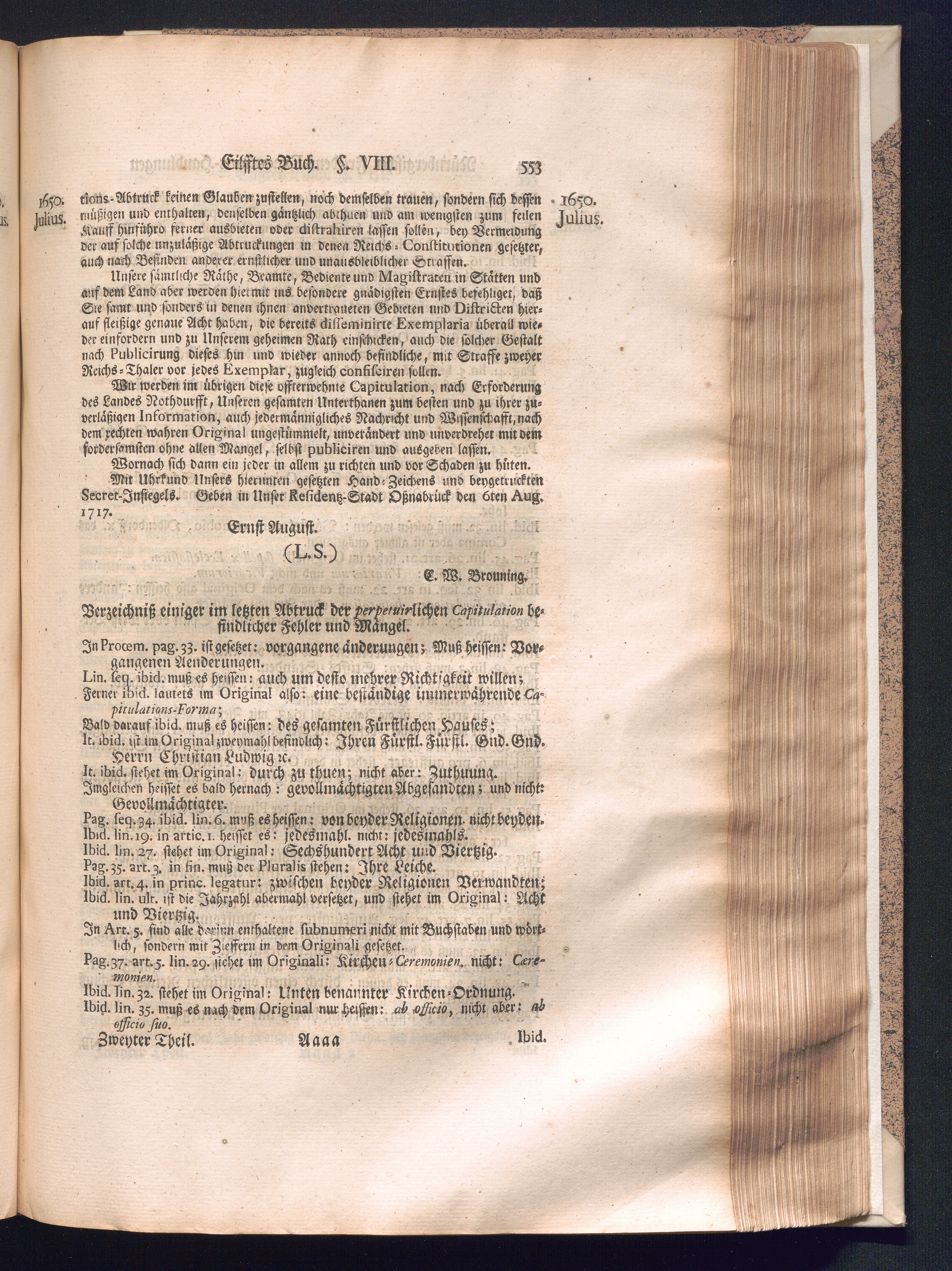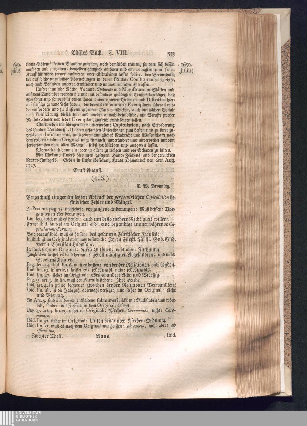 Zweyter und letzter Theil (1737) Worinnen enthalten, wie und welchergestalt die würckliche Vollziehung des Westphälischen Friedens, sowohl in puncto Exauctorationis Militæ und Evacuationis Locorum, als auch und vornehmlich in dem hochwichtigen puncto Restitutionis ex Capite Amnestiæ & Gravaminum, biß zum völligen Schluß des Congressus, Anno 1651, geschehen ist, in einer ausführlichen Historischen Erzehlung, mit beygefügten authentischen Urkunden, auch einem vollständigen Register