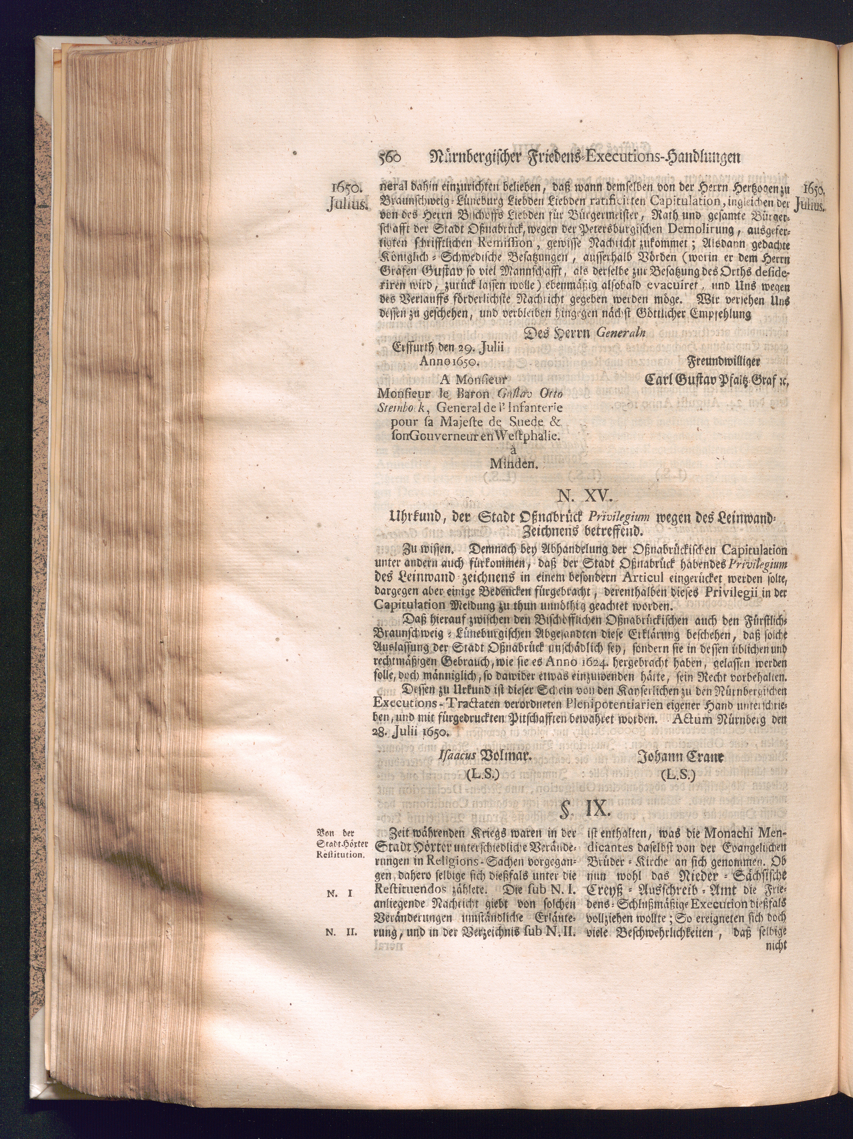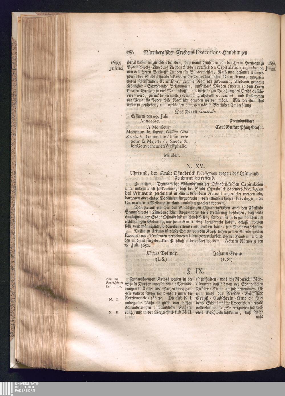Zweyter und letzter Theil (1737) Worinnen enthalten, wie und welchergestalt die würckliche Vollziehung des Westphälischen Friedens, sowohl in puncto Exauctorationis Militæ und Evacuationis Locorum, als auch und vornehmlich in dem hochwichtigen puncto Restitutionis ex Capite Amnestiæ & Gravaminum, biß zum völligen Schluß des Congressus, Anno 1651, geschehen ist, in einer ausführlichen Historischen Erzehlung, mit beygefügten authentischen Urkunden, auch einem vollständigen Register