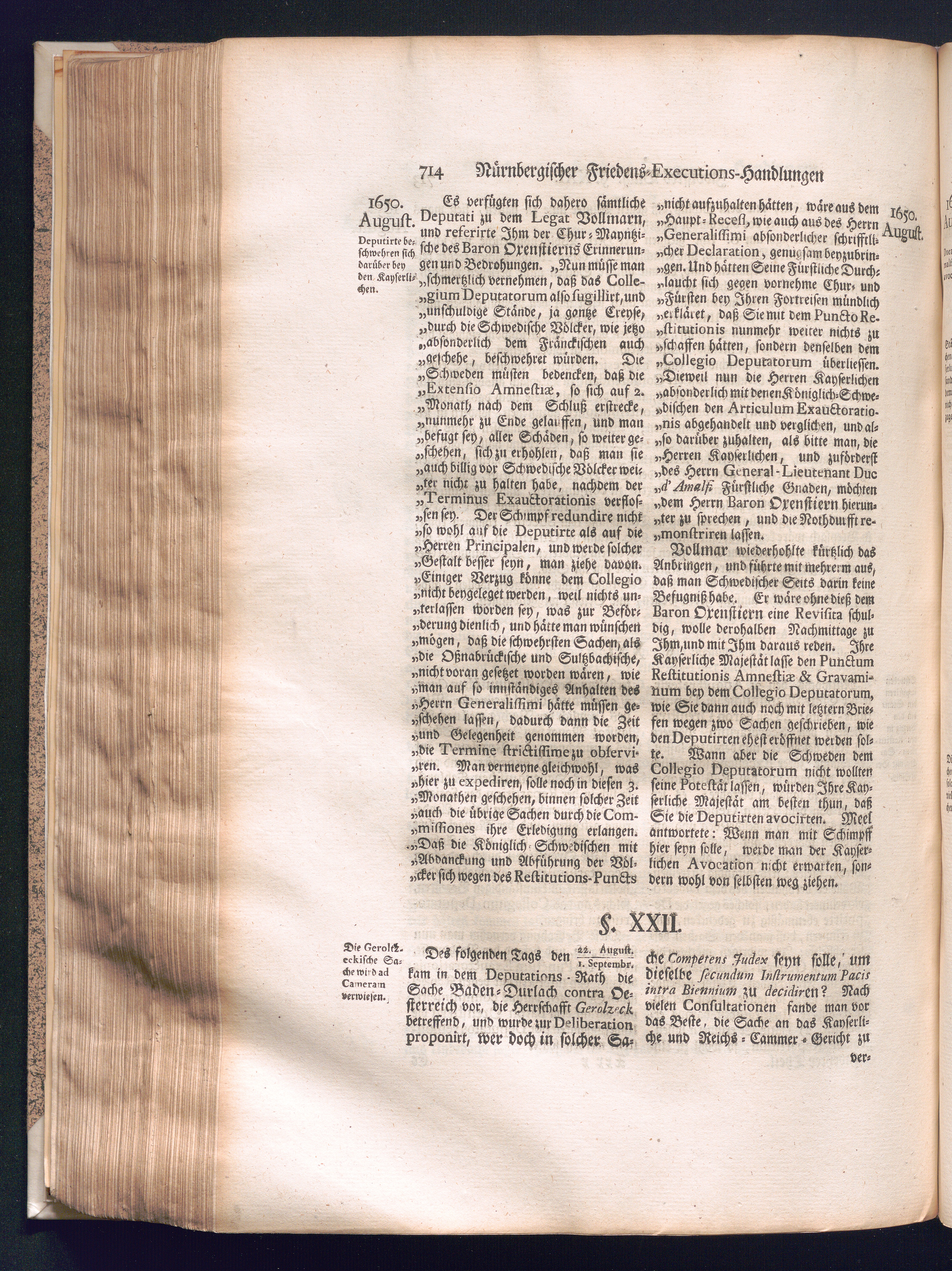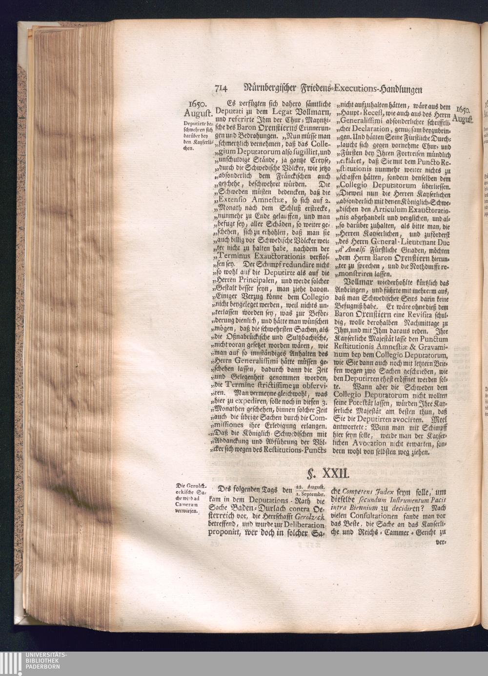 Zweyter und letzter Theil (1737) Worinnen enthalten, wie und welchergestalt die würckliche Vollziehung des Westphälischen Friedens, sowohl in puncto Exauctorationis Militæ und Evacuationis Locorum, als auch und vornehmlich in dem hochwichtigen puncto Restitutionis ex Capite Amnestiæ & Gravaminum, biß zum völligen Schluß des Congressus, Anno 1651, geschehen ist, in einer ausführlichen Historischen Erzehlung, mit beygefügten authentischen Urkunden, auch einem vollständigen Register