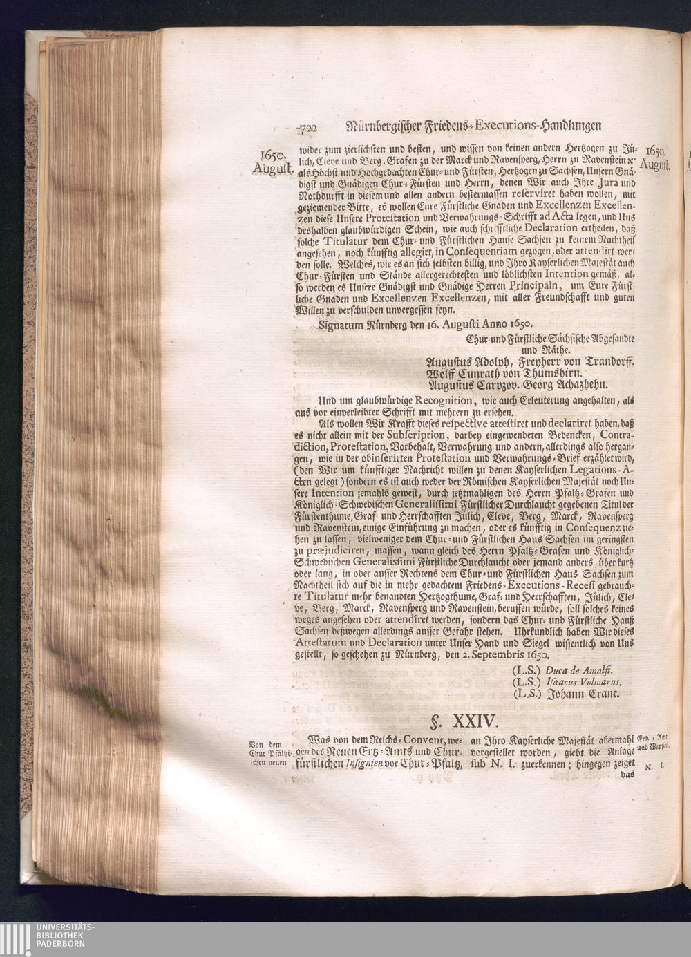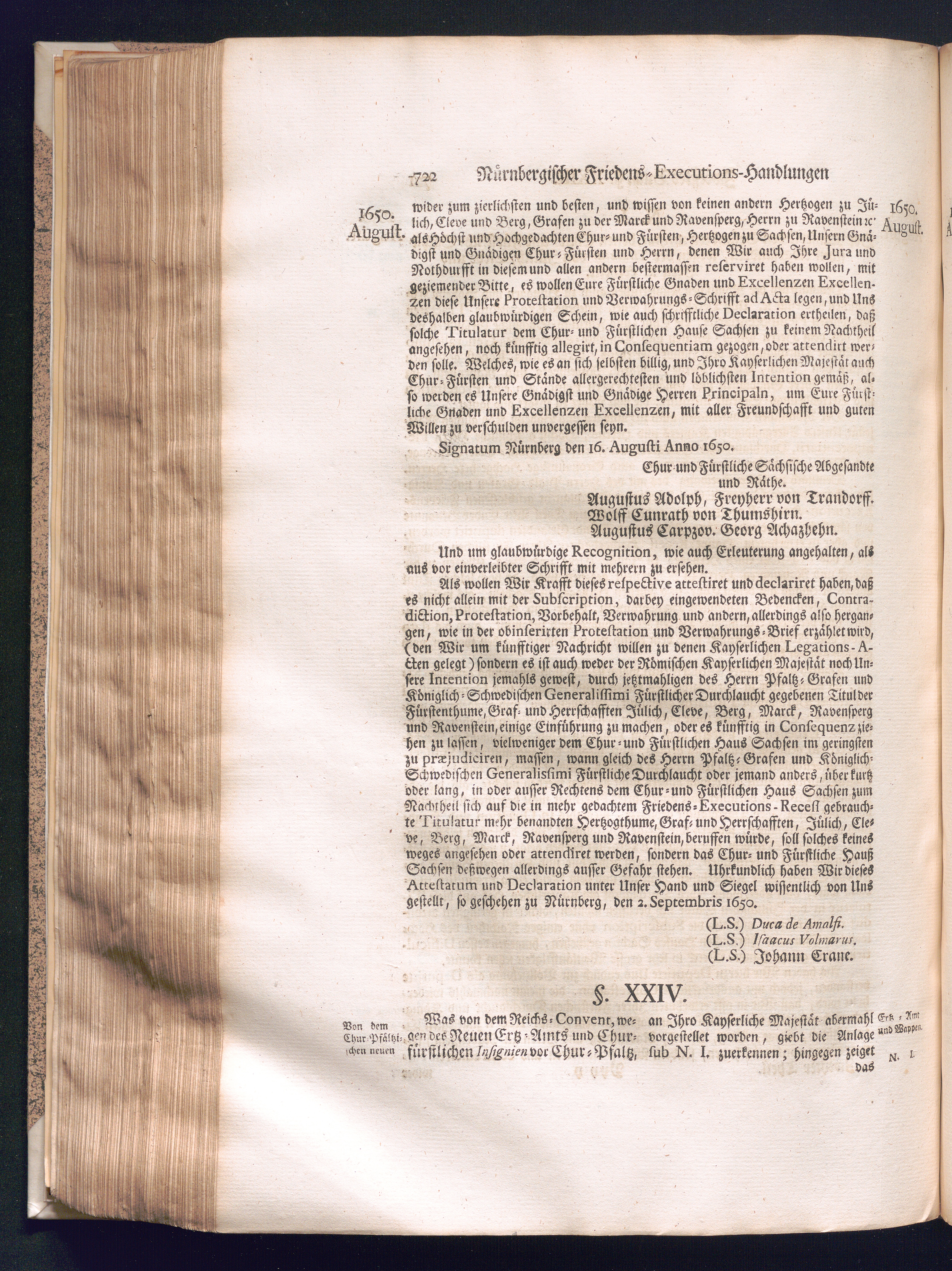 Zweyter und letzter Theil (1737) Worinnen enthalten, wie und welchergestalt die würckliche Vollziehung des Westphälischen Friedens, sowohl in puncto Exauctorationis Militæ und Evacuationis Locorum, als auch und vornehmlich in dem hochwichtigen puncto Restitutionis ex Capite Amnestiæ & Gravaminum, biß zum völligen Schluß des Congressus, Anno 1651, geschehen ist, in einer ausführlichen Historischen Erzehlung, mit beygefügten authentischen Urkunden, auch einem vollständigen Register