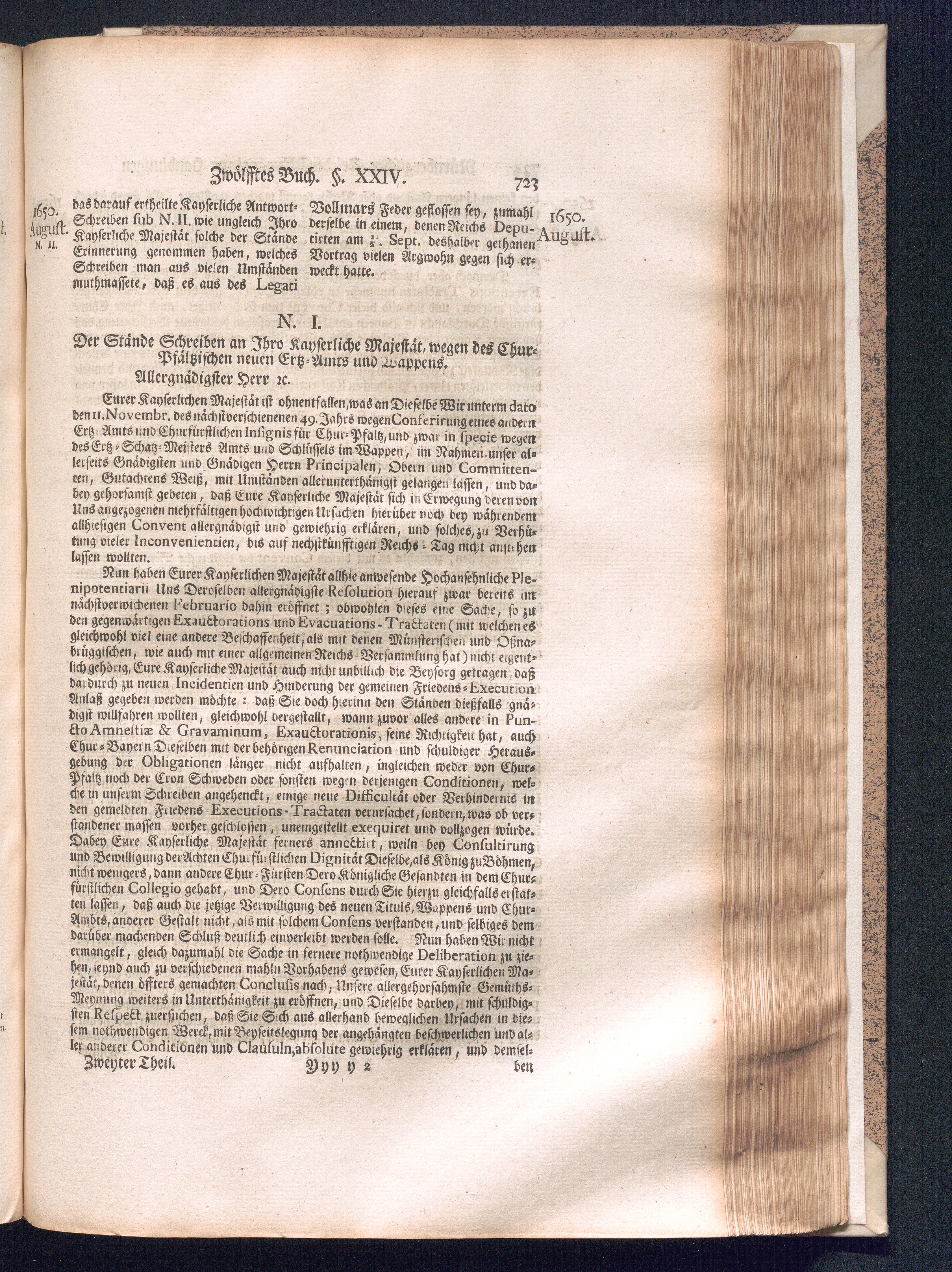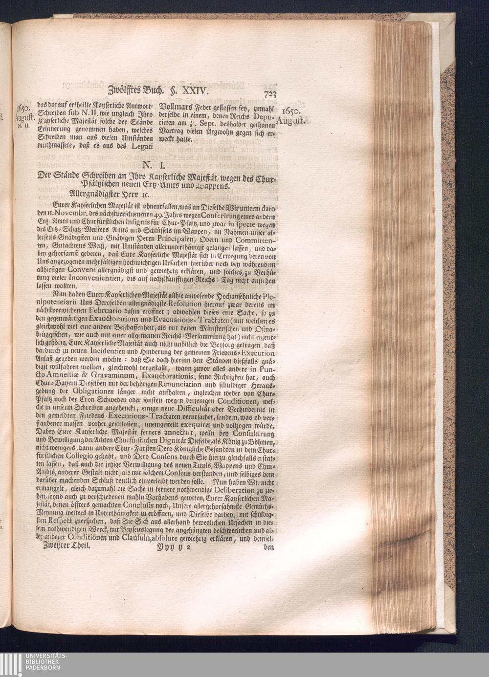 Zweyter und letzter Theil (1737) Worinnen enthalten, wie und welchergestalt die würckliche Vollziehung des Westphälischen Friedens, sowohl in puncto Exauctorationis Militæ und Evacuationis Locorum, als auch und vornehmlich in dem hochwichtigen puncto Restitutionis ex Capite Amnestiæ & Gravaminum, biß zum völligen Schluß des Congressus, Anno 1651, geschehen ist, in einer ausführlichen Historischen Erzehlung, mit beygefügten authentischen Urkunden, auch einem vollständigen Register