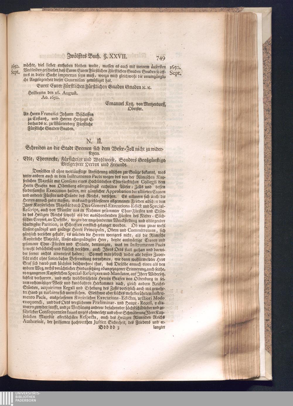 Zweyter und letzter Theil (1737) Worinnen enthalten, wie und welchergestalt die würckliche Vollziehung des Westphälischen Friedens, sowohl in puncto Exauctorationis Militæ und Evacuationis Locorum, als auch und vornehmlich in dem hochwichtigen puncto Restitutionis ex Capite Amnestiæ & Gravaminum, biß zum völligen Schluß des Congressus, Anno 1651, geschehen ist, in einer ausführlichen Historischen Erzehlung, mit beygefügten authentischen Urkunden, auch einem vollständigen Register