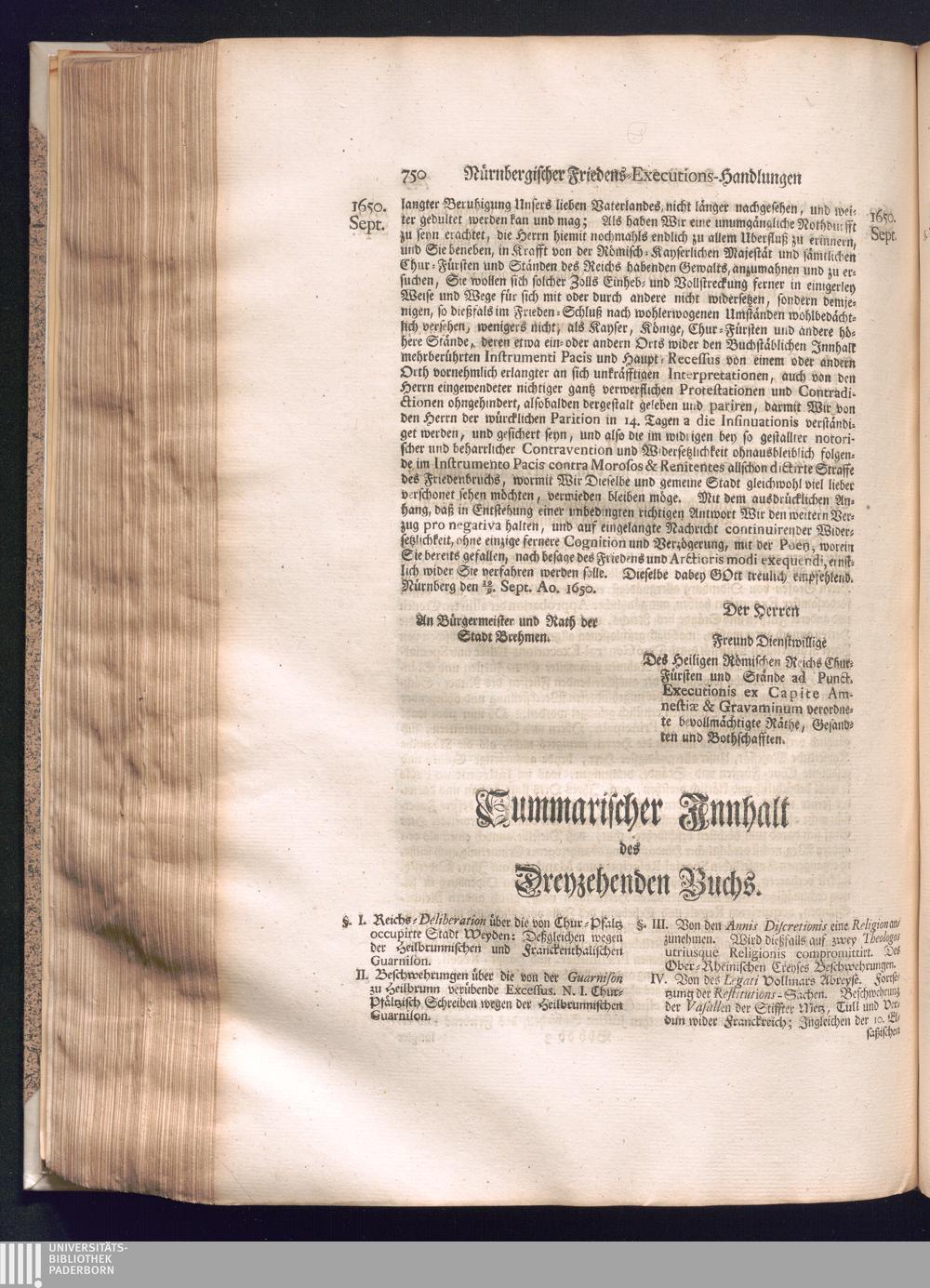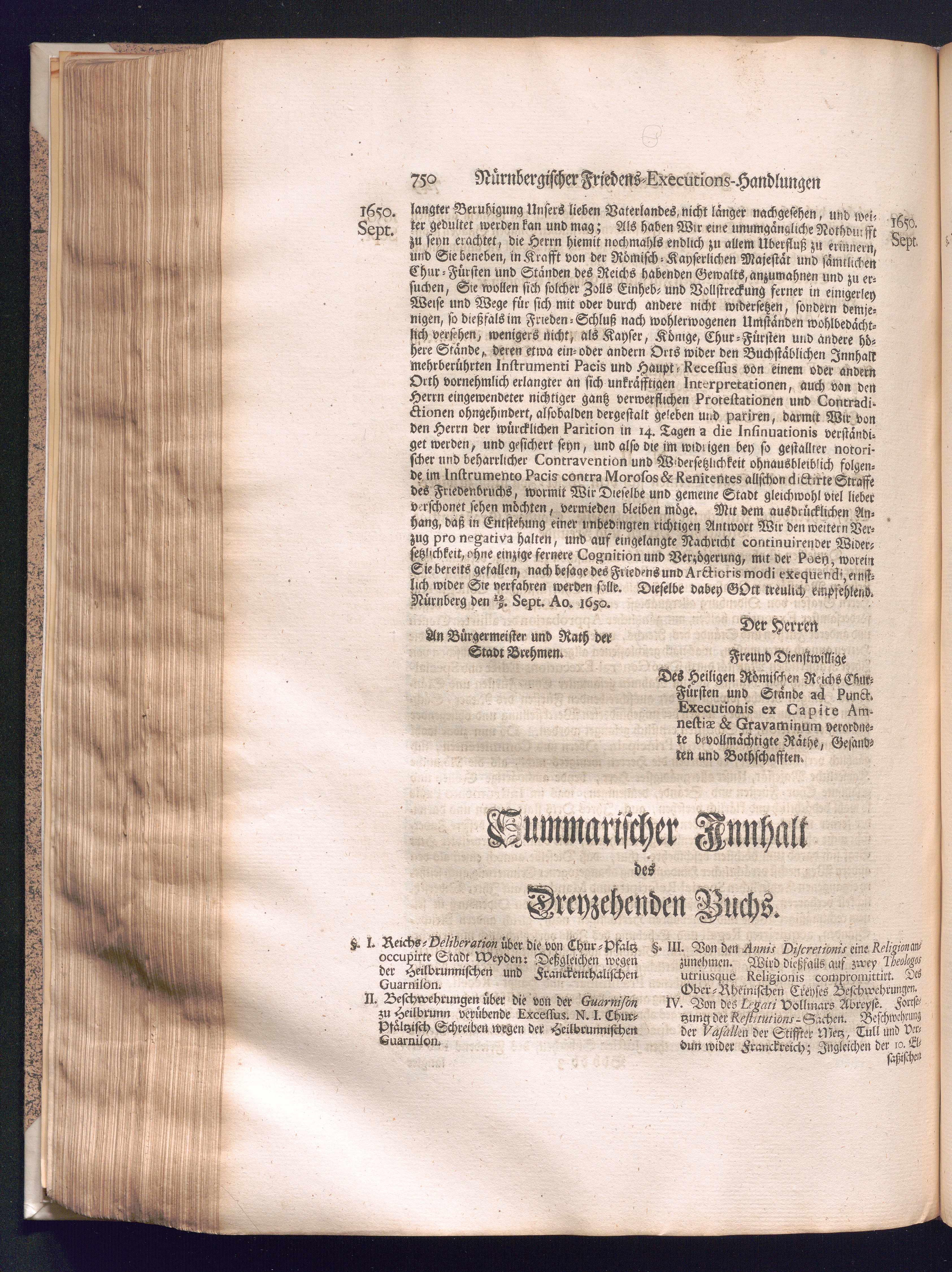 Zweyter und letzter Theil (1737) Worinnen enthalten, wie und welchergestalt die würckliche Vollziehung des Westphälischen Friedens, sowohl in puncto Exauctorationis Militæ und Evacuationis Locorum, als auch und vornehmlich in dem hochwichtigen puncto Restitutionis ex Capite Amnestiæ & Gravaminum, biß zum völligen Schluß des Congressus, Anno 1651, geschehen ist, in einer ausführlichen Historischen Erzehlung, mit beygefügten authentischen Urkunden, auch einem vollständigen Register