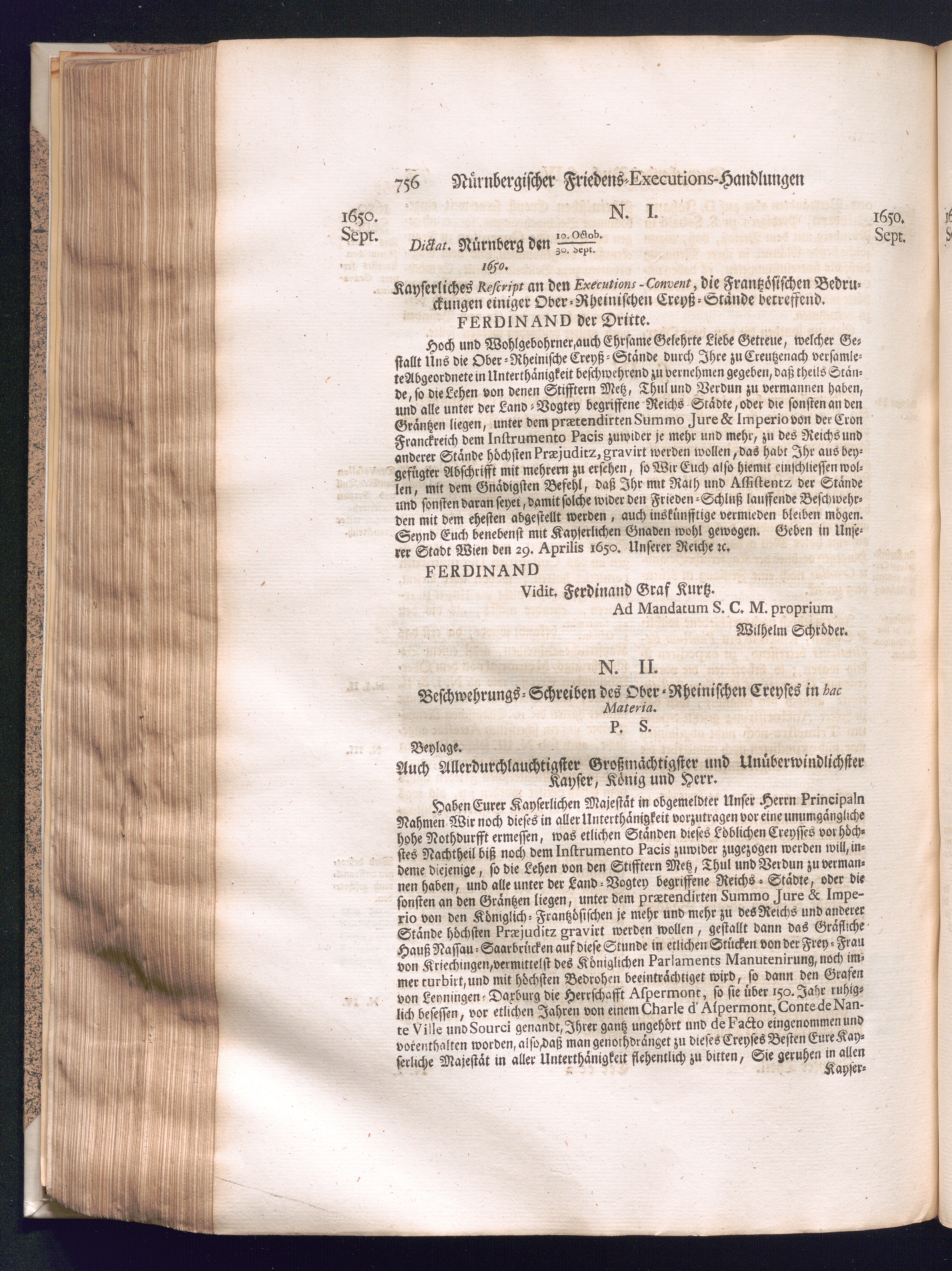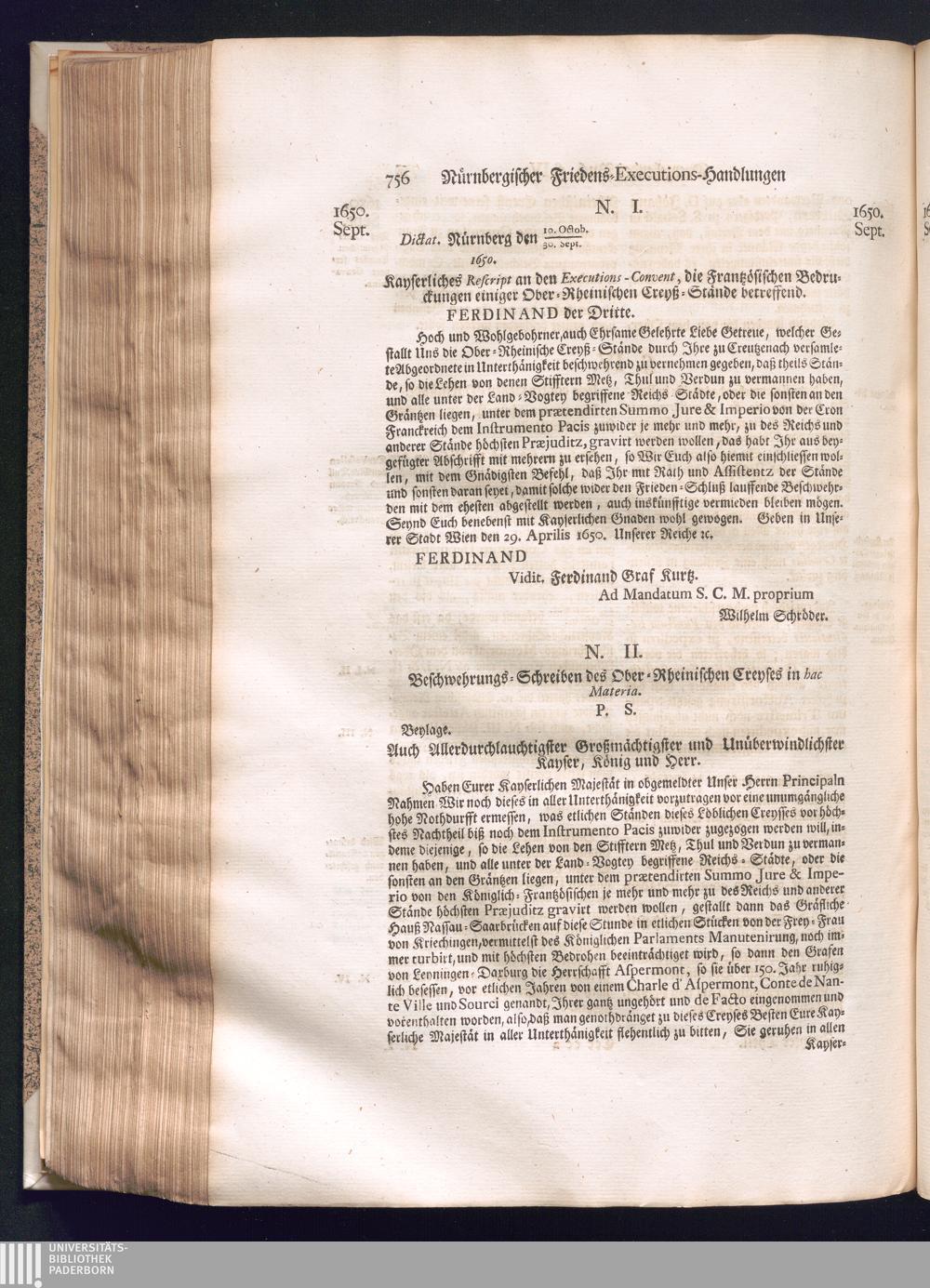Zweyter und letzter Theil (1737) Worinnen enthalten, wie und welchergestalt die würckliche Vollziehung des Westphälischen Friedens, sowohl in puncto Exauctorationis Militæ und Evacuationis Locorum, als auch und vornehmlich in dem hochwichtigen puncto Restitutionis ex Capite Amnestiæ & Gravaminum, biß zum völligen Schluß des Congressus, Anno 1651, geschehen ist, in einer ausführlichen Historischen Erzehlung, mit beygefügten authentischen Urkunden, auch einem vollständigen Register