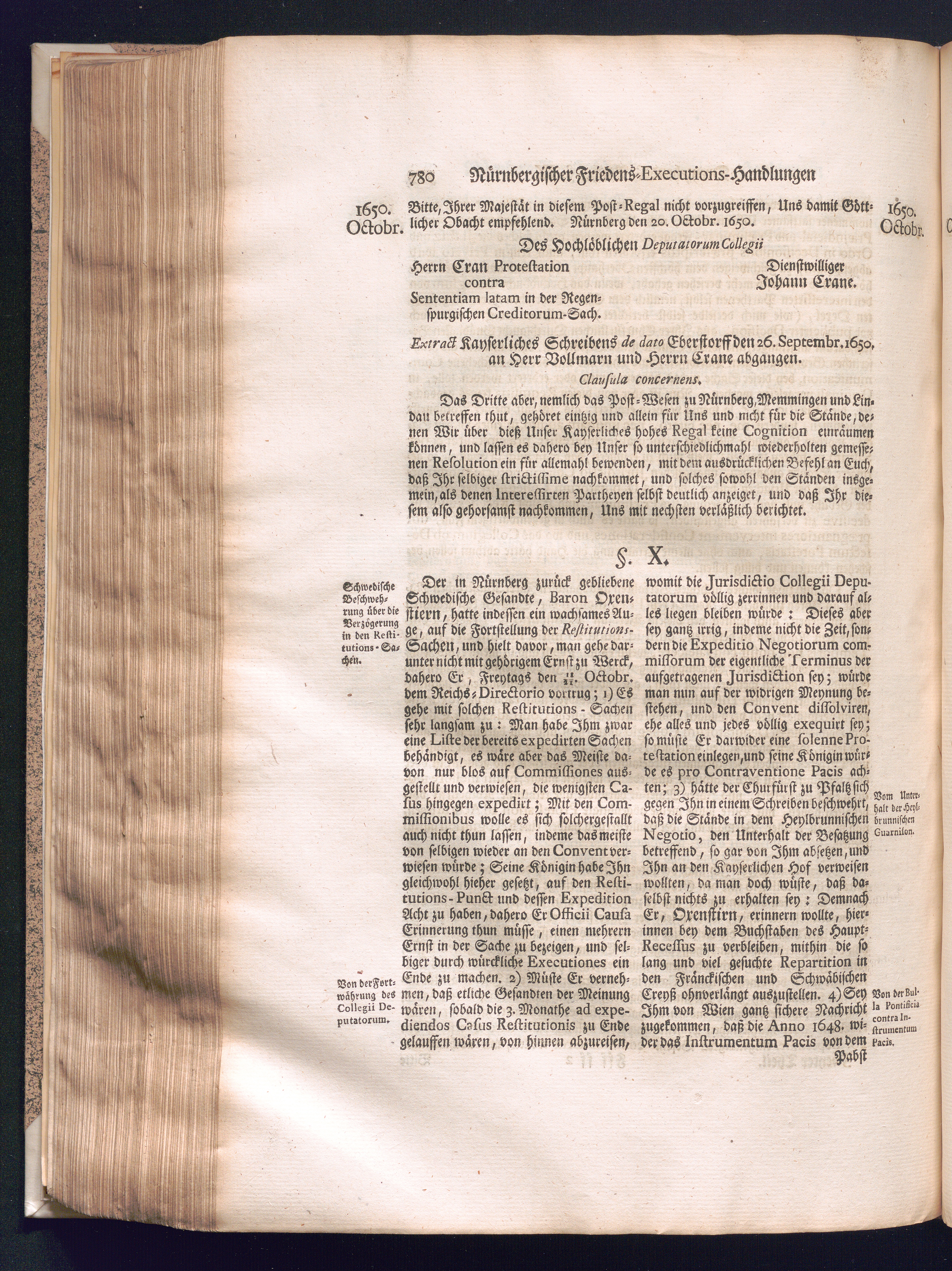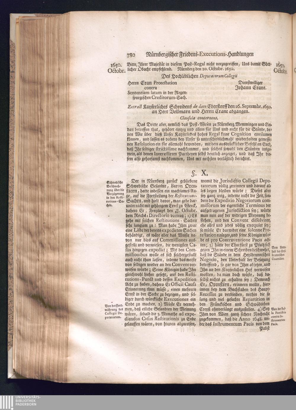 Zweyter und letzter Theil (1737) Worinnen enthalten, wie und welchergestalt die würckliche Vollziehung des Westphälischen Friedens, sowohl in puncto Exauctorationis Militæ und Evacuationis Locorum, als auch und vornehmlich in dem hochwichtigen puncto Restitutionis ex Capite Amnestiæ & Gravaminum, biß zum völligen Schluß des Congressus, Anno 1651, geschehen ist, in einer ausführlichen Historischen Erzehlung, mit beygefügten authentischen Urkunden, auch einem vollständigen Register
