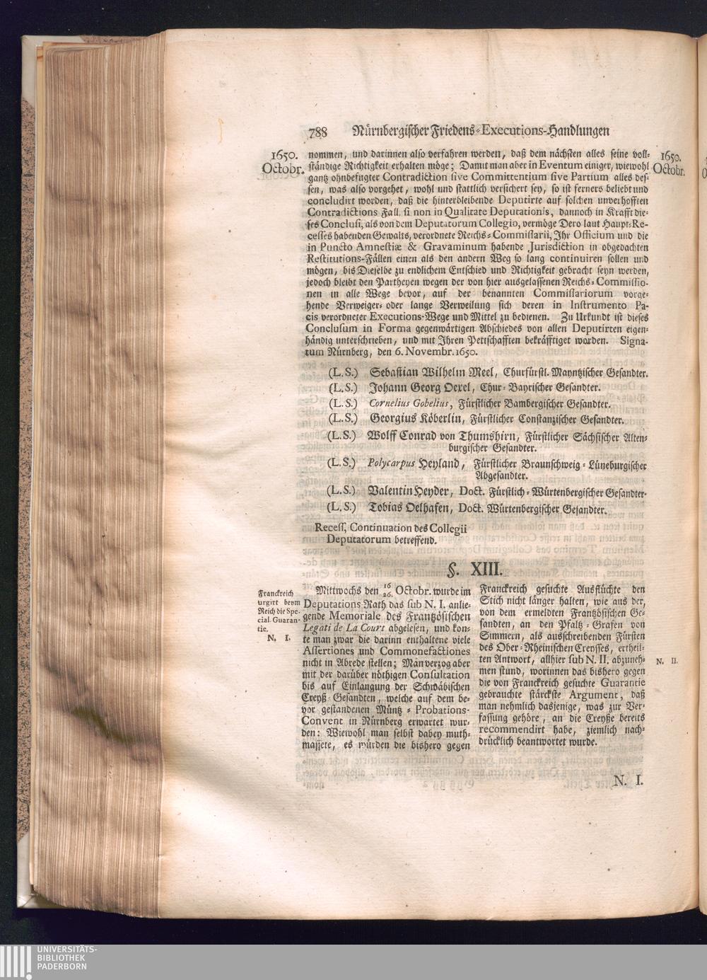 Zweyter und letzter Theil (1737) Worinnen enthalten, wie und welchergestalt die würckliche Vollziehung des Westphälischen Friedens, sowohl in puncto Exauctorationis Militæ und Evacuationis Locorum, als auch und vornehmlich in dem hochwichtigen puncto Restitutionis ex Capite Amnestiæ & Gravaminum, biß zum völligen Schluß des Congressus, Anno 1651, geschehen ist, in einer ausführlichen Historischen Erzehlung, mit beygefügten authentischen Urkunden, auch einem vollständigen Register