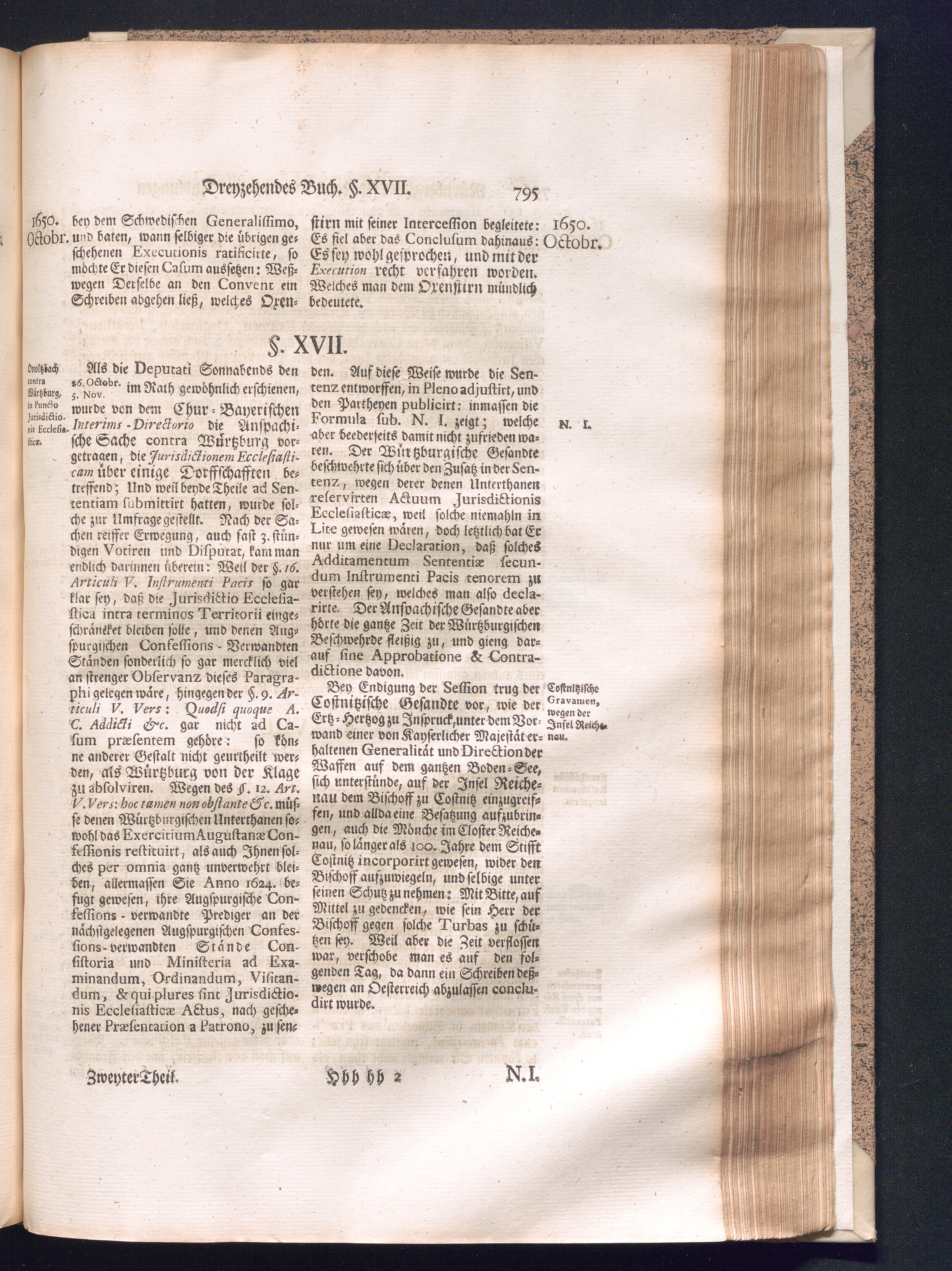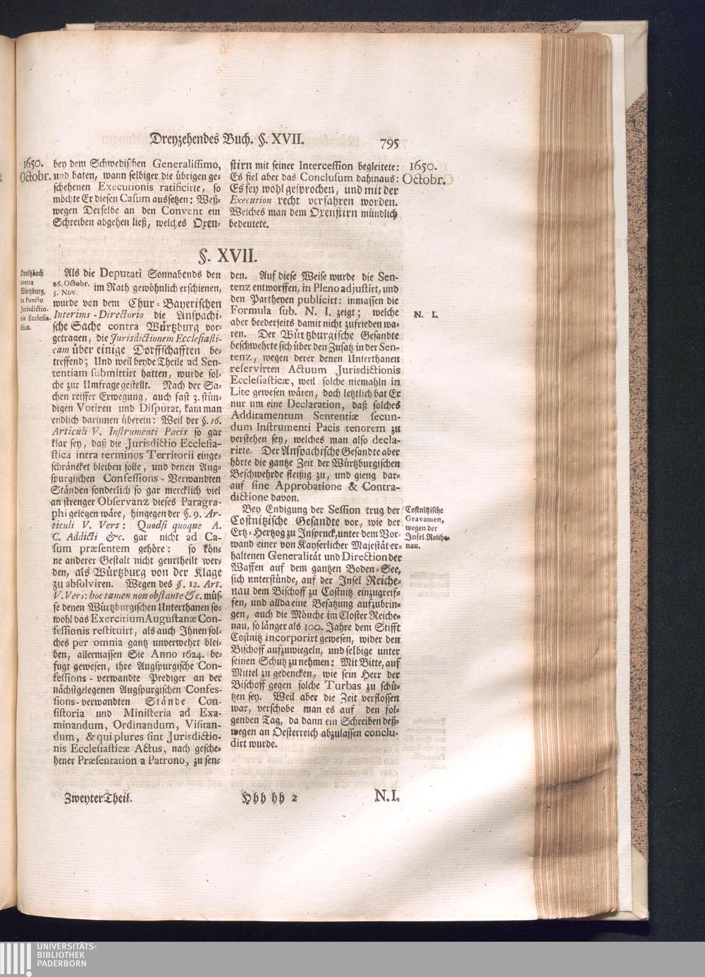 Zweyter und letzter Theil (1737) Worinnen enthalten, wie und welchergestalt die würckliche Vollziehung des Westphälischen Friedens, sowohl in puncto Exauctorationis Militæ und Evacuationis Locorum, als auch und vornehmlich in dem hochwichtigen puncto Restitutionis ex Capite Amnestiæ & Gravaminum, biß zum völligen Schluß des Congressus, Anno 1651, geschehen ist, in einer ausführlichen Historischen Erzehlung, mit beygefügten authentischen Urkunden, auch einem vollständigen Register