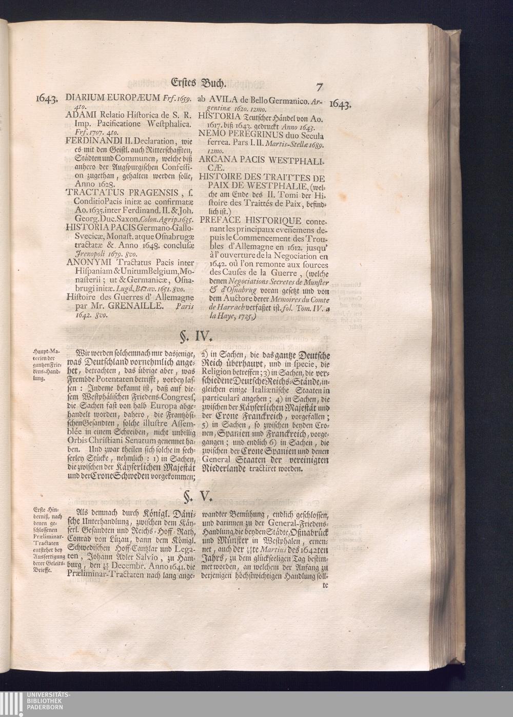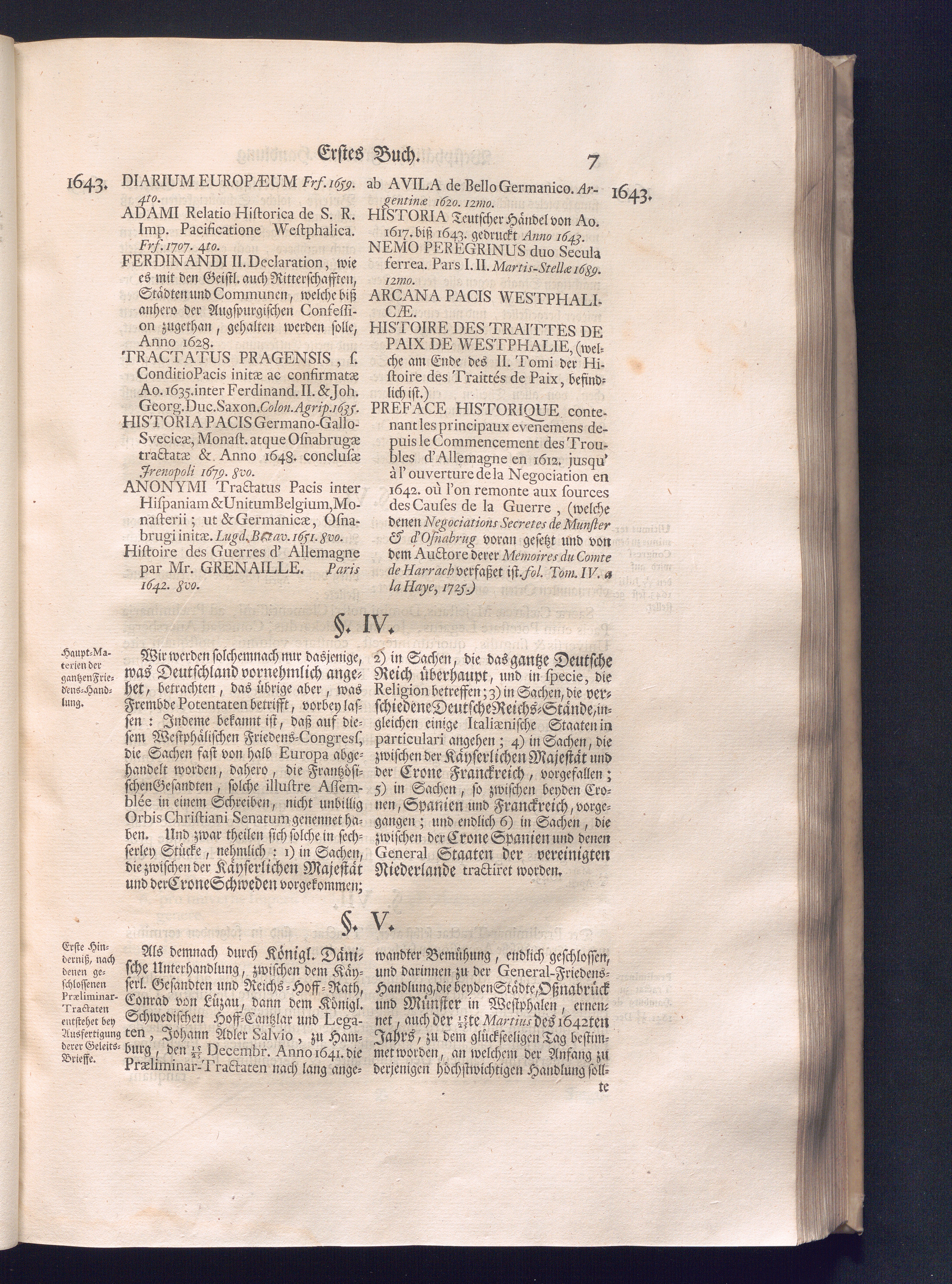 Erster Theil (1734) Worinnen enthalten, was vom Jahr 1643. biß in den Monath October Anno 1645. zwischen Jhro Römisch-Käyserlichen Majestät, dann den Beyden Cronen Franckreich und Schweden, ingleichen des Heiligen Römischen Reichs Chur-Fürsten, Fürsten und Ständen, zu Oßnabrück und Münster gehandelt worden