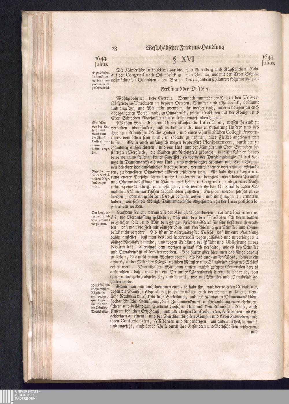Erster Theil (1734) Worinnen enthalten, was vom Jahr 1643. biß in den Monath October Anno 1645. zwischen Jhro Römisch-Käyserlichen Majestät, dann den Beyden Cronen Franckreich und Schweden, ingleichen des Heiligen Römischen Reichs Chur-Fürsten, Fürsten und Ständen, zu Oßnabrück und Münster gehandelt worden