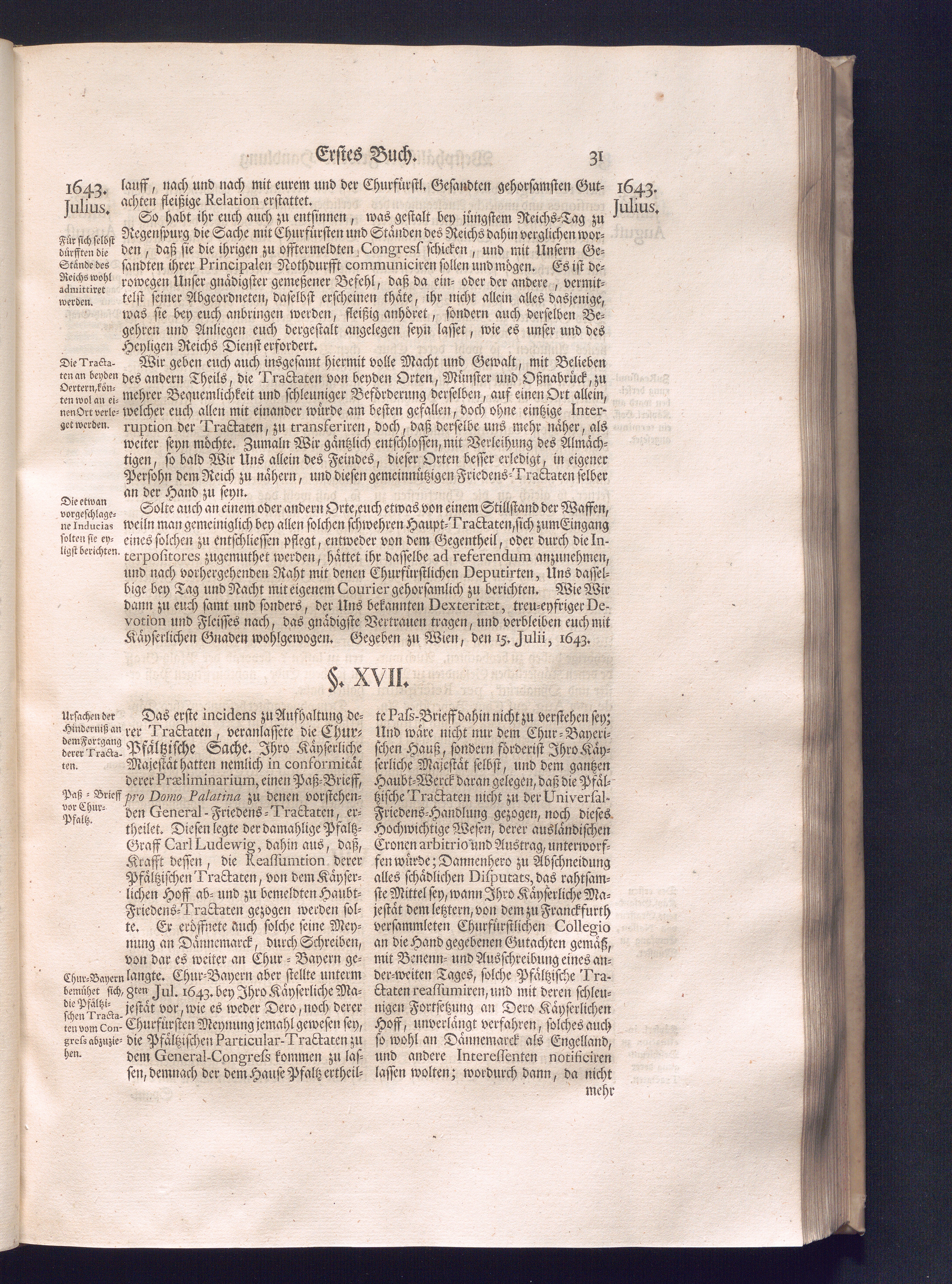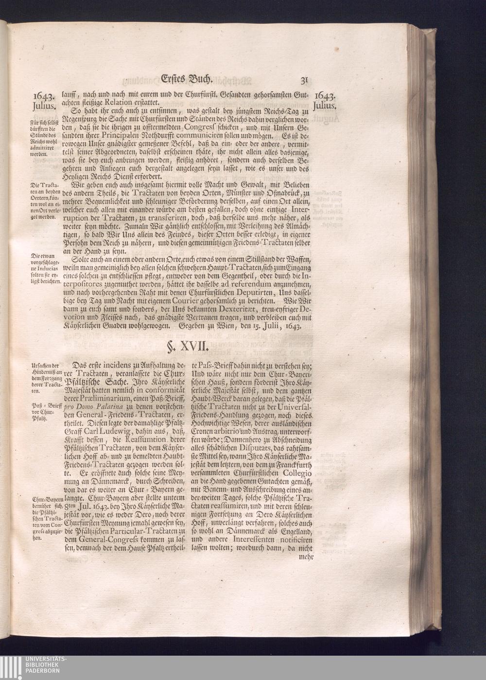 Erster Theil (1734) Worinnen enthalten, was vom Jahr 1643. biß in den Monath October Anno 1645. zwischen Jhro Römisch-Käyserlichen Majestät, dann den Beyden Cronen Franckreich und Schweden, ingleichen des Heiligen Römischen Reichs Chur-Fürsten, Fürsten und Ständen, zu Oßnabrück und Münster gehandelt worden