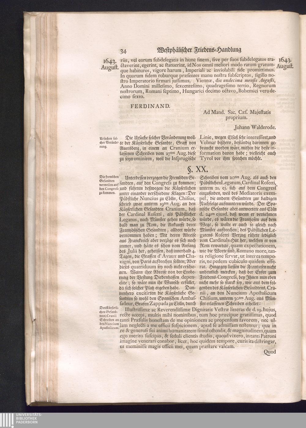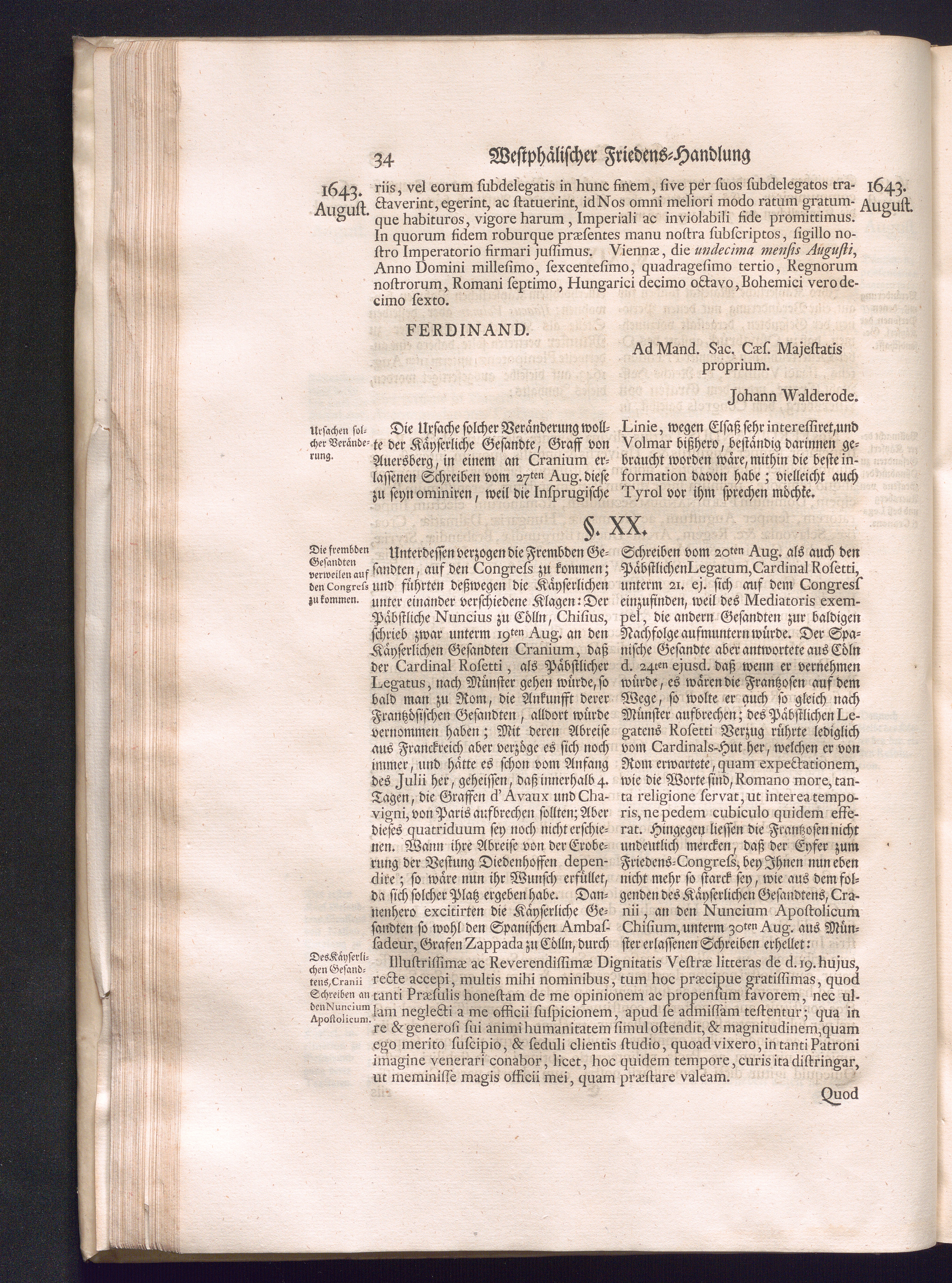 Erster Theil (1734) Worinnen enthalten, was vom Jahr 1643. biß in den Monath October Anno 1645. zwischen Jhro Römisch-Käyserlichen Majestät, dann den Beyden Cronen Franckreich und Schweden, ingleichen des Heiligen Römischen Reichs Chur-Fürsten, Fürsten und Ständen, zu Oßnabrück und Münster gehandelt worden