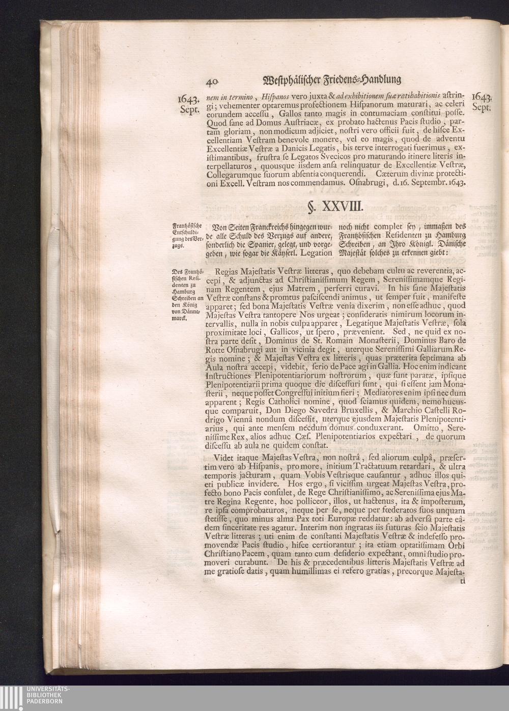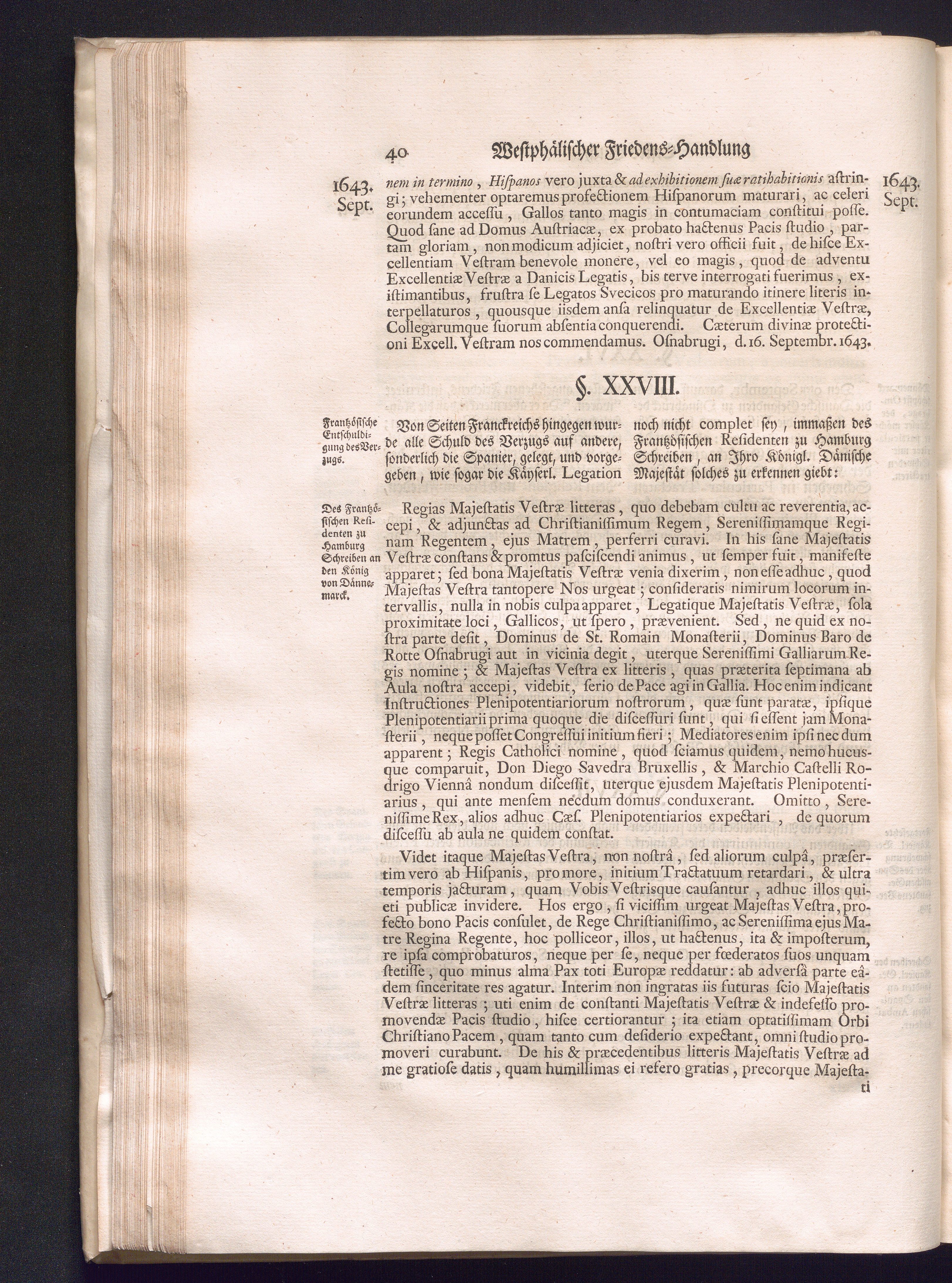 Erster Theil (1734) Worinnen enthalten, was vom Jahr 1643. biß in den Monath October Anno 1645. zwischen Jhro Römisch-Käyserlichen Majestät, dann den Beyden Cronen Franckreich und Schweden, ingleichen des Heiligen Römischen Reichs Chur-Fürsten, Fürsten und Ständen, zu Oßnabrück und Münster gehandelt worden
