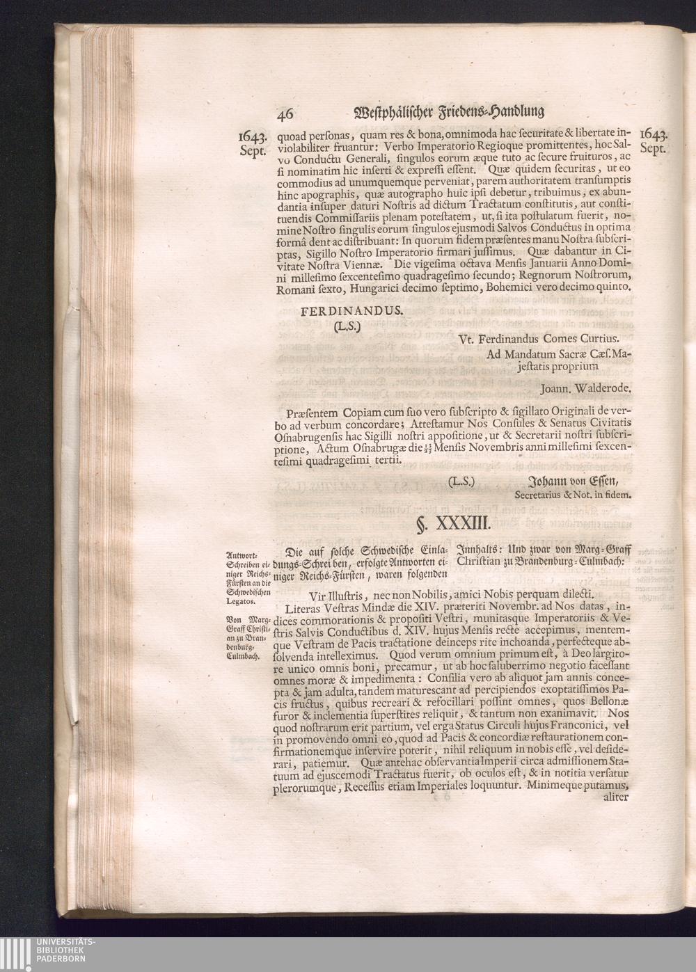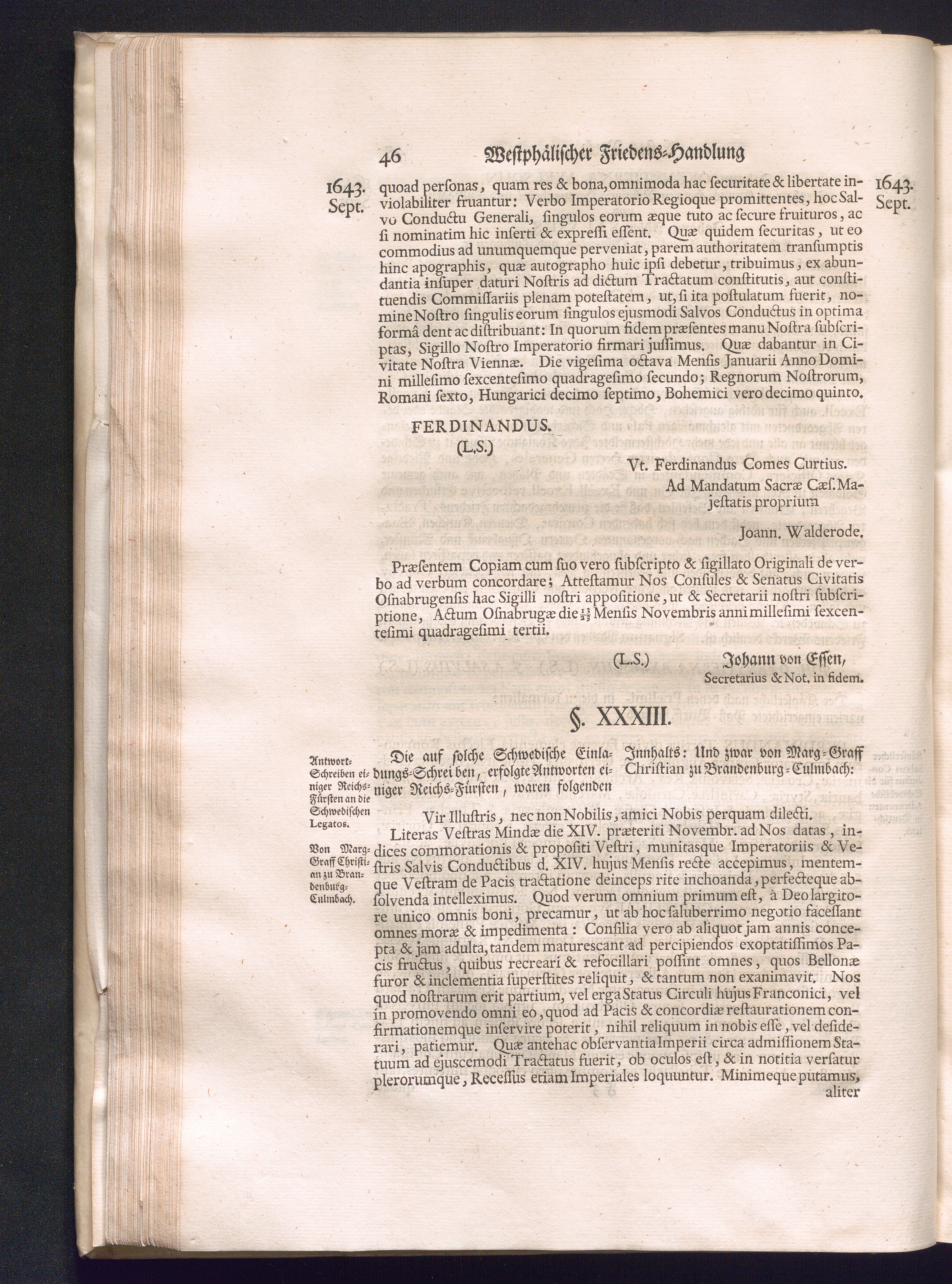 Erster Theil (1734) Worinnen enthalten, was vom Jahr 1643. biß in den Monath October Anno 1645. zwischen Jhro Römisch-Käyserlichen Majestät, dann den Beyden Cronen Franckreich und Schweden, ingleichen des Heiligen Römischen Reichs Chur-Fürsten, Fürsten und Ständen, zu Oßnabrück und Münster gehandelt worden
