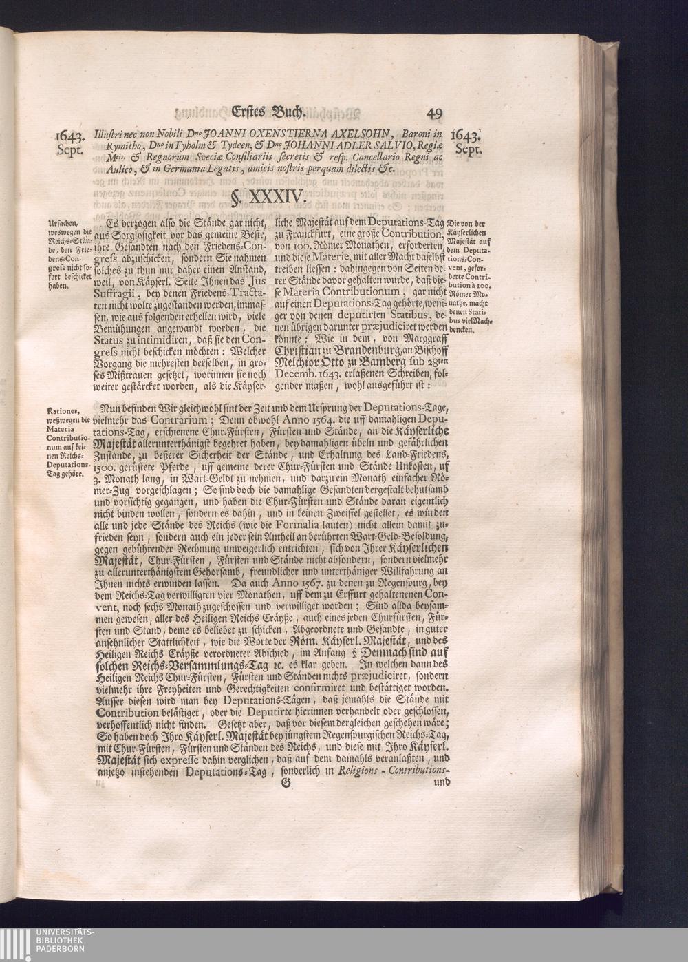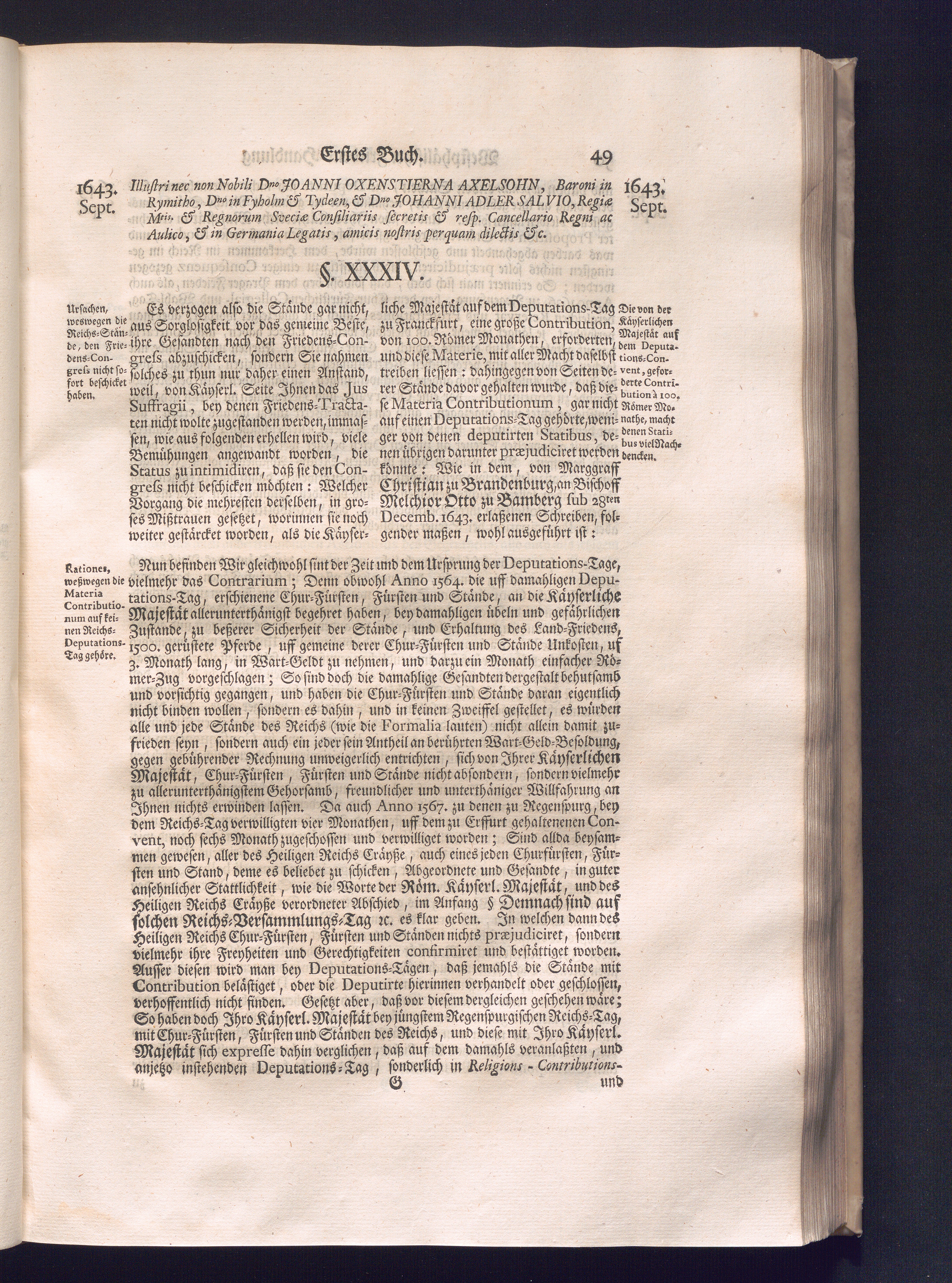 Erster Theil (1734) Worinnen enthalten, was vom Jahr 1643. biß in den Monath October Anno 1645. zwischen Jhro Römisch-Käyserlichen Majestät, dann den Beyden Cronen Franckreich und Schweden, ingleichen des Heiligen Römischen Reichs Chur-Fürsten, Fürsten und Ständen, zu Oßnabrück und Münster gehandelt worden