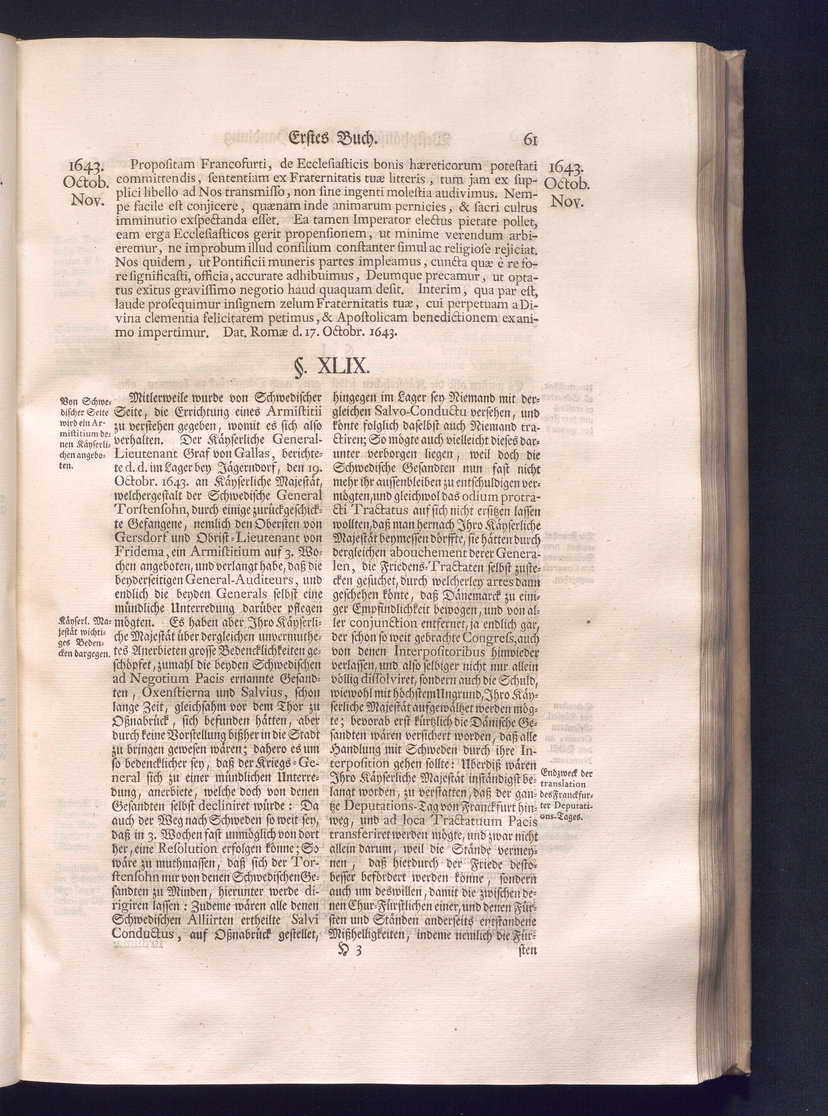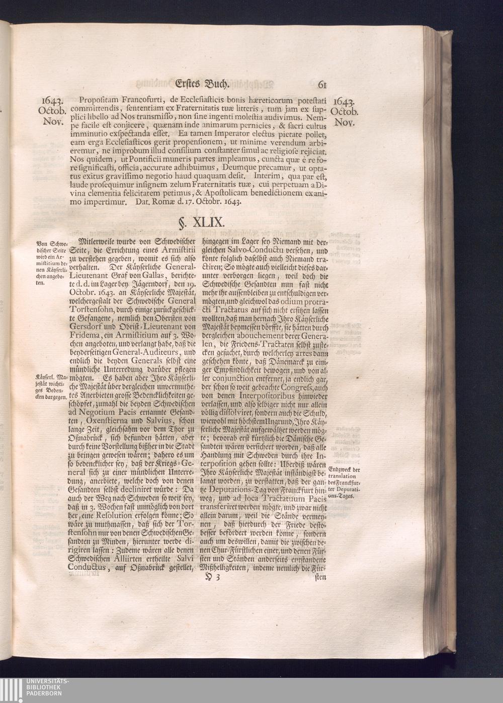 Erster Theil (1734) Worinnen enthalten, was vom Jahr 1643. biß in den Monath October Anno 1645. zwischen Jhro Römisch-Käyserlichen Majestät, dann den Beyden Cronen Franckreich und Schweden, ingleichen des Heiligen Römischen Reichs Chur-Fürsten, Fürsten und Ständen, zu Oßnabrück und Münster gehandelt worden