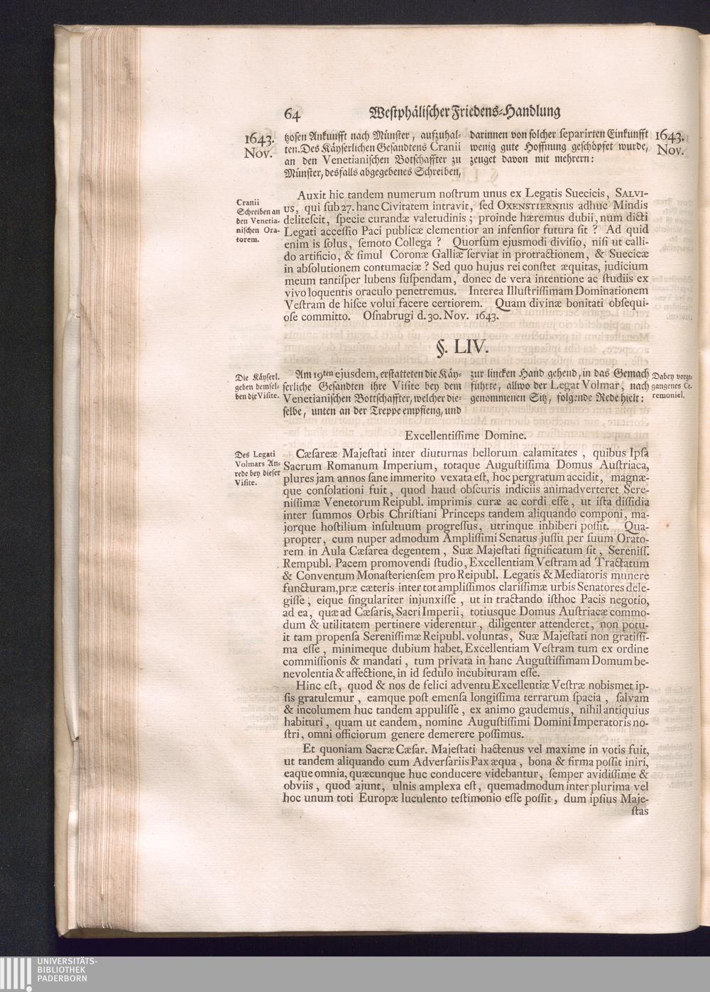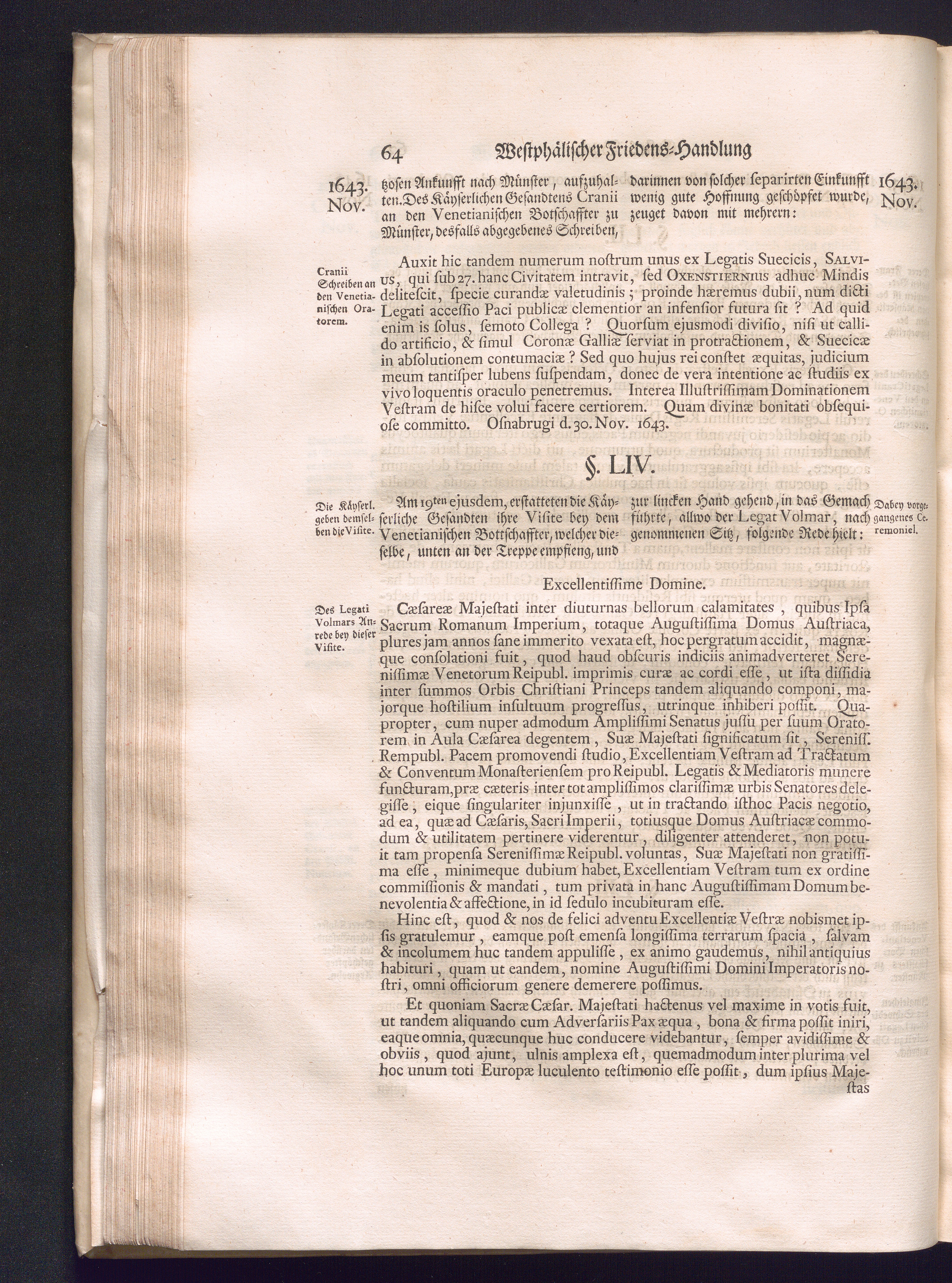 Erster Theil (1734) Worinnen enthalten, was vom Jahr 1643. biß in den Monath October Anno 1645. zwischen Jhro Römisch-Käyserlichen Majestät, dann den Beyden Cronen Franckreich und Schweden, ingleichen des Heiligen Römischen Reichs Chur-Fürsten, Fürsten und Ständen, zu Oßnabrück und Münster gehandelt worden