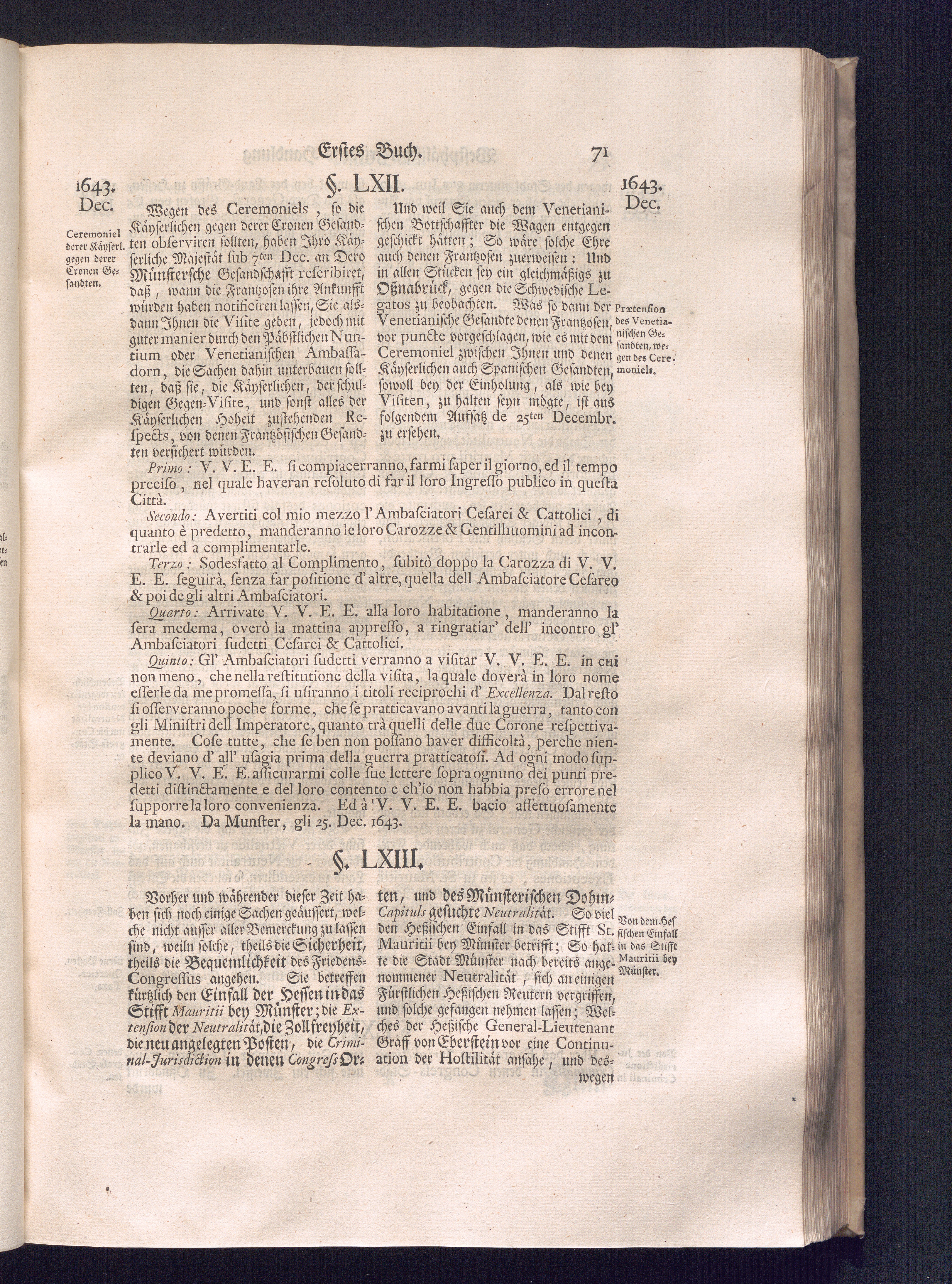 Erster Theil (1734) Worinnen enthalten, was vom Jahr 1643. biß in den Monath October Anno 1645. zwischen Jhro Römisch-Käyserlichen Majestät, dann den Beyden Cronen Franckreich und Schweden, ingleichen des Heiligen Römischen Reichs Chur-Fürsten, Fürsten und Ständen, zu Oßnabrück und Münster gehandelt worden