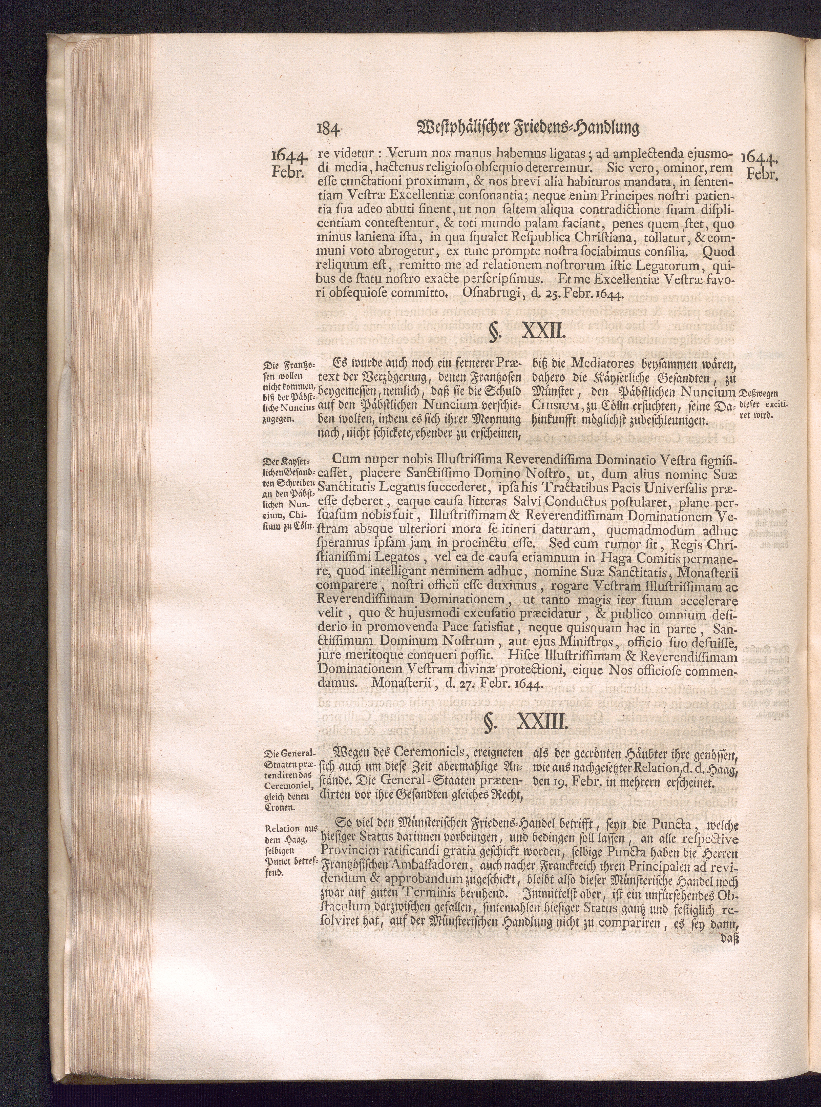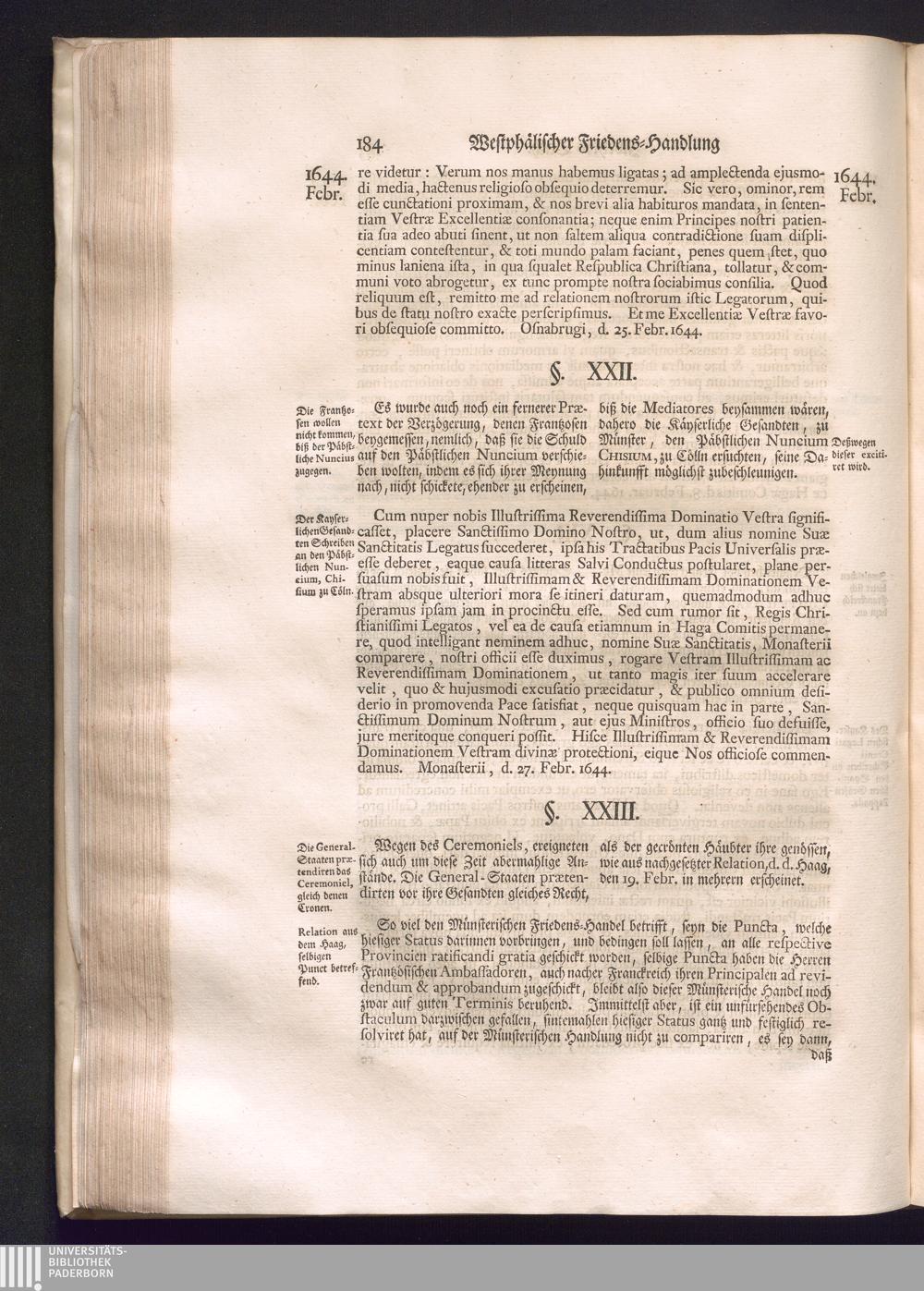 Erster Theil (1734) Worinnen enthalten, was vom Jahr 1643. biß in den Monath October Anno 1645. zwischen Jhro Römisch-Käyserlichen Majestät, dann den Beyden Cronen Franckreich und Schweden, ingleichen des Heiligen Römischen Reichs Chur-Fürsten, Fürsten und Ständen, zu Oßnabrück und Münster gehandelt worden