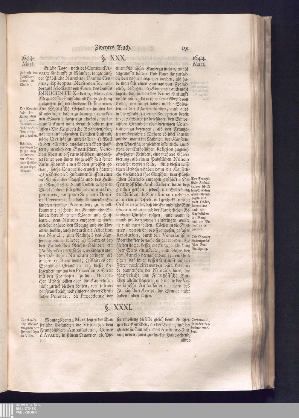 Erster Theil (1734) Worinnen enthalten, was vom Jahr 1643. biß in den Monath October Anno 1645. zwischen Jhro Römisch-Käyserlichen Majestät, dann den Beyden Cronen Franckreich und Schweden, ingleichen des Heiligen Römischen Reichs Chur-Fürsten, Fürsten und Ständen, zu Oßnabrück und Münster gehandelt worden