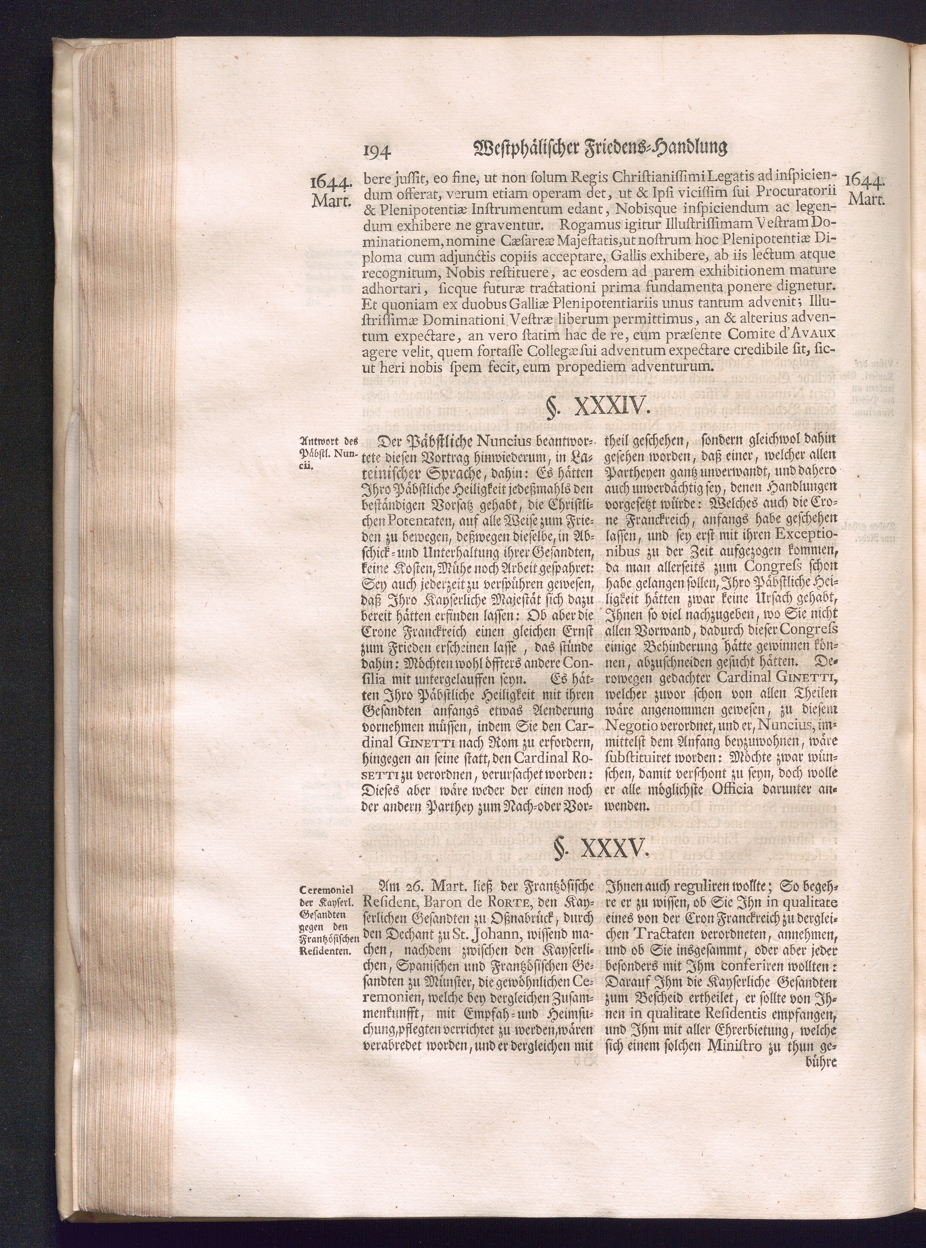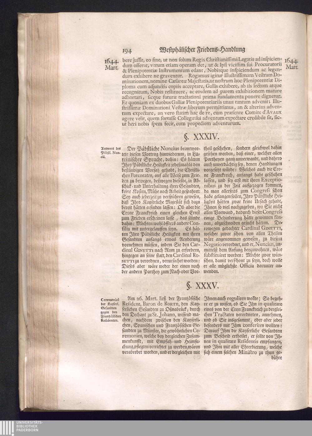 Erster Theil (1734) Worinnen enthalten, was vom Jahr 1643. biß in den Monath October Anno 1645. zwischen Jhro Römisch-Käyserlichen Majestät, dann den Beyden Cronen Franckreich und Schweden, ingleichen des Heiligen Römischen Reichs Chur-Fürsten, Fürsten und Ständen, zu Oßnabrück und Münster gehandelt worden
