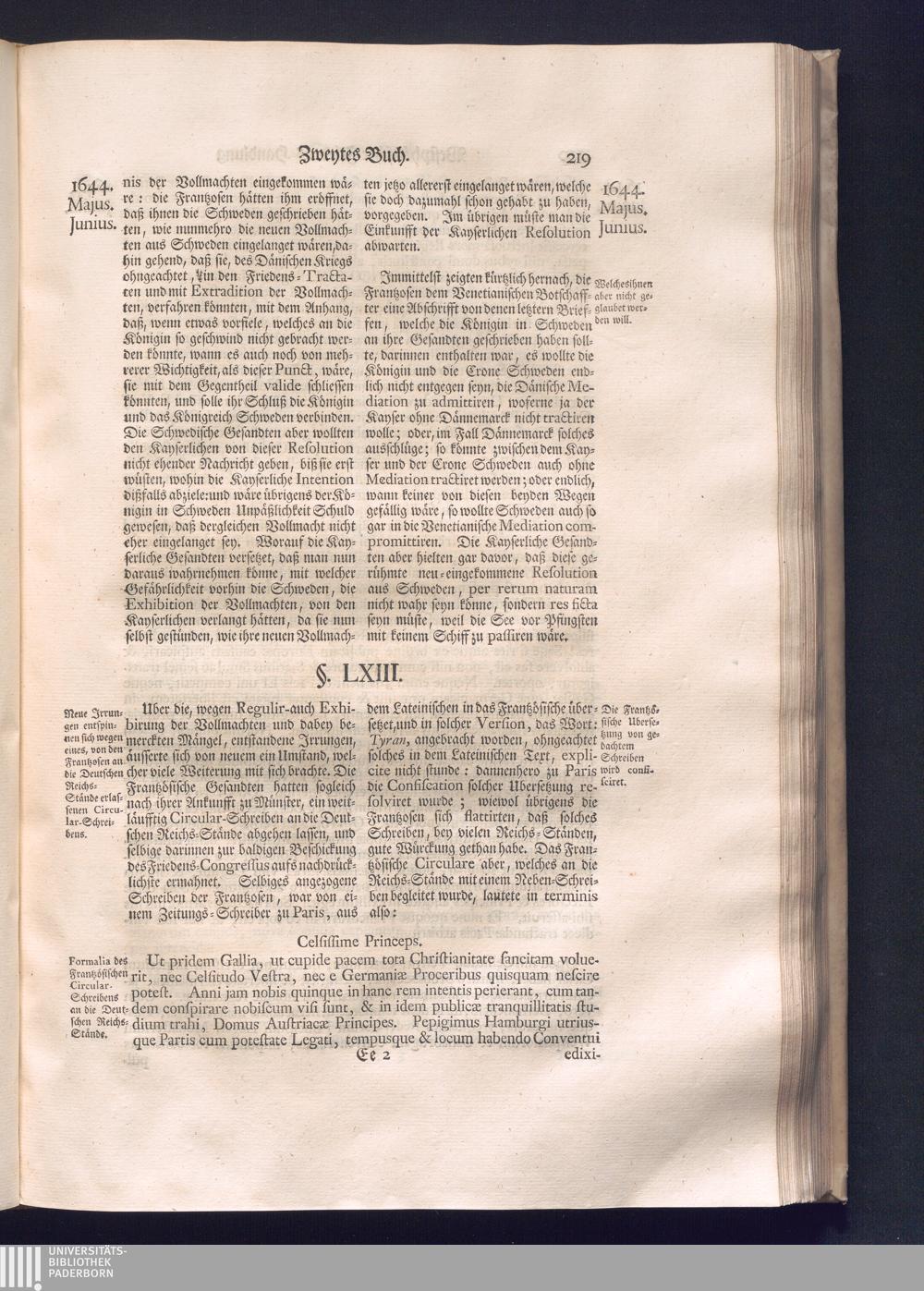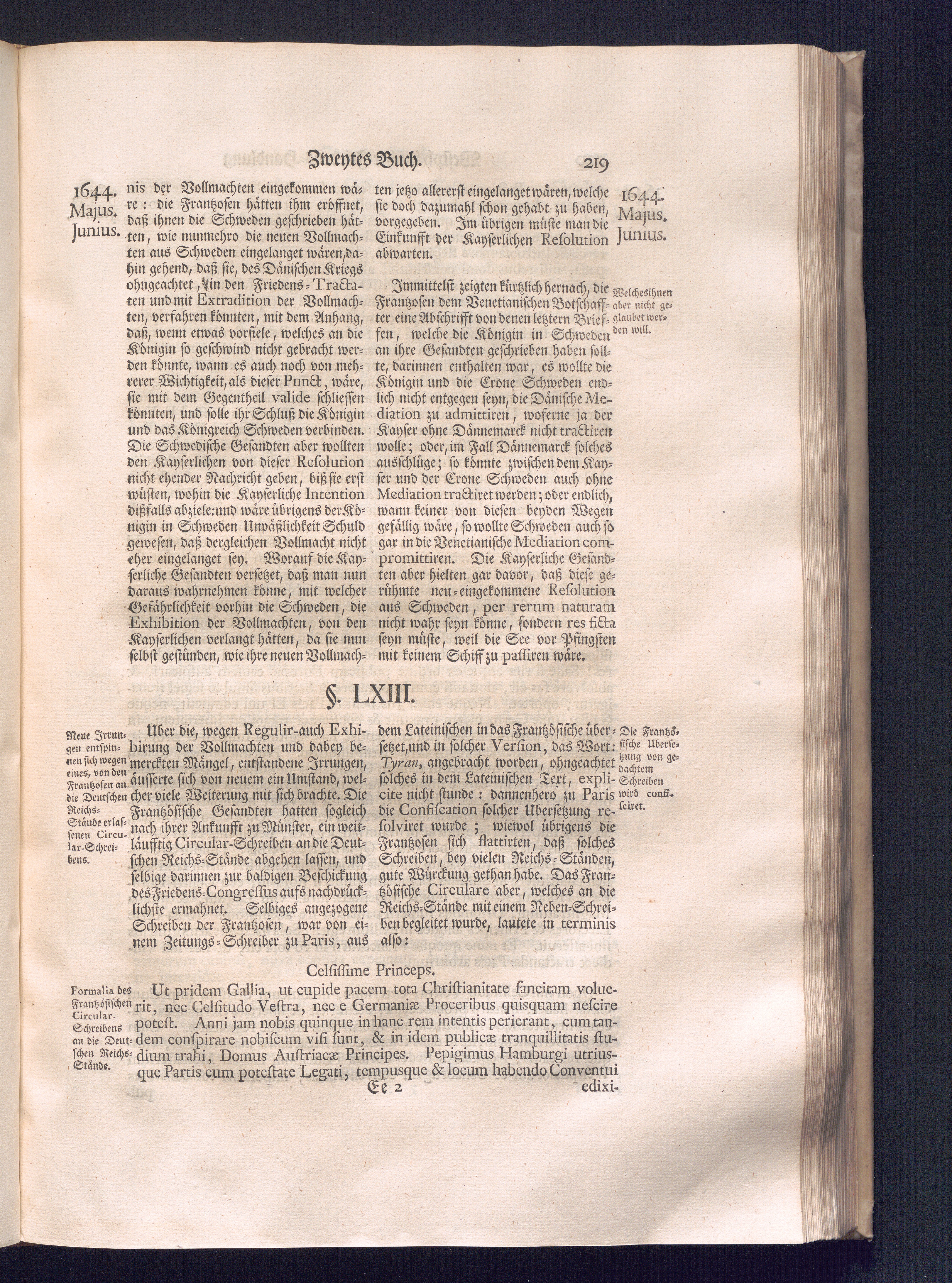 Erster Theil (1734) Worinnen enthalten, was vom Jahr 1643. biß in den Monath October Anno 1645. zwischen Jhro Römisch-Käyserlichen Majestät, dann den Beyden Cronen Franckreich und Schweden, ingleichen des Heiligen Römischen Reichs Chur-Fürsten, Fürsten und Ständen, zu Oßnabrück und Münster gehandelt worden