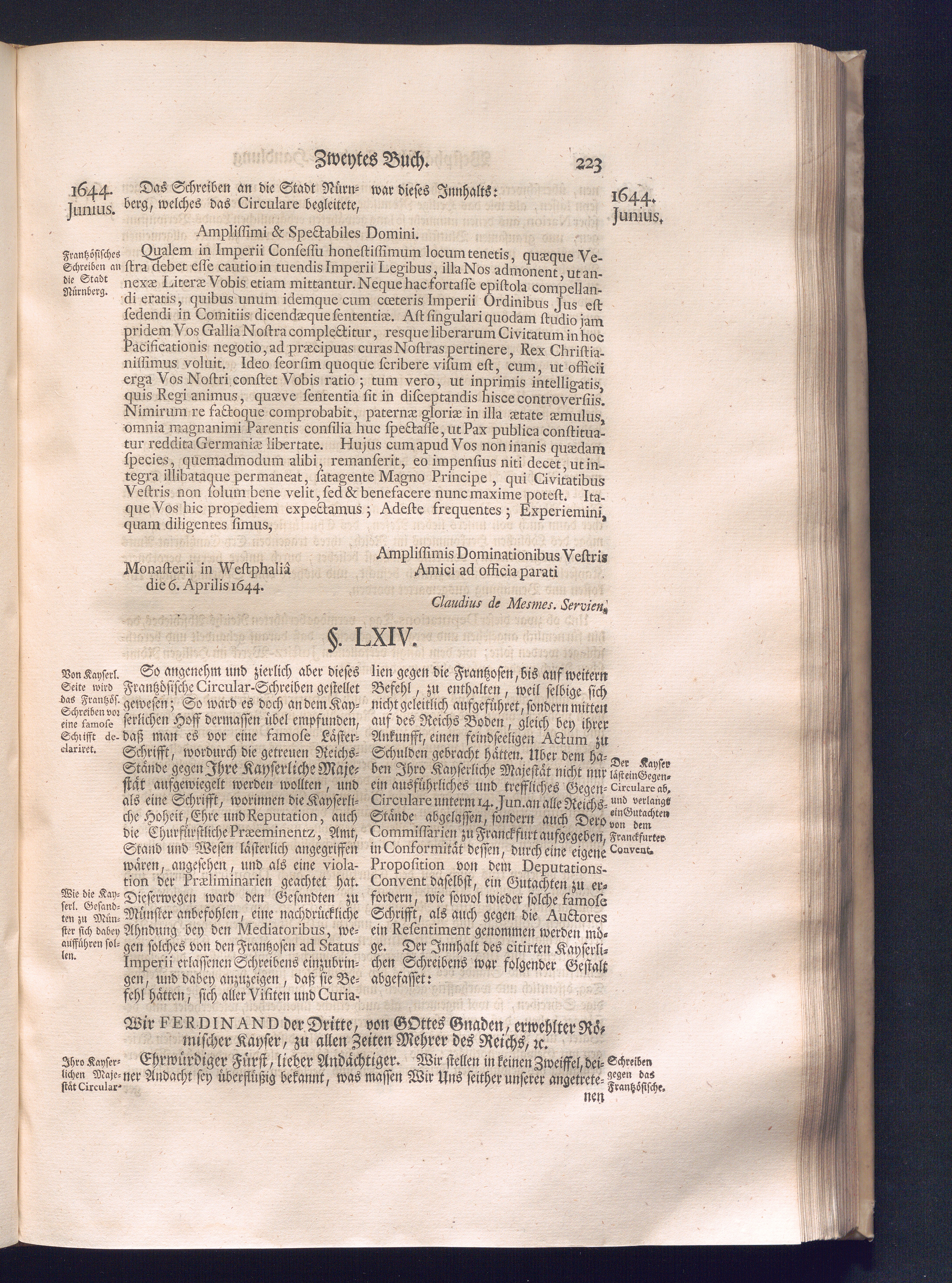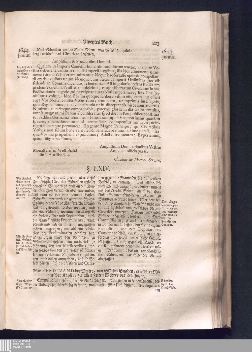 Erster Theil (1734) Worinnen enthalten, was vom Jahr 1643. biß in den Monath October Anno 1645. zwischen Jhro Römisch-Käyserlichen Majestät, dann den Beyden Cronen Franckreich und Schweden, ingleichen des Heiligen Römischen Reichs Chur-Fürsten, Fürsten und Ständen, zu Oßnabrück und Münster gehandelt worden